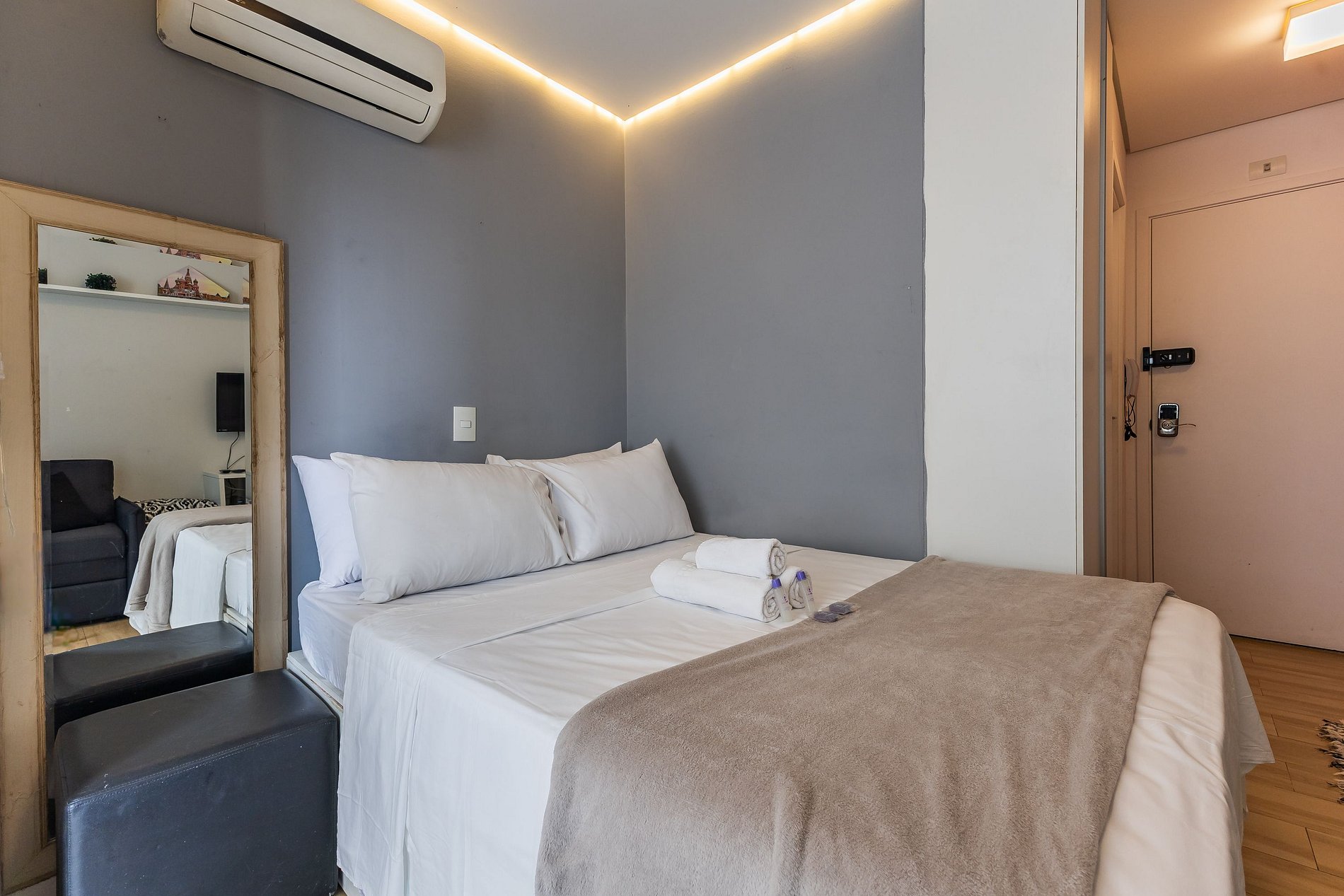 Conta com enxoval de cama e banho (sem reposição ou trocas), cozinha compacta com utensílios para o preparo de pequenas refeições, banheiro com secador de cabelo e uma charmosa varanda.