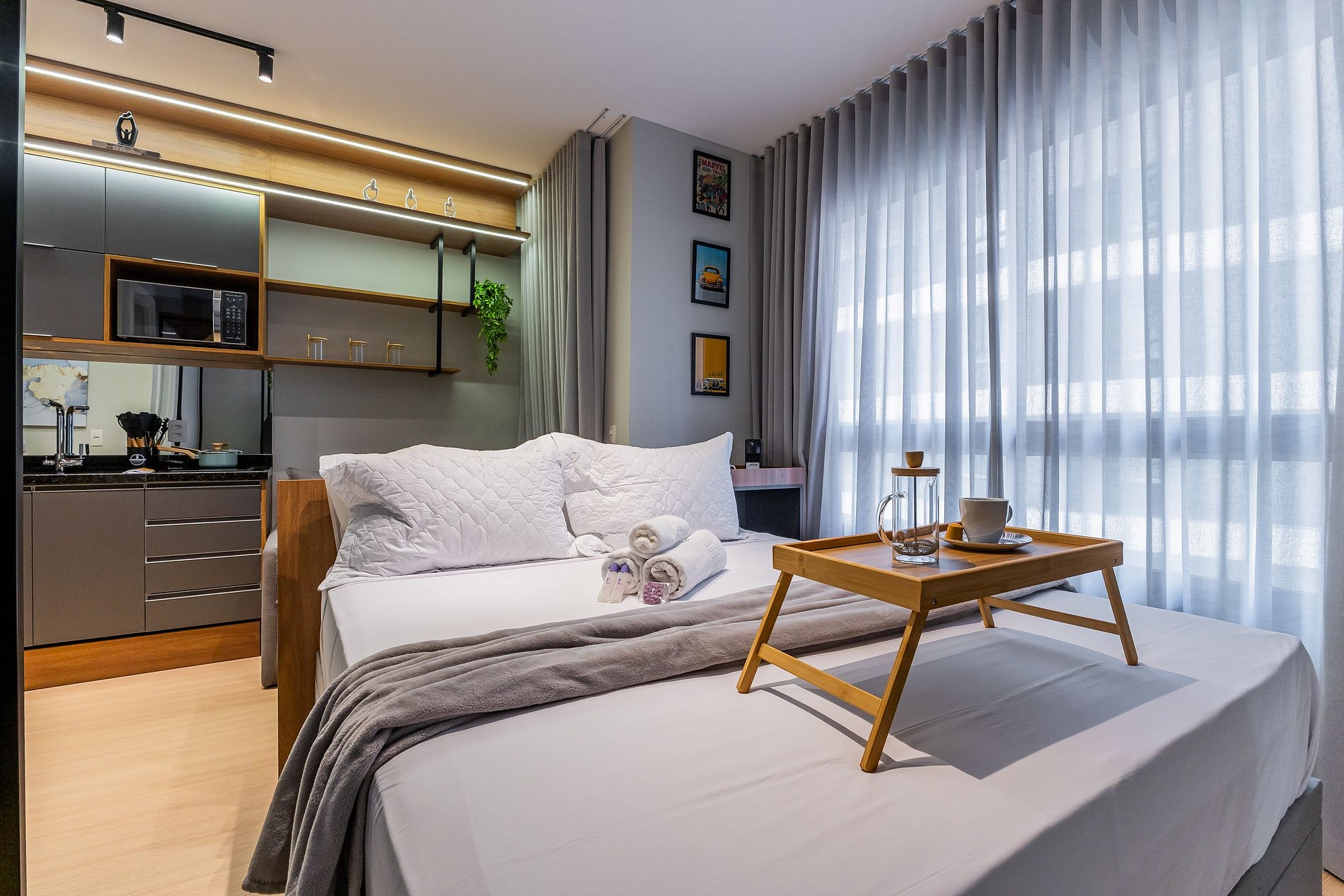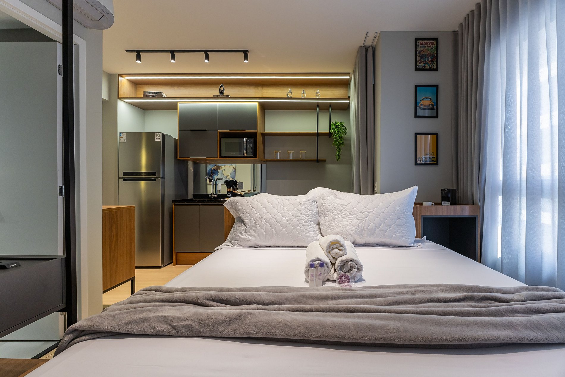 O condomínio dispõe de academia, lavanderia, piscina e portaria 24 horas, garantindo segurança e comodidade durante toda a estadia.