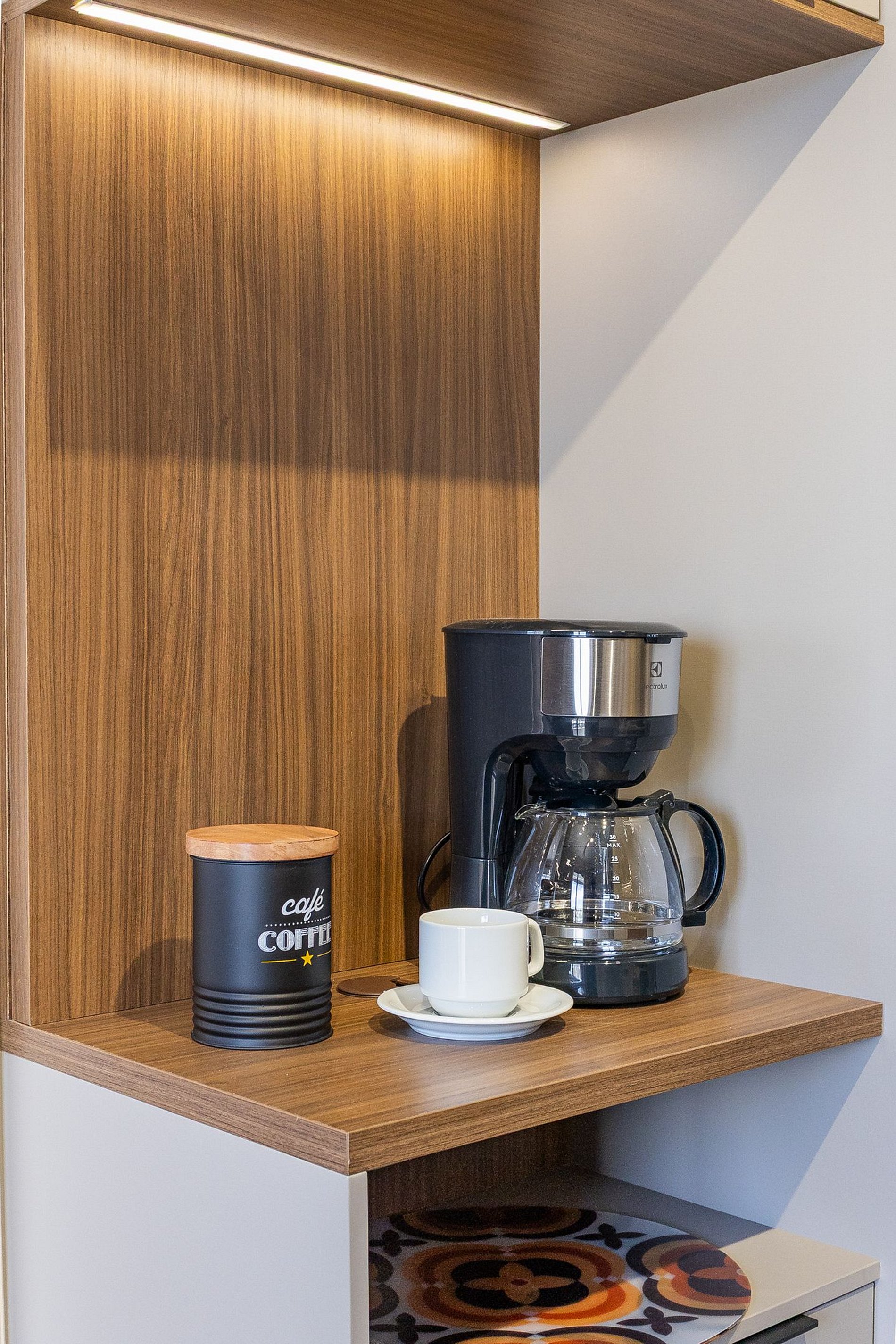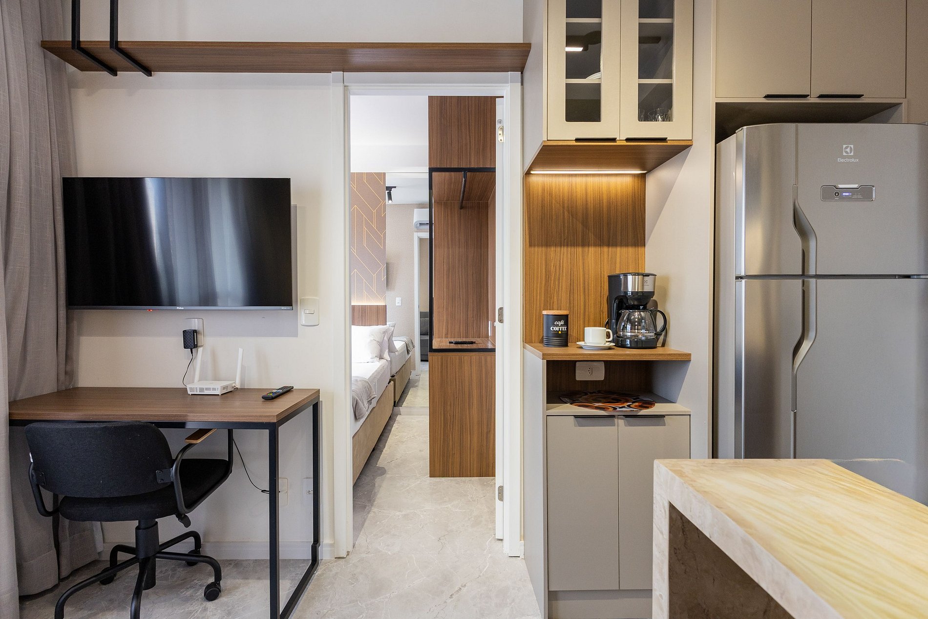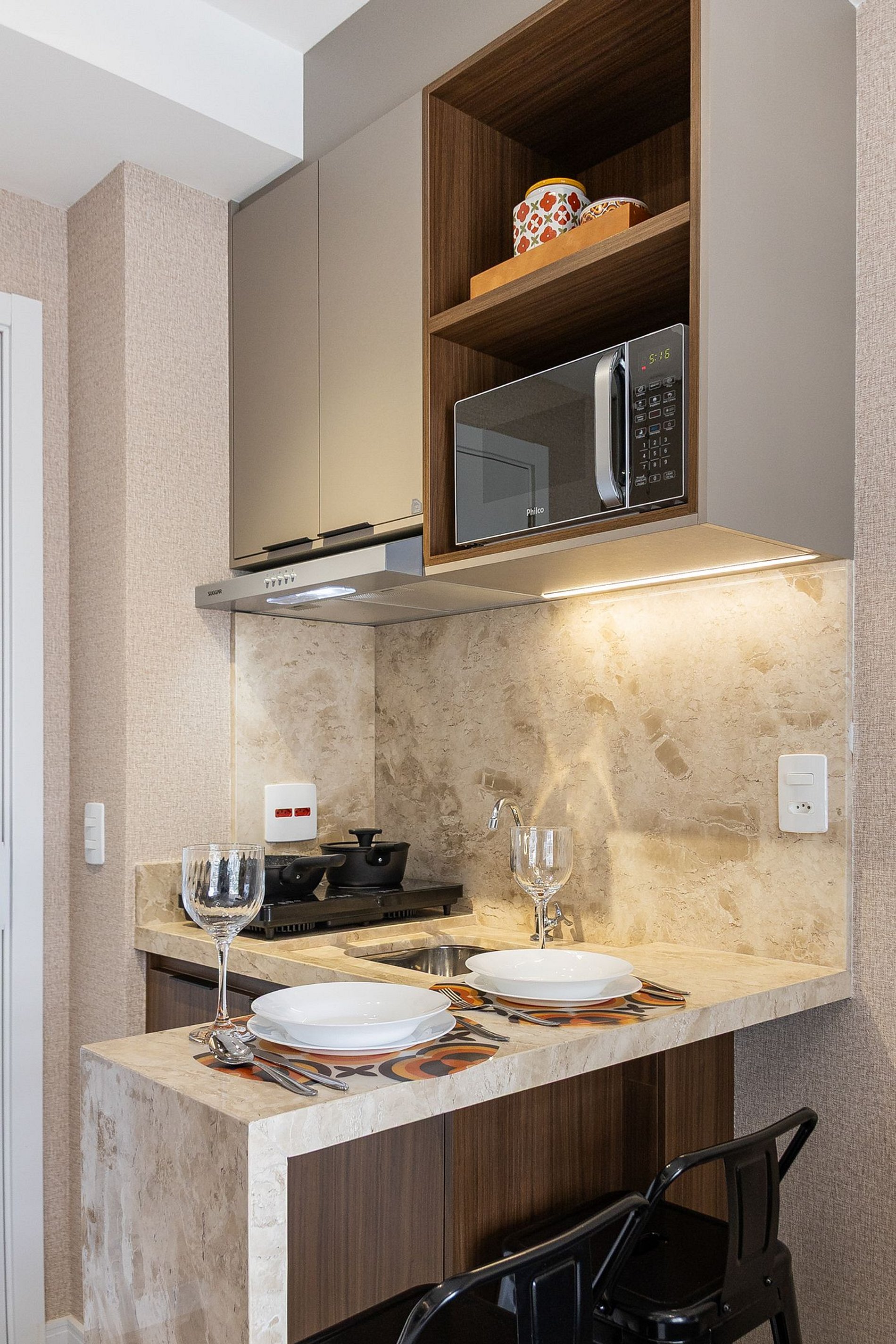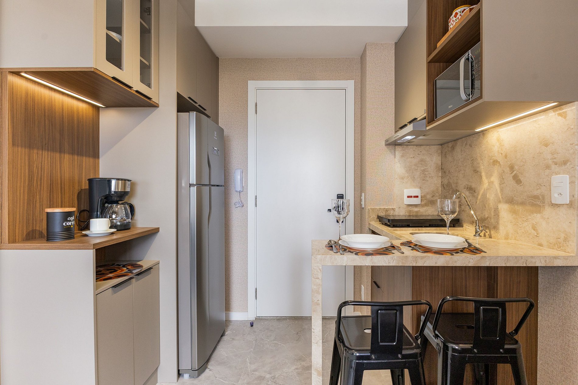 A cozinha equipada com itens básicos permite o preparo de pequenas refeições, garantindo mais autonomia no dia a dia.
