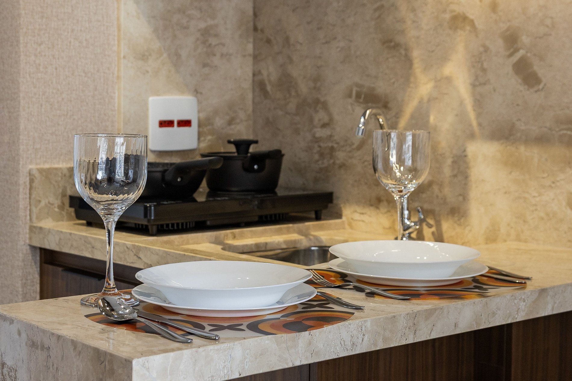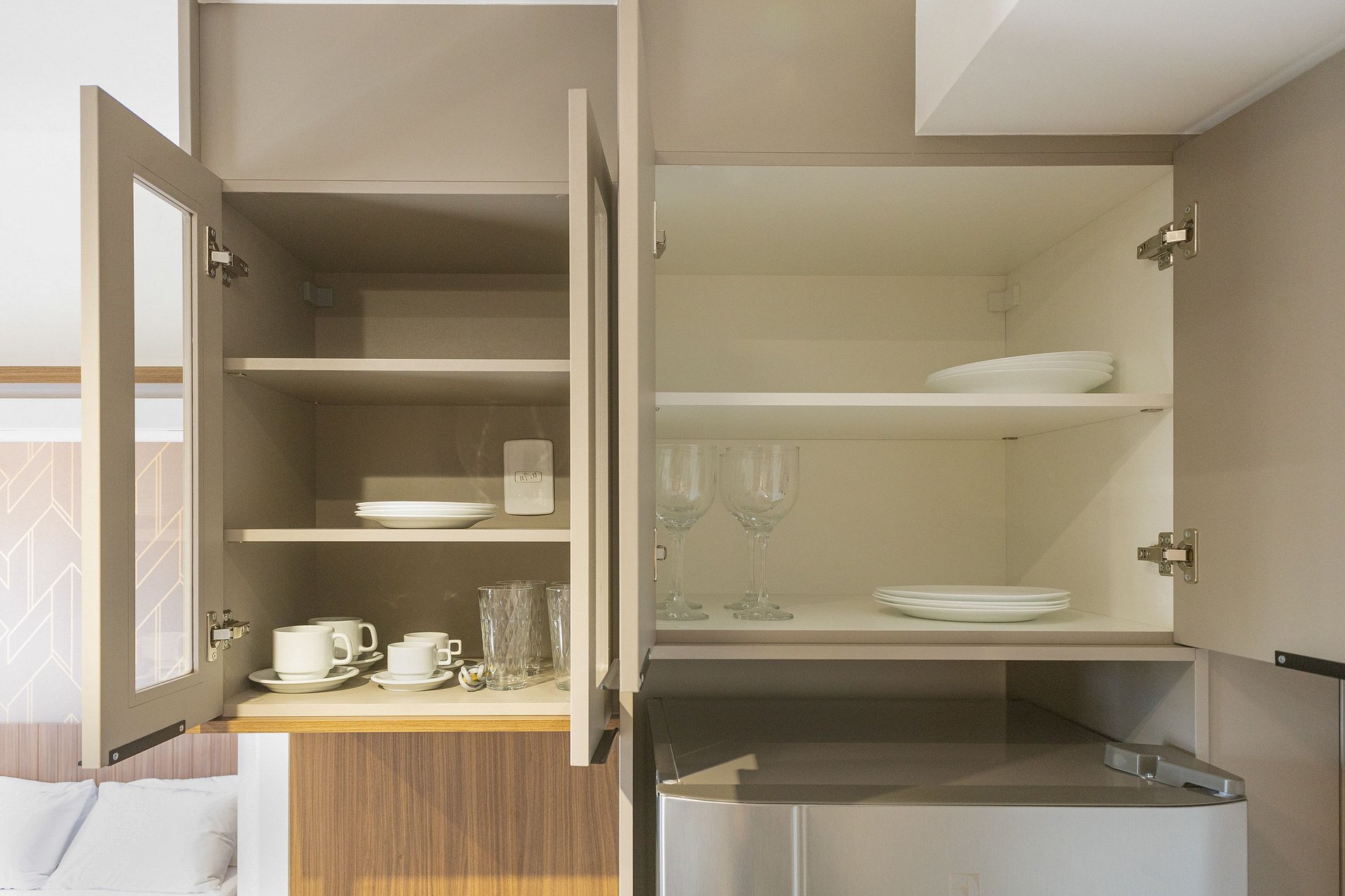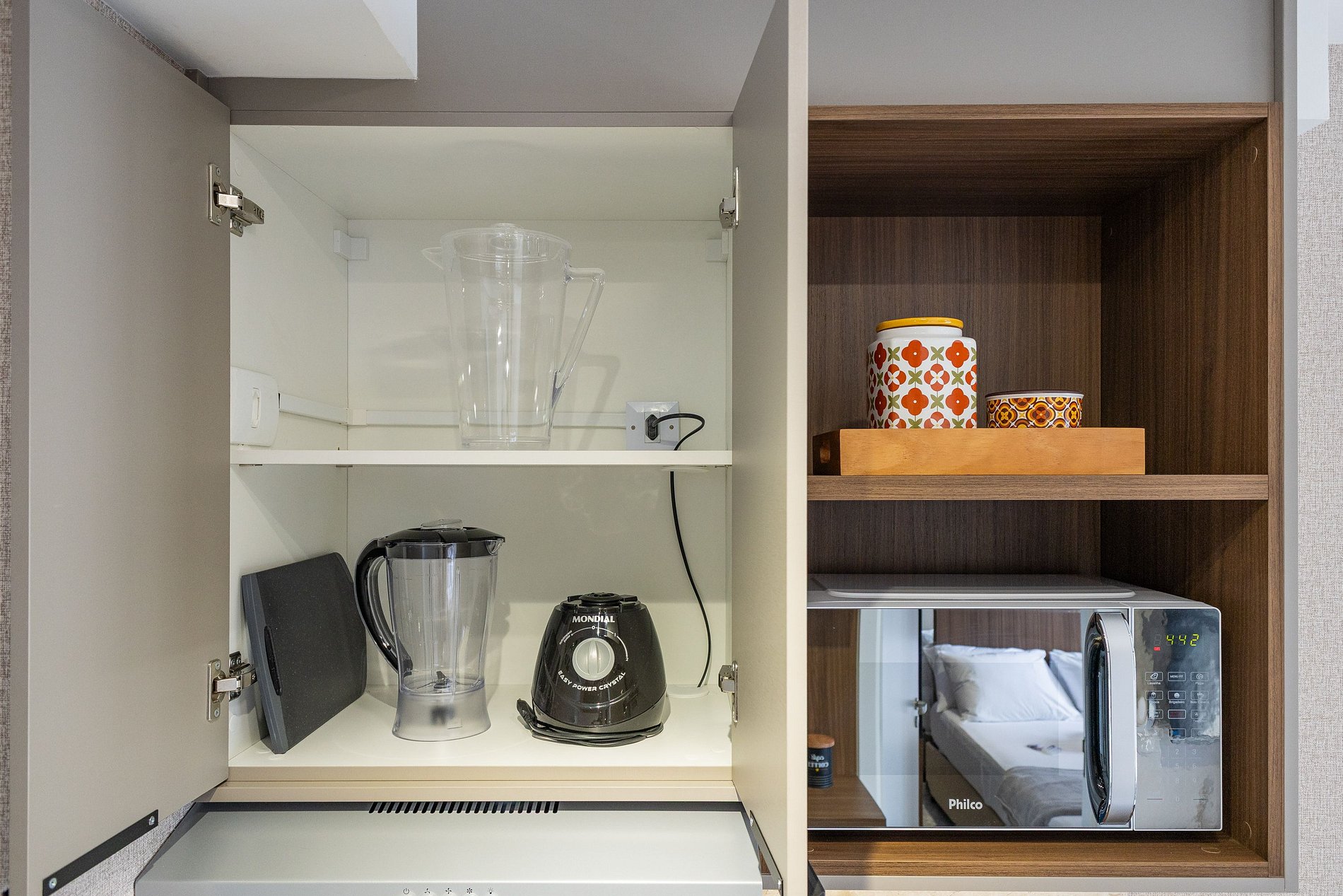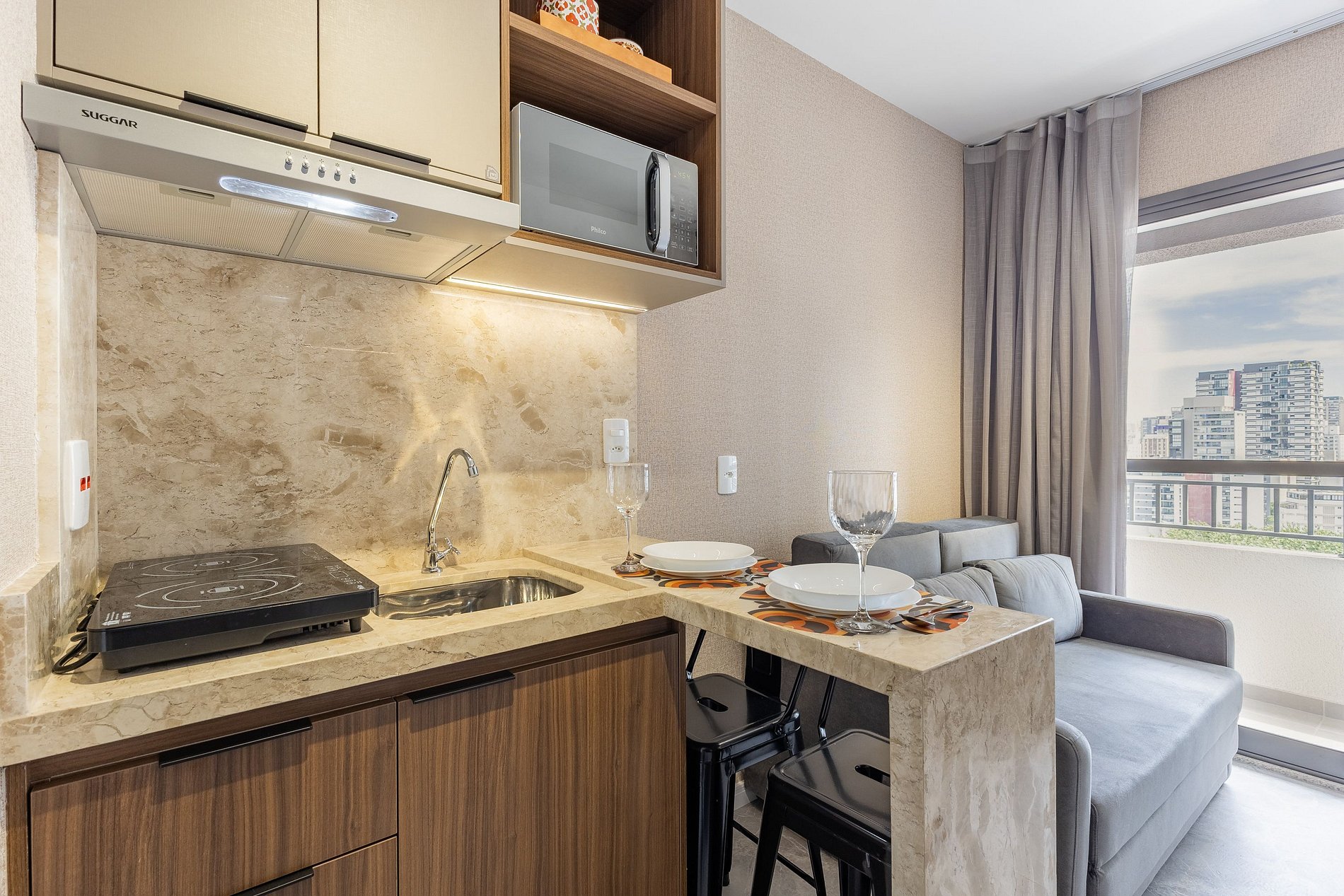 A cozinha equipada com itens básicos permite o preparo de pequenas refeições, garantindo mais autonomia no dia a dia.