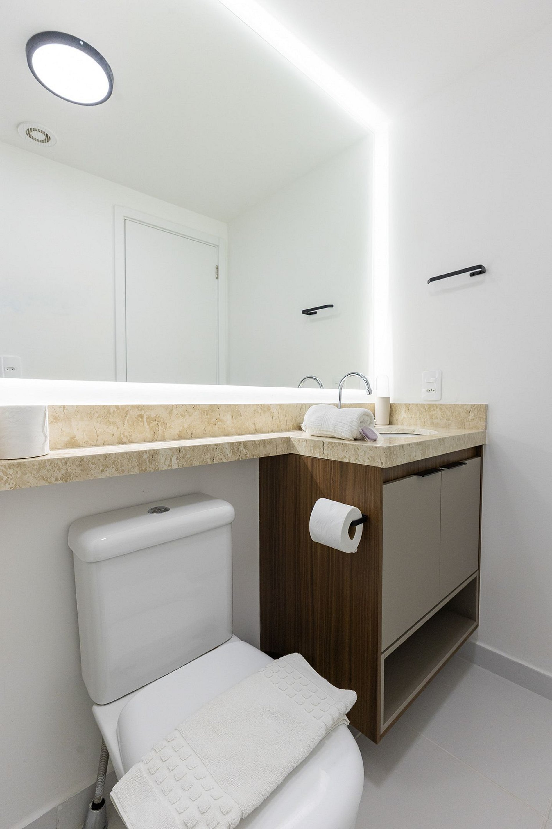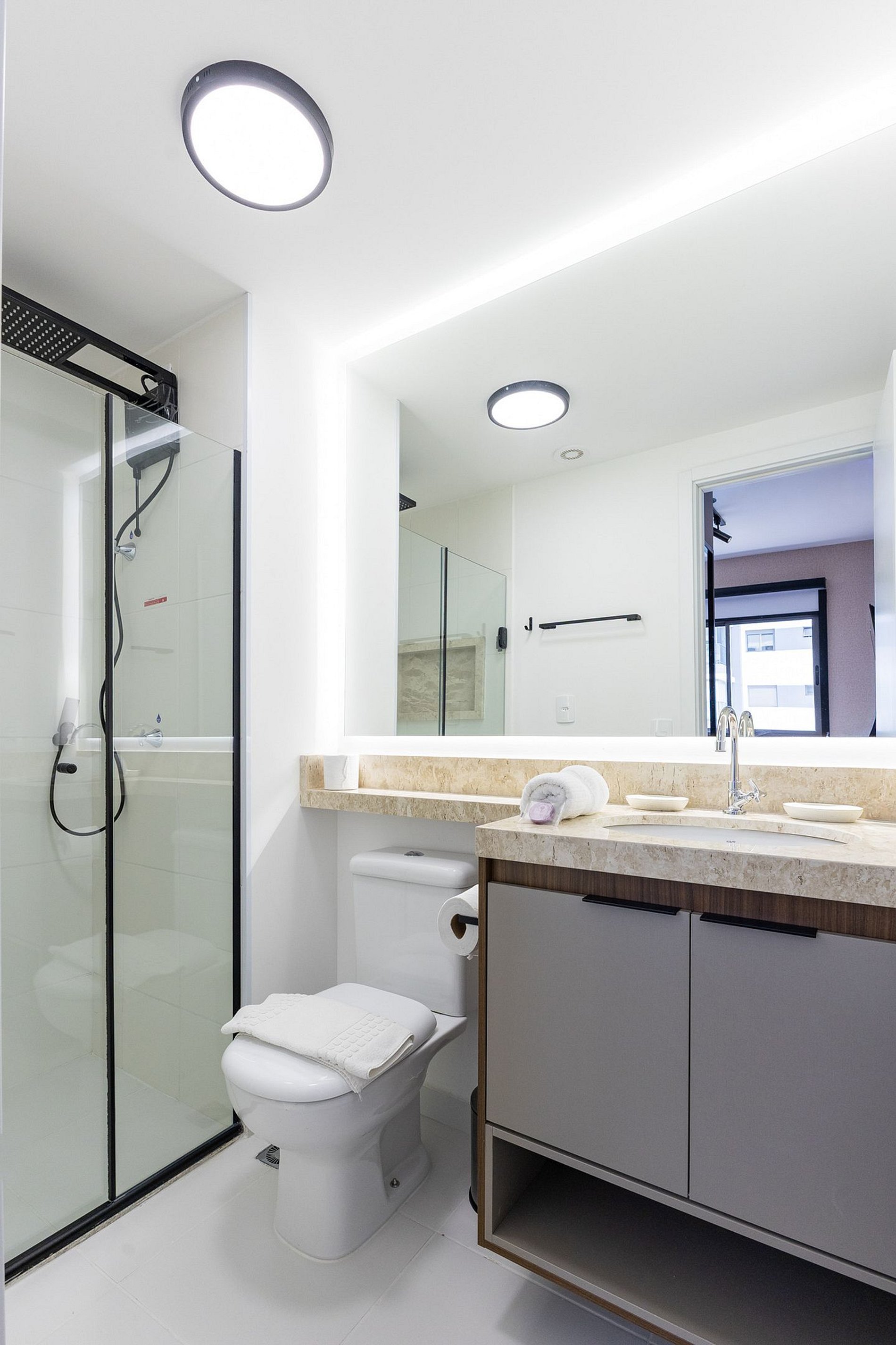 Por fim, o banheiro com secador de cabelo traz ainda mais praticidade para a sua rotina.