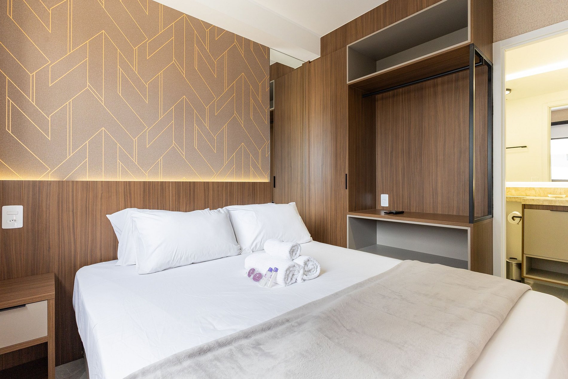 Acomodando até duas pessoas, o espaço oferece uma cama tamanho queen e um enxoval de cama e banho fornecido no início da estadia, sem trocas ou reposições.