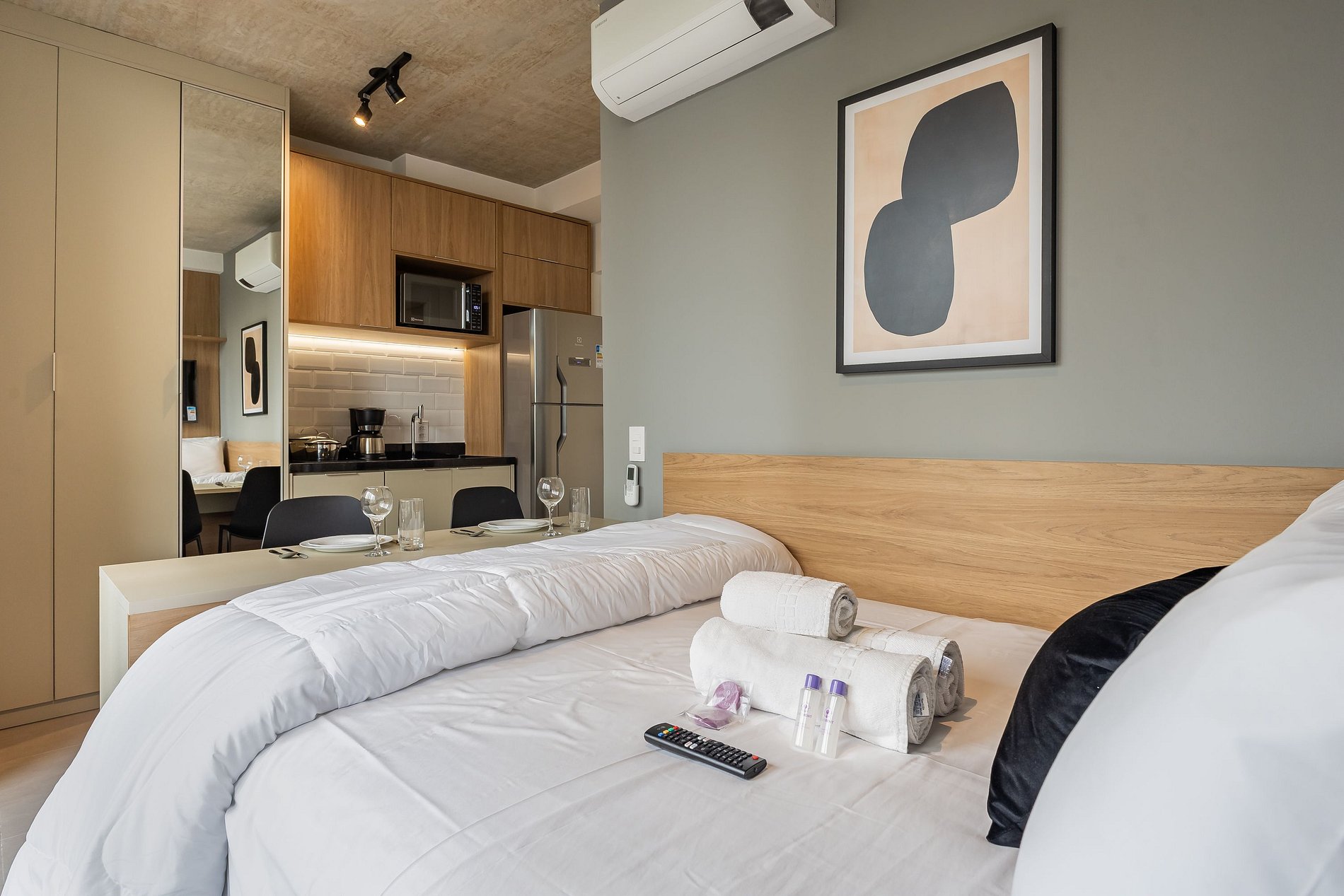 Conta com enxoval de cama e banho (sem reposição ou trocas), cozinha compacta com utensílios para o preparo de pequenas refeições, banheiro privativo e uma charmosa varanda.