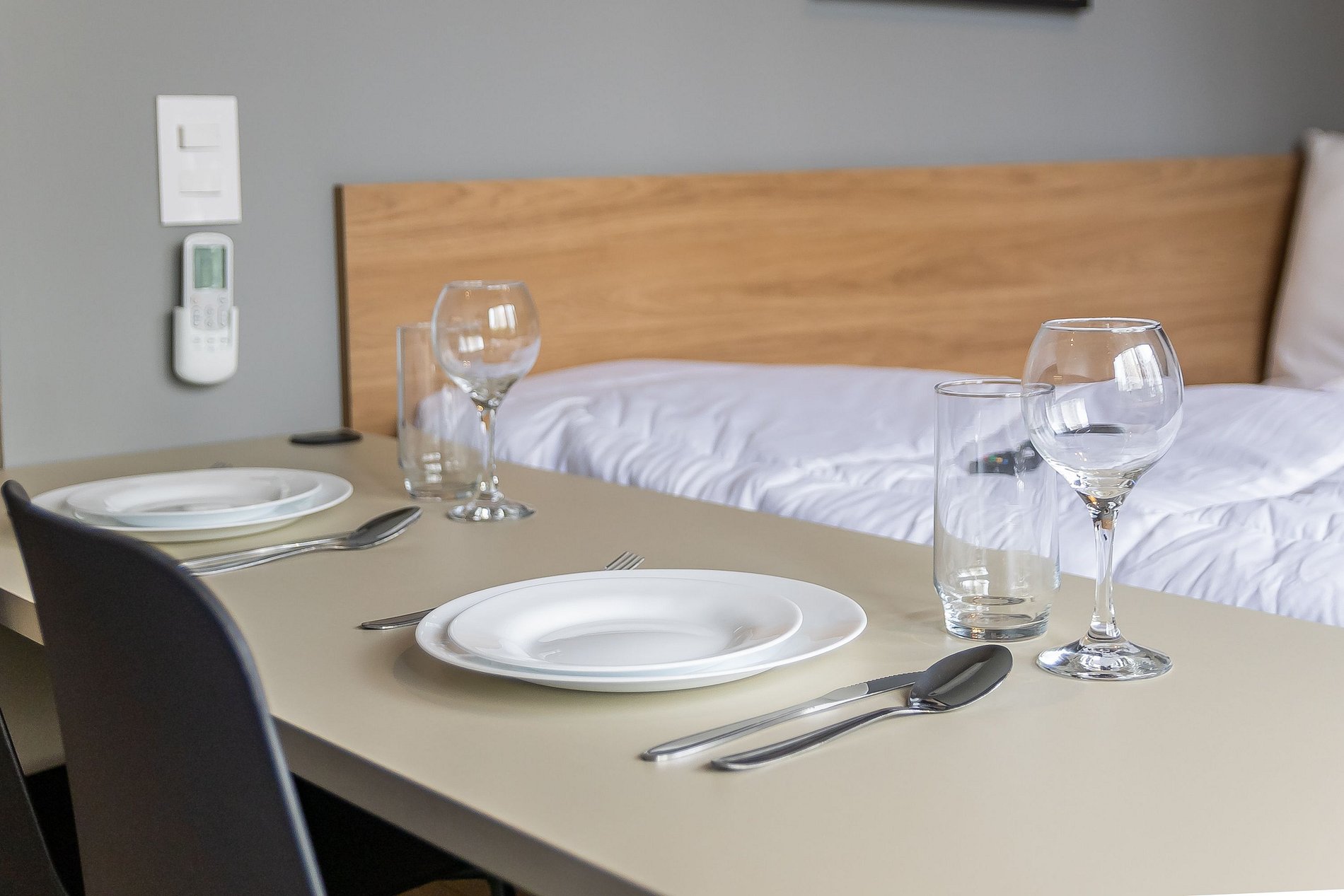 Acomodando até duas pessoas, o espaço oferece uma cama tamanho casal padrão e um enxoval de cama e banho fornecido no início da estadia, sem trocas ou reposições.