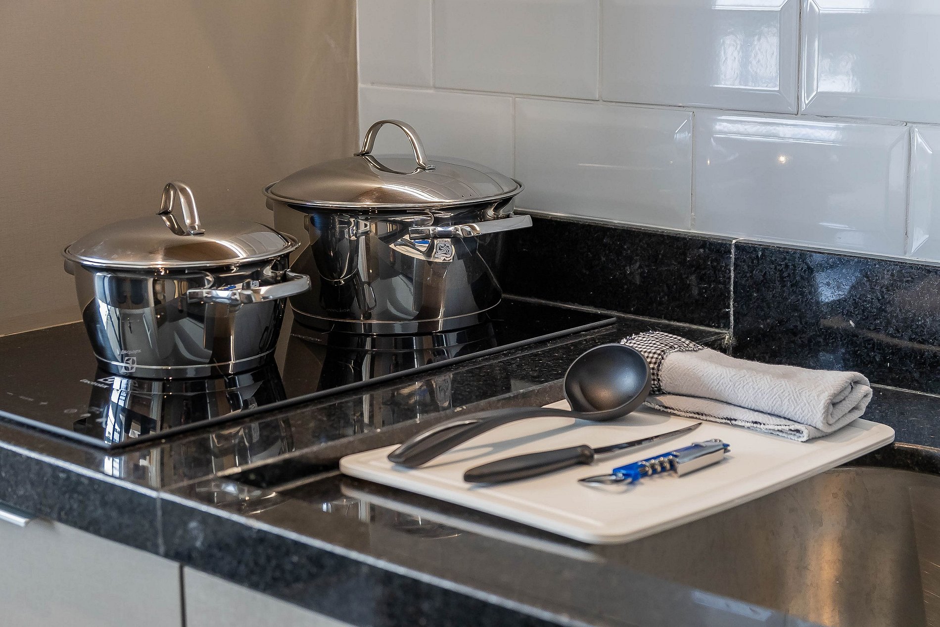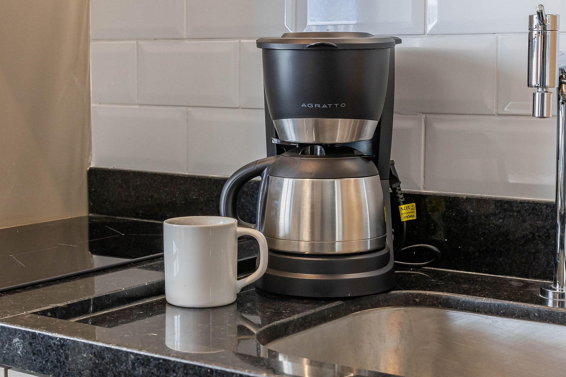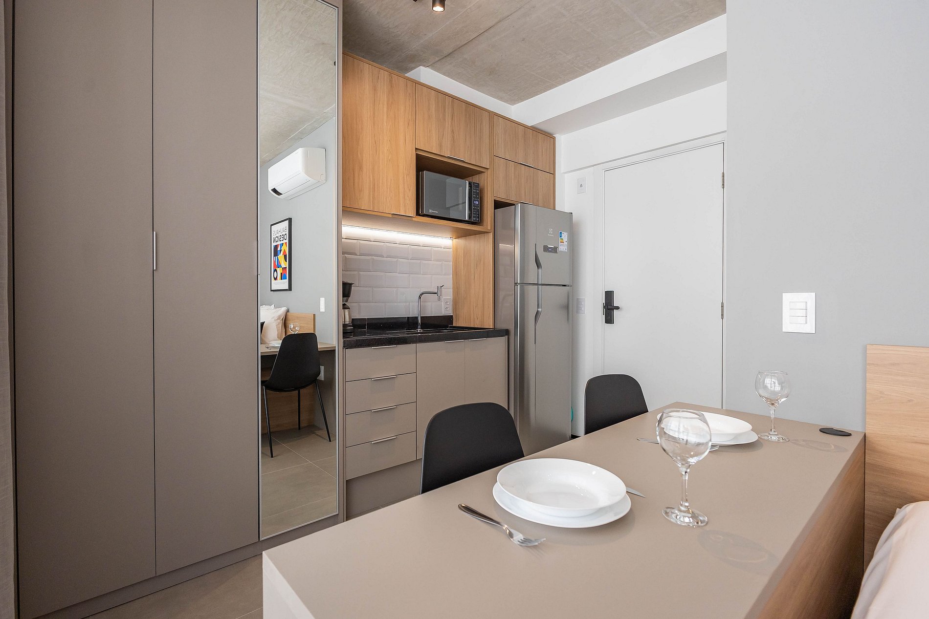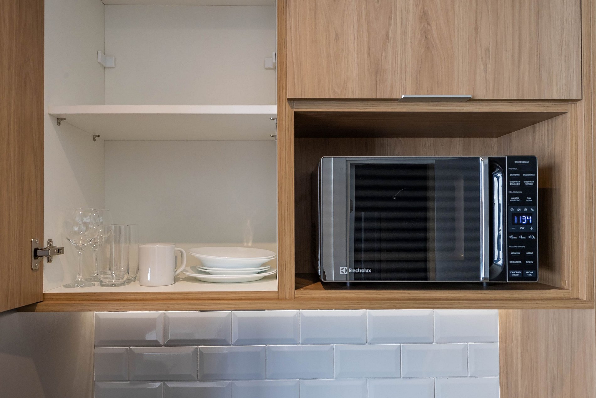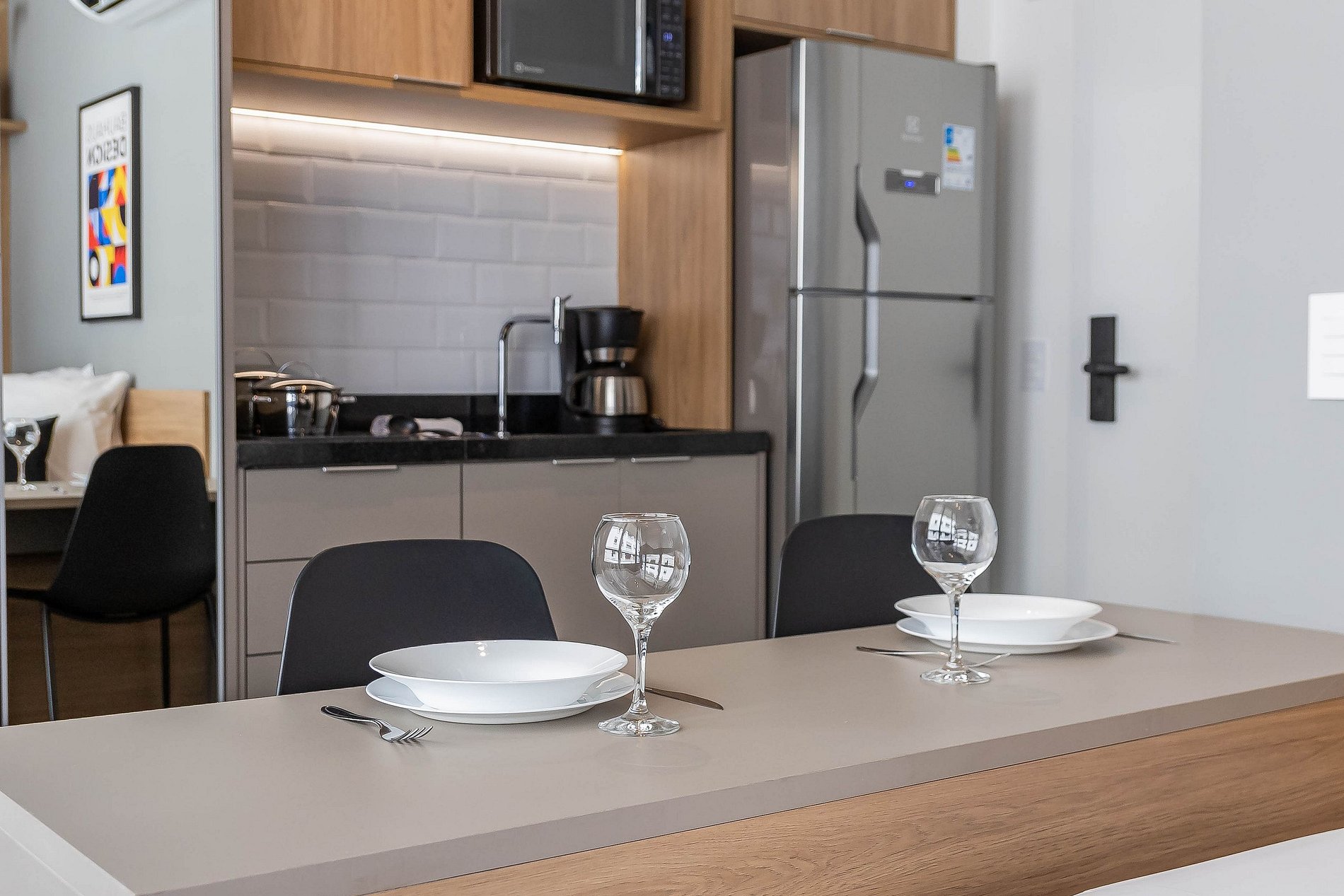 A cozinha equipada com itens básicos permite o preparo de pequenas refeições, garantindo mais autonomia no dia a dia.