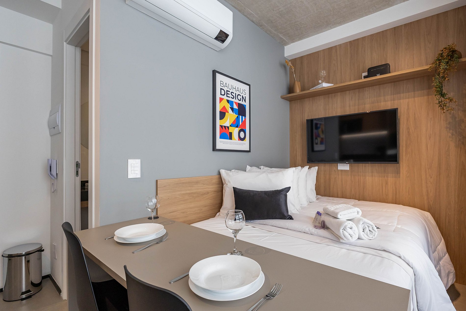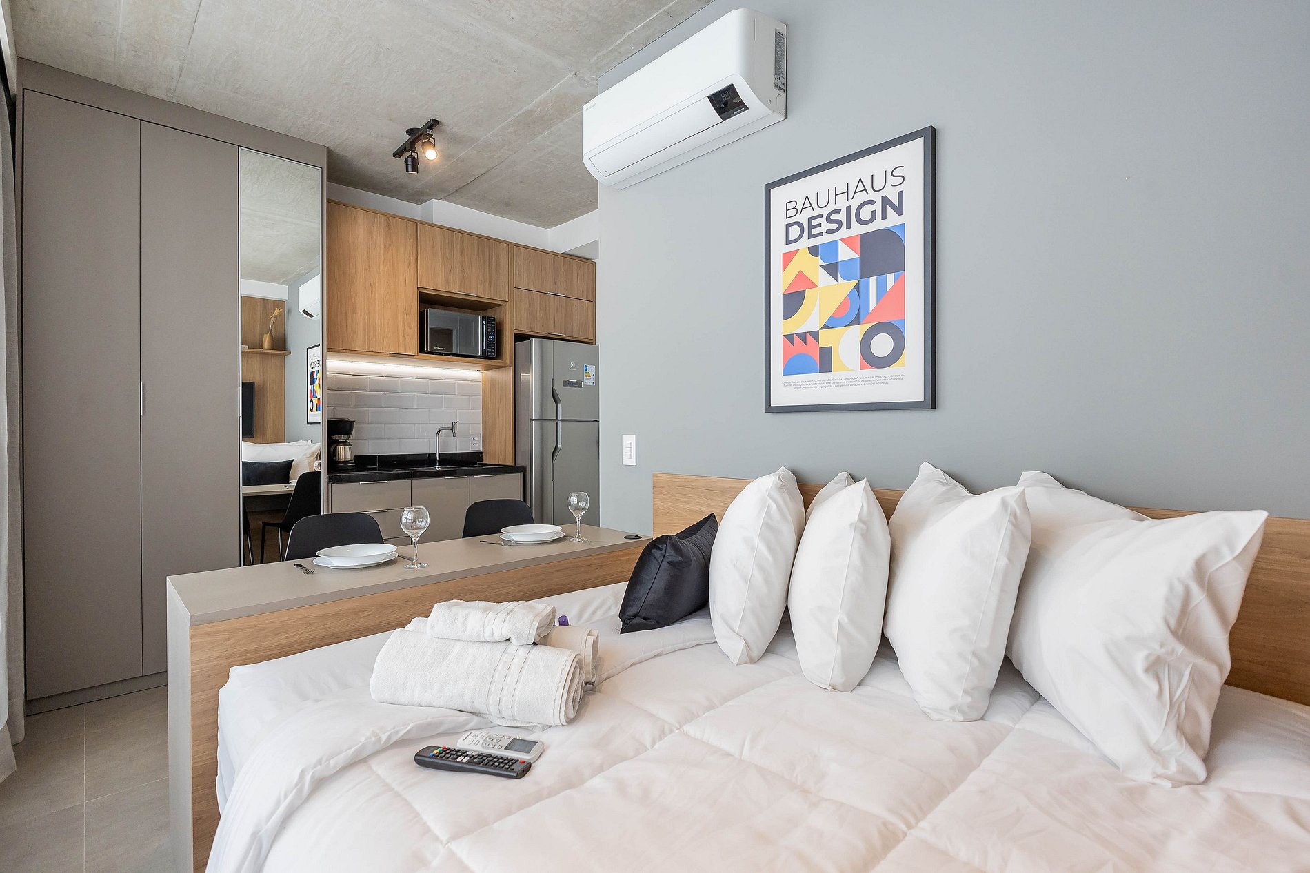 Conta com enxoval de cama e banho (sem reposição ou trocas), cozinha compacta com utensílios para o preparo de pequenas refeições, banheiro privativo e uma charmosa varanda.