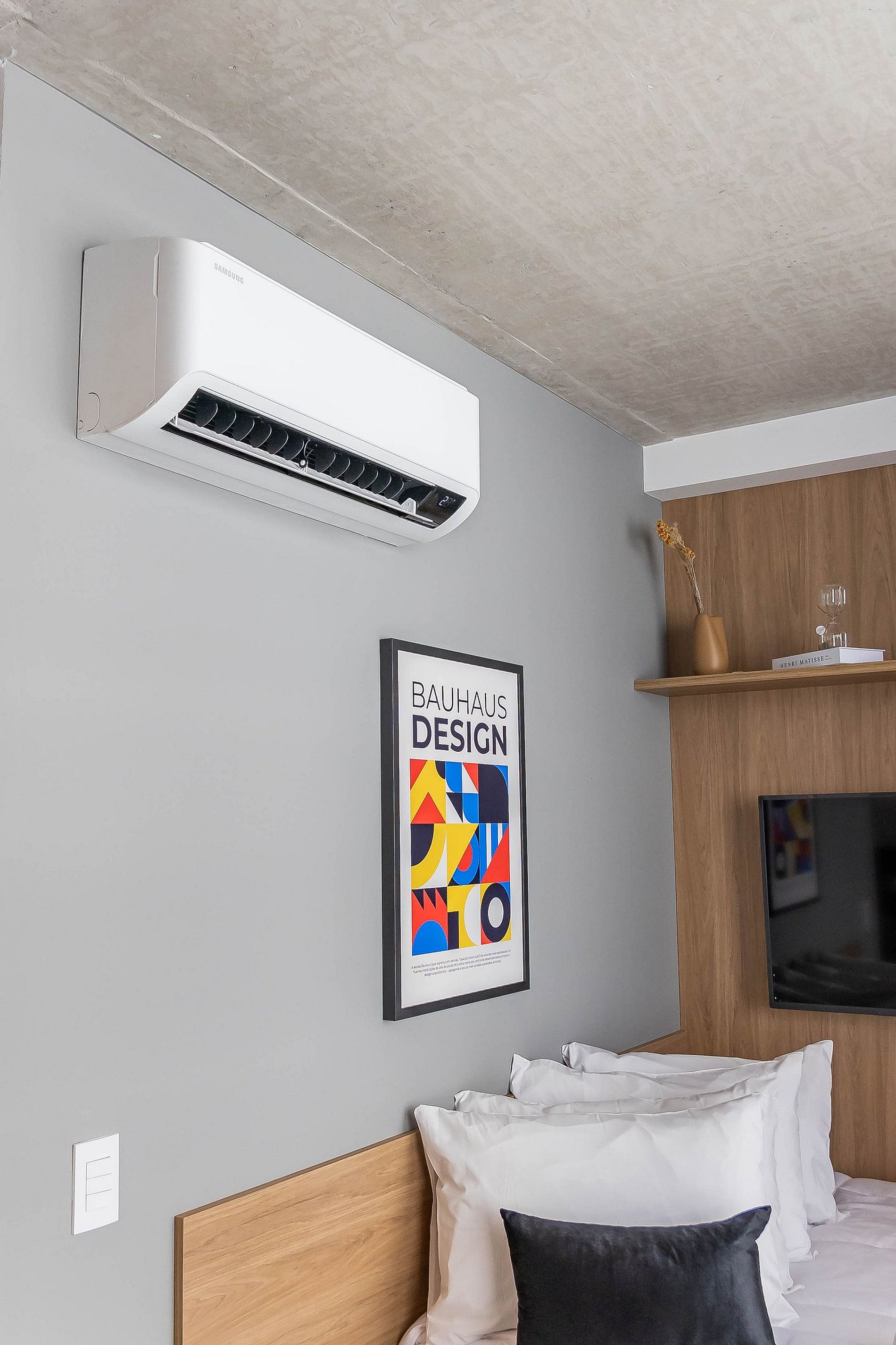O apartamento também dispõe de ar-condicionado (somente refrigeração) e de uma varanda charmosa, que deixa o ambiente mais agradável com a entrada de luz natural.