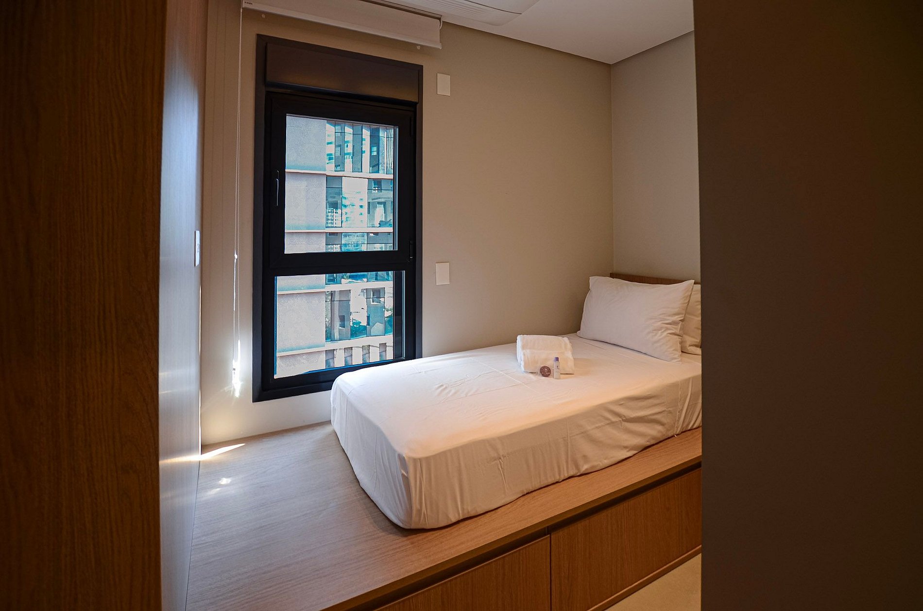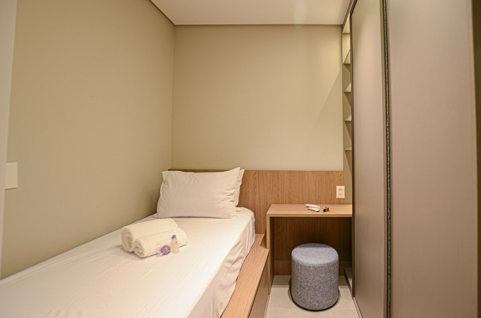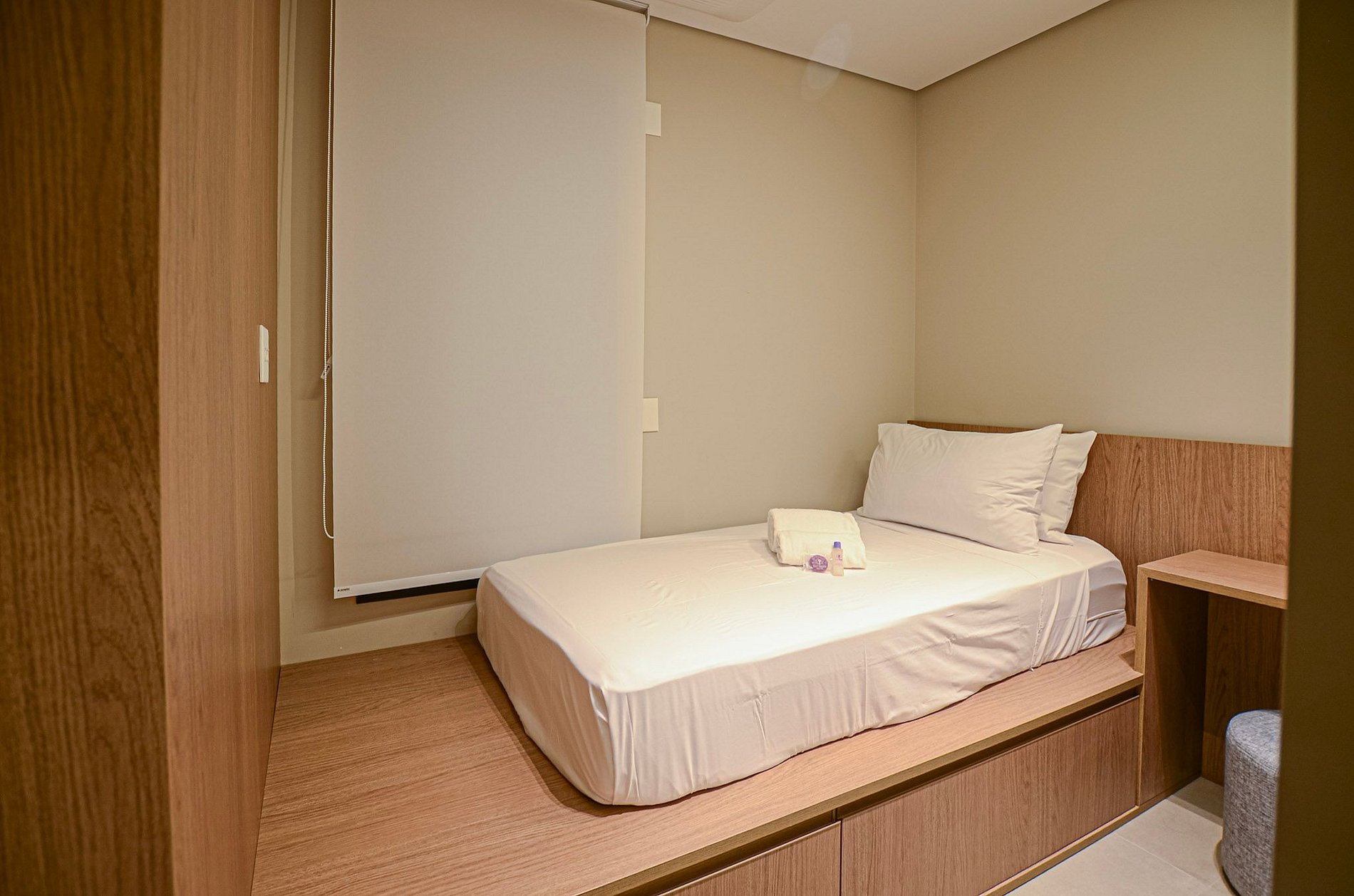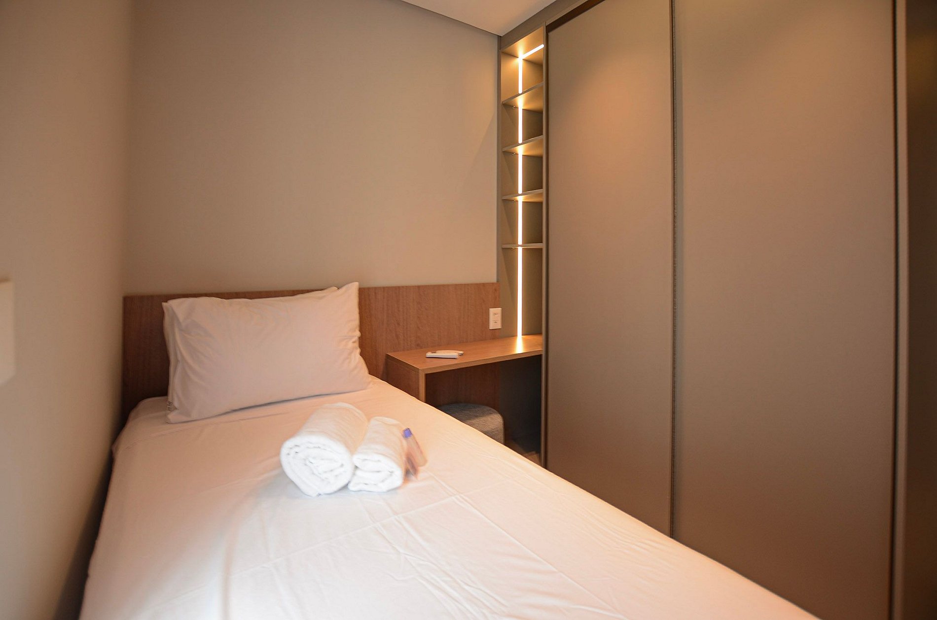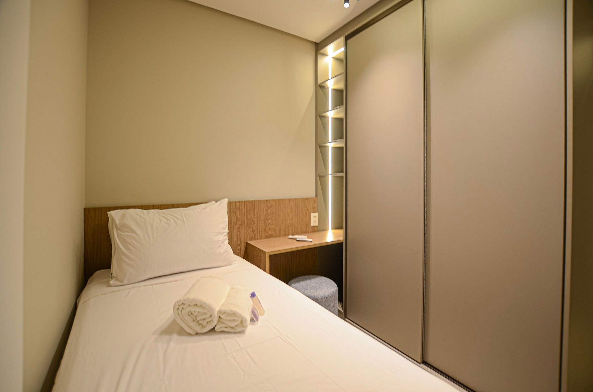 Quarto 2 – Uma cama de solteiro, armário, ar-condicionado e cortina blackout automatizada por controle.