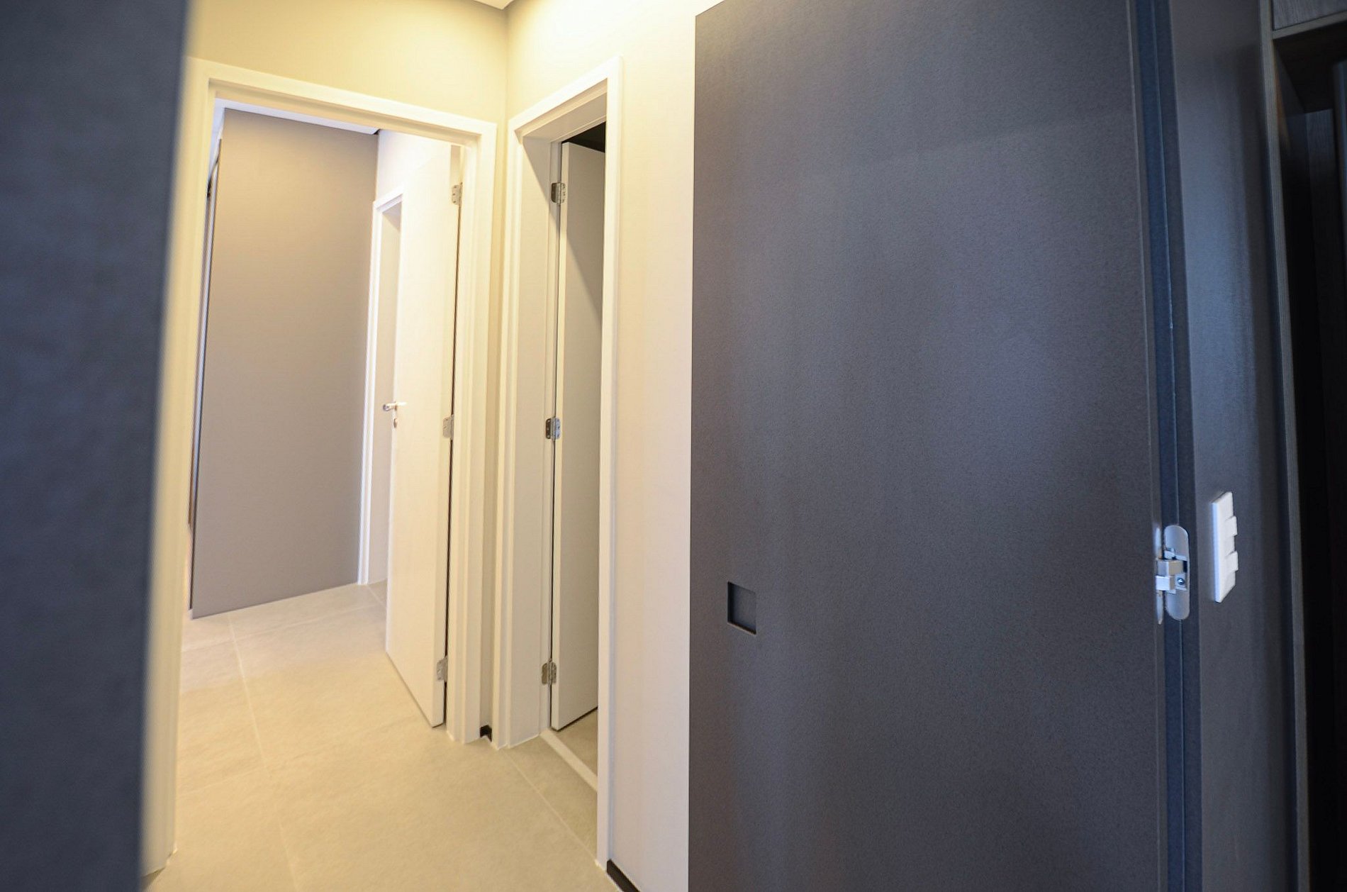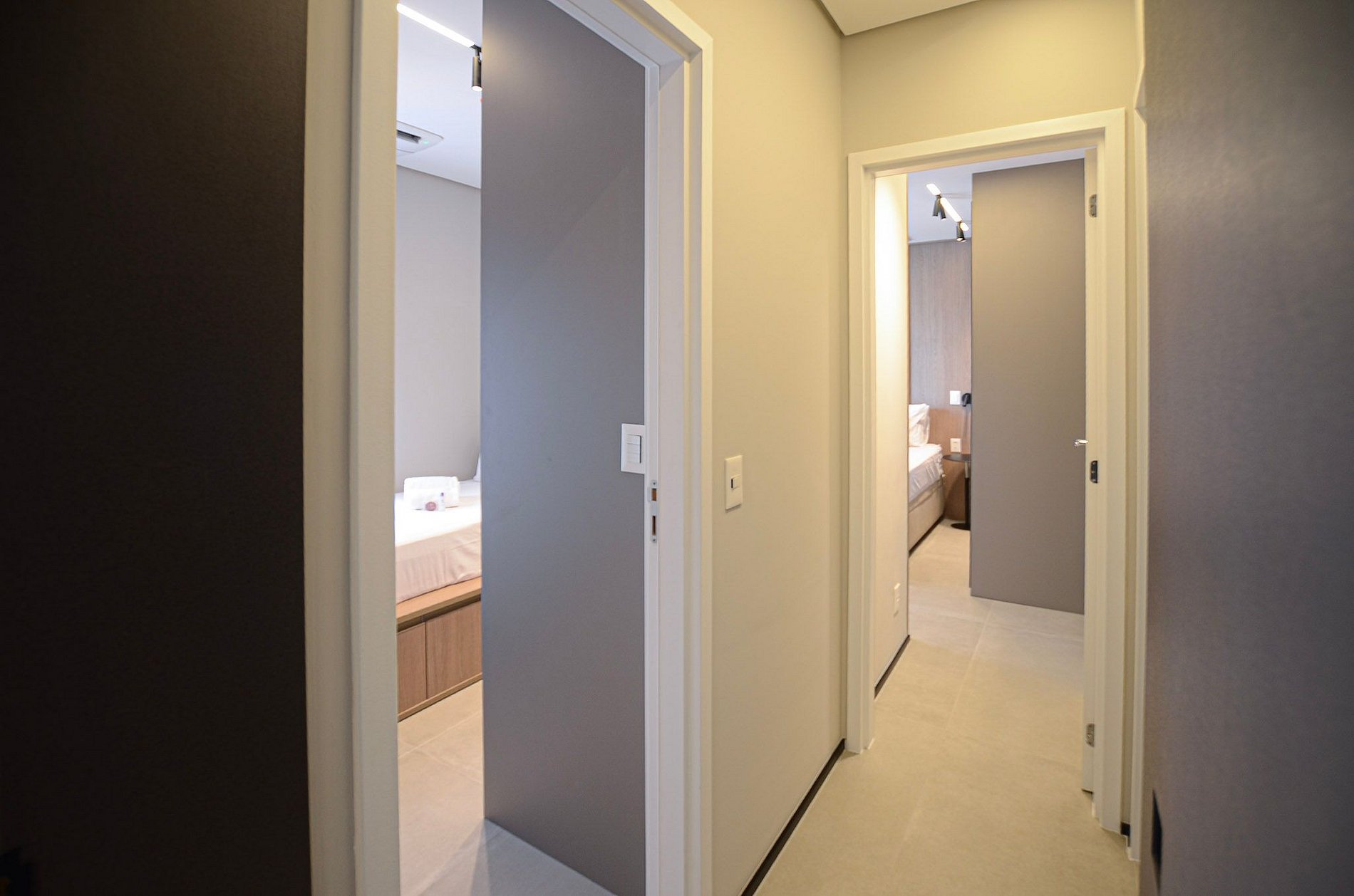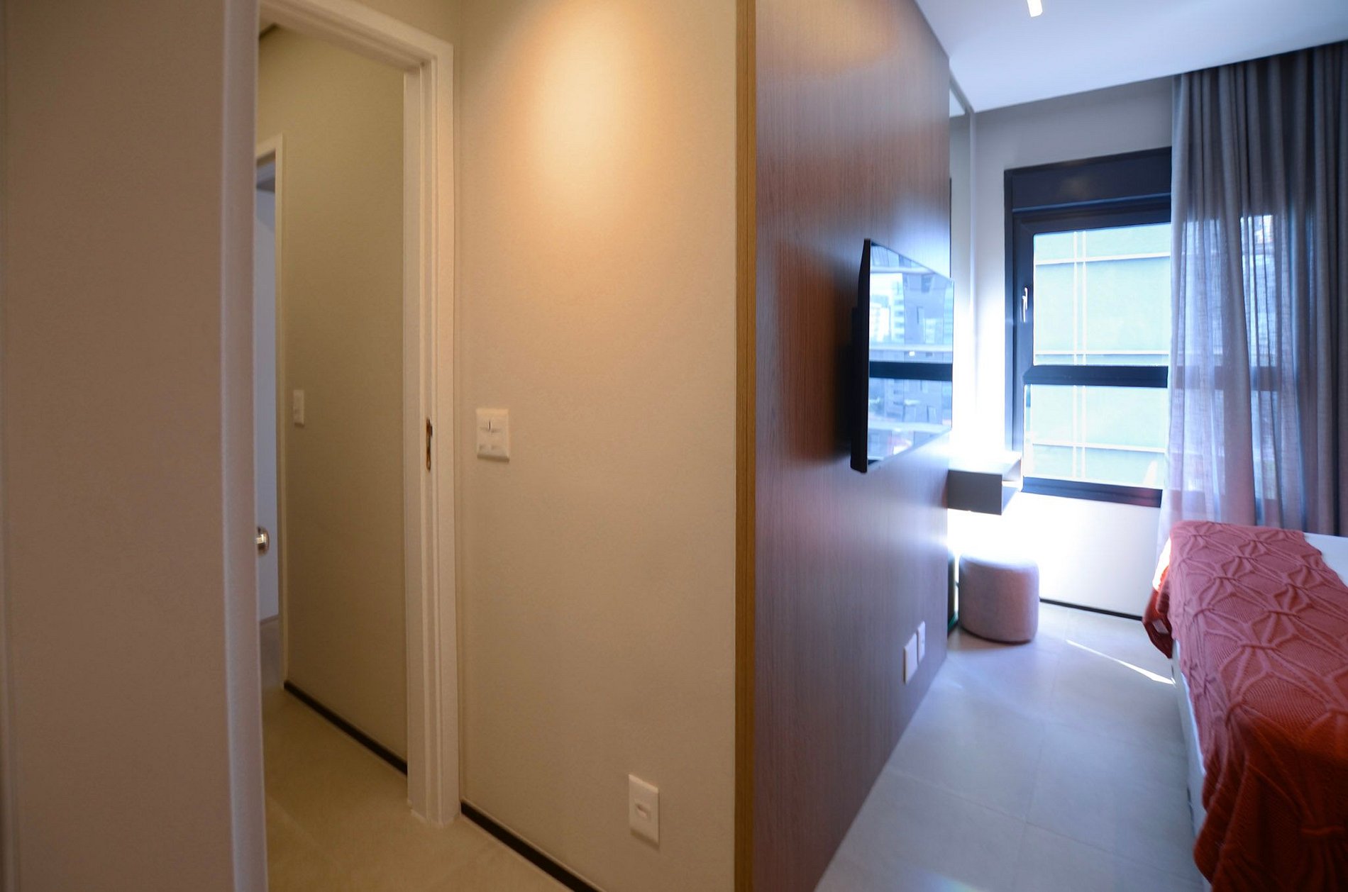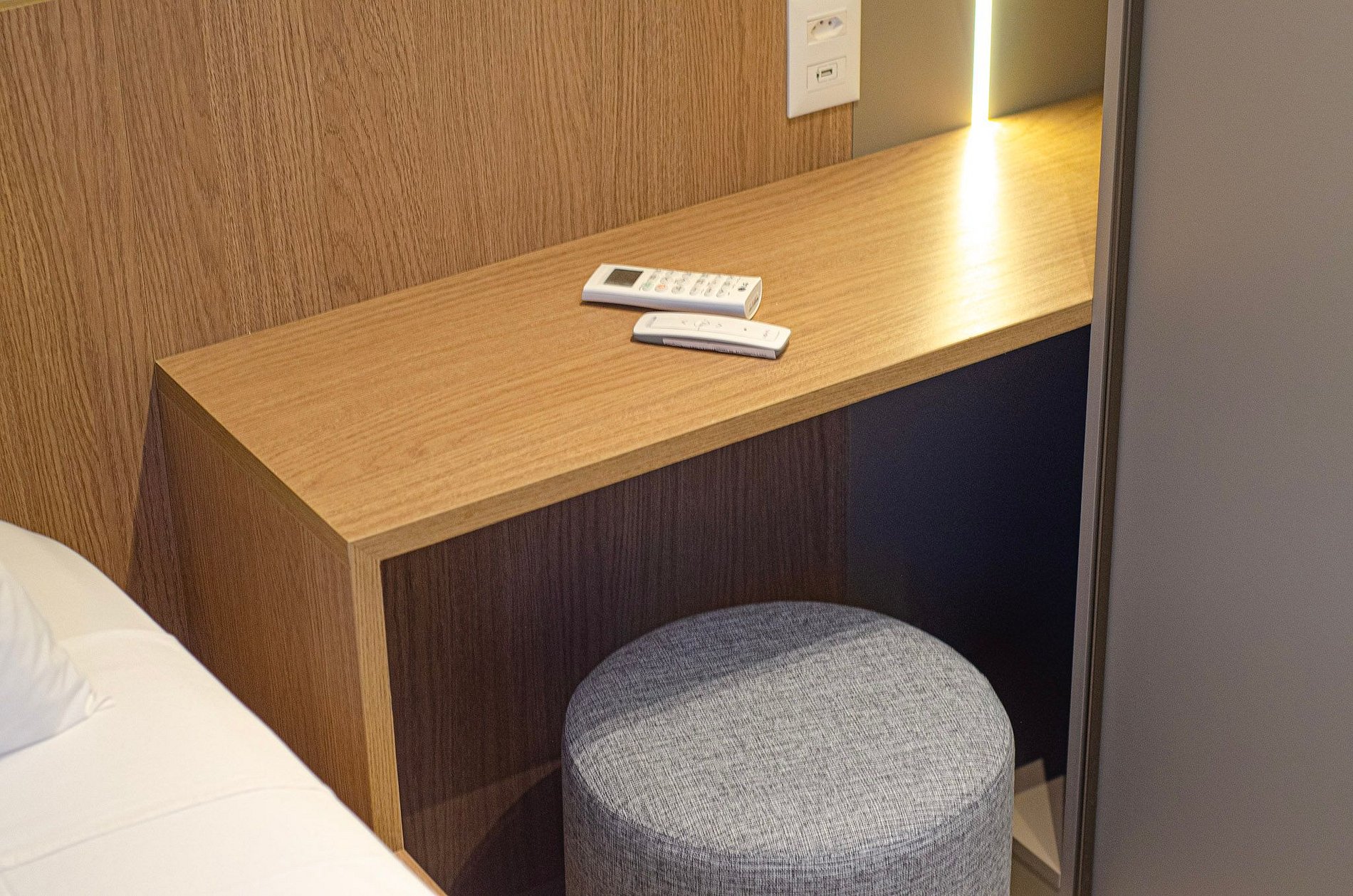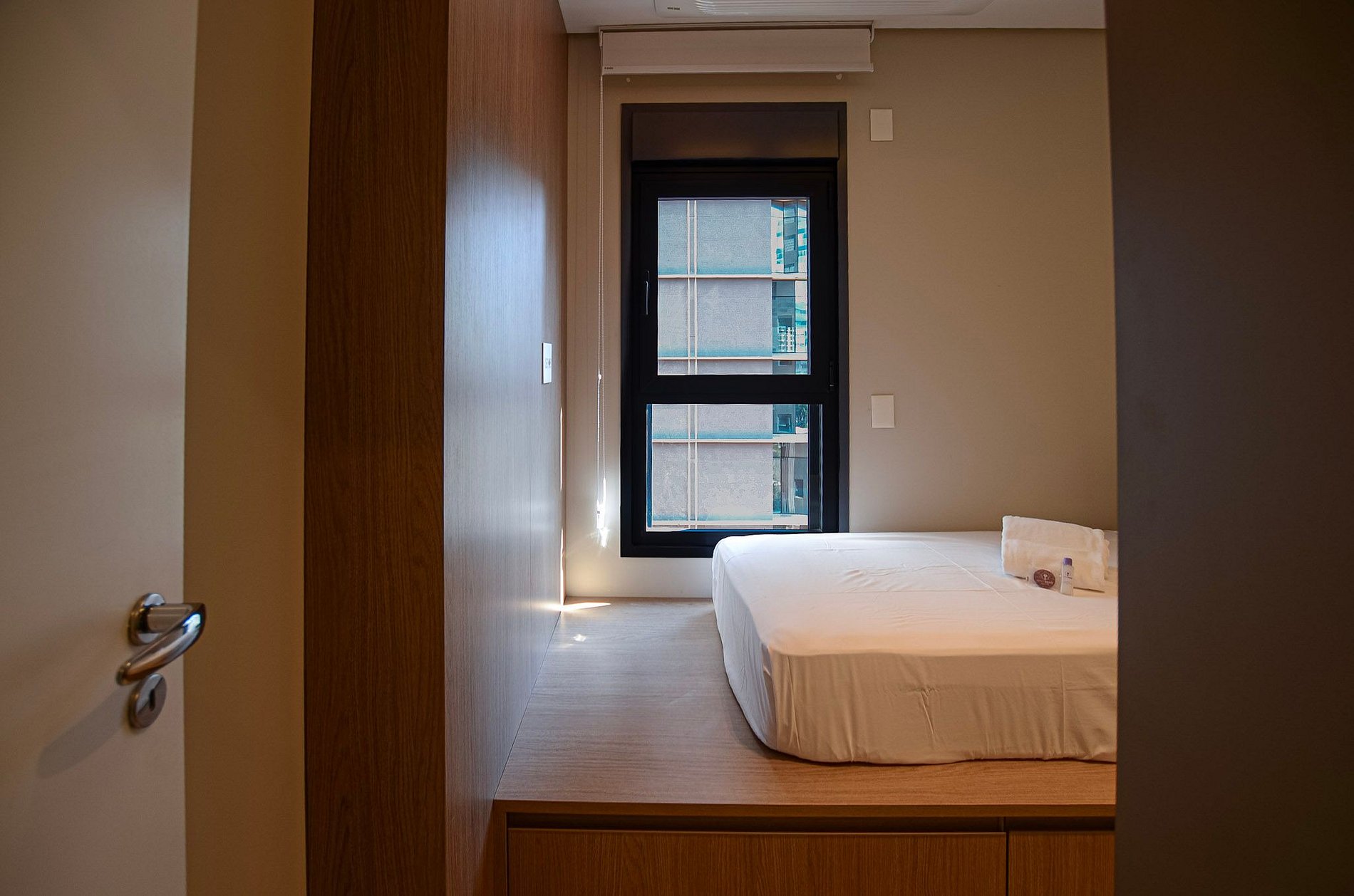 Quarto 2 – Uma cama de solteiro, armário, ar-condicionado e cortina blackout automatizada por controle.