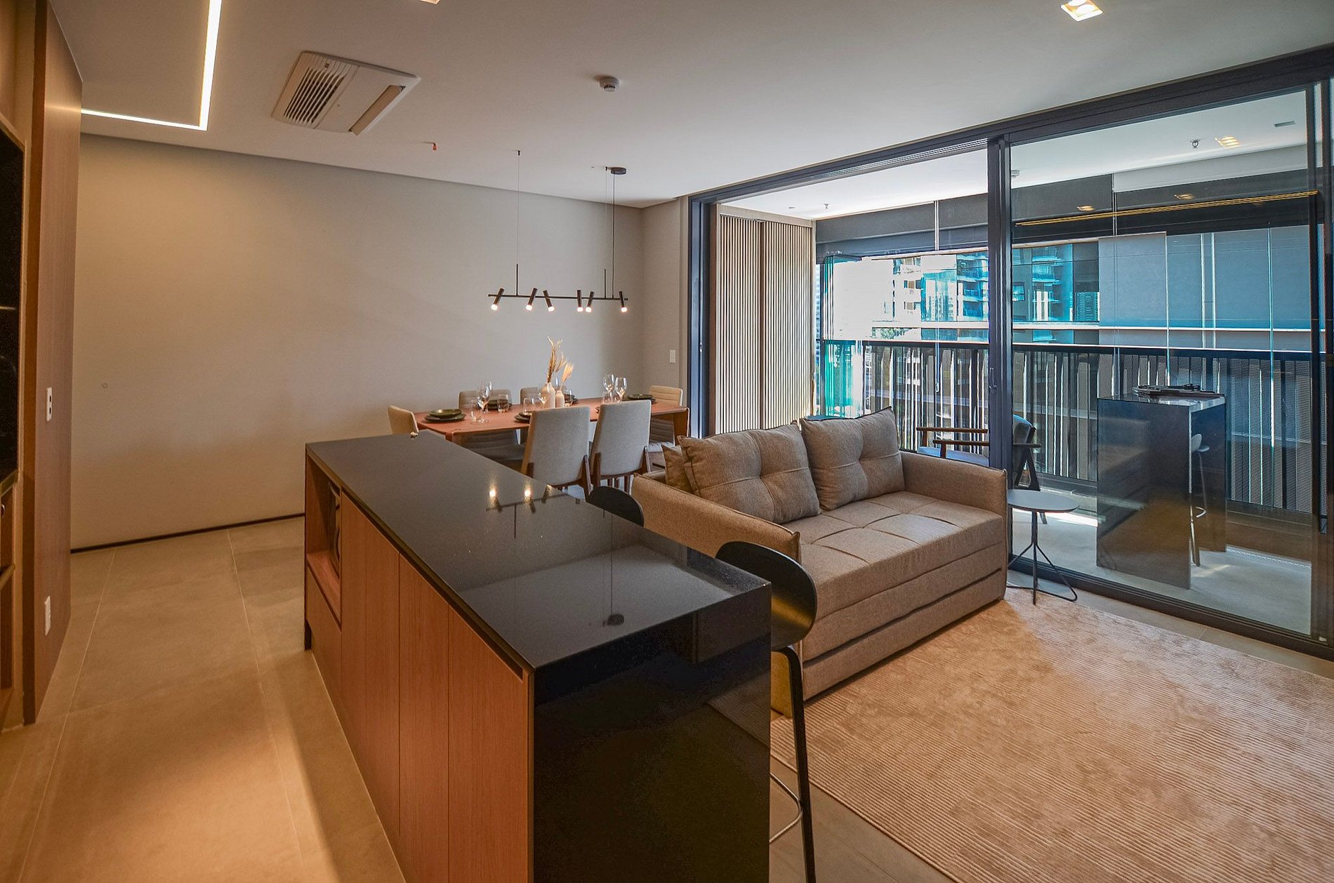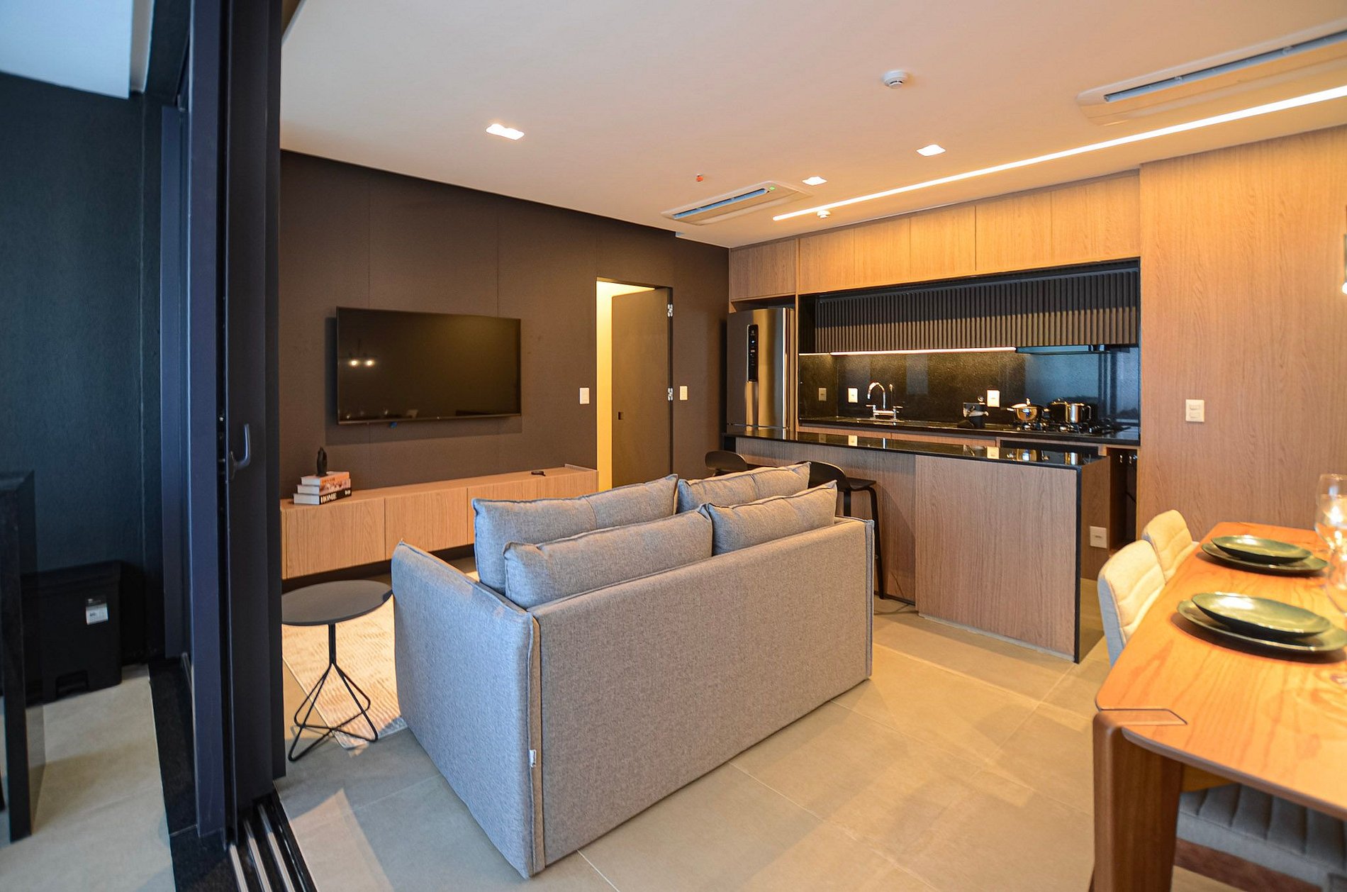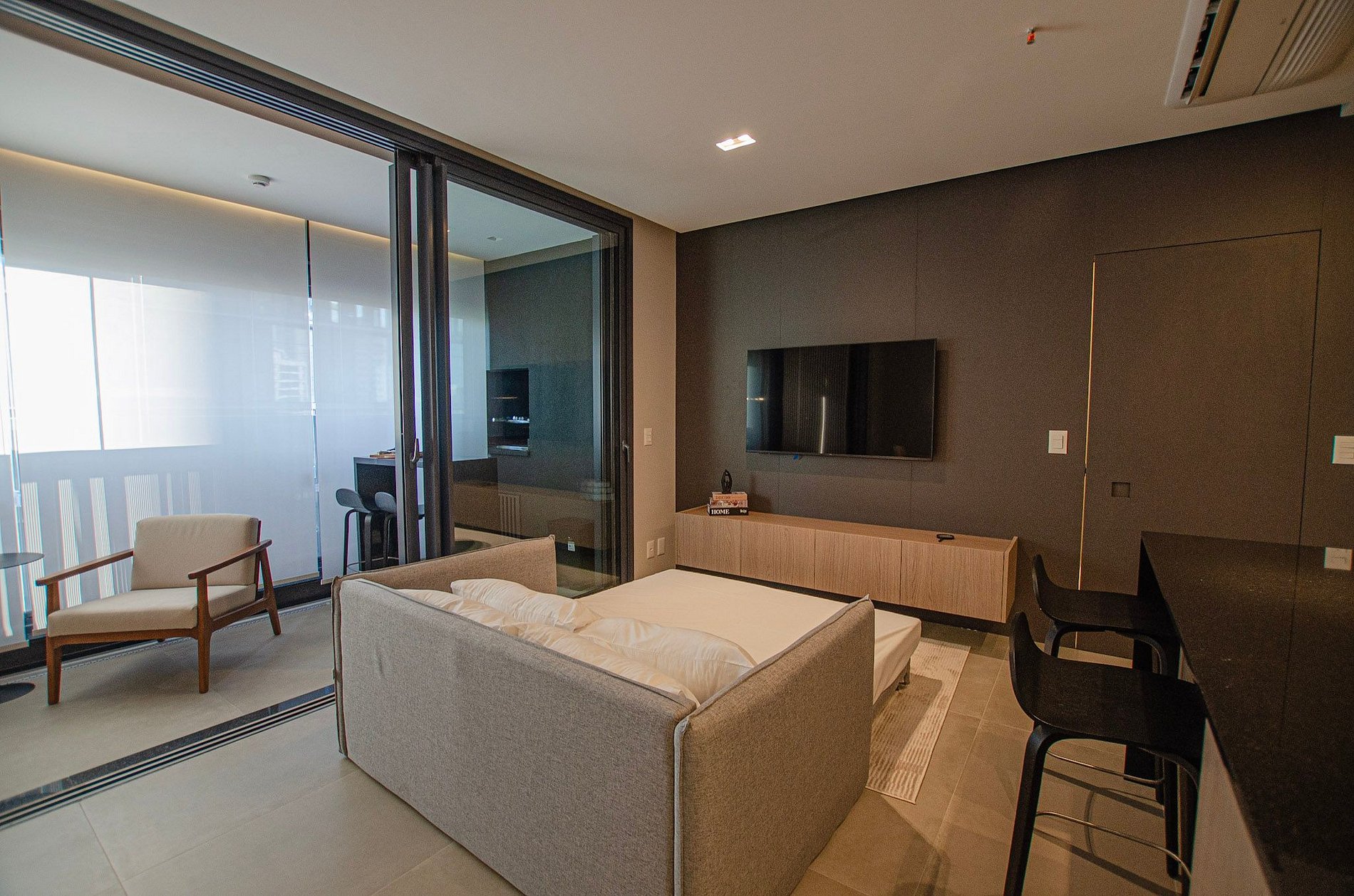 Na sala, você encontra um sofá-cama queen size da Ortobom e TV Smart. Ressaltamos que não disponibilizamos login para plataformas de streaming.