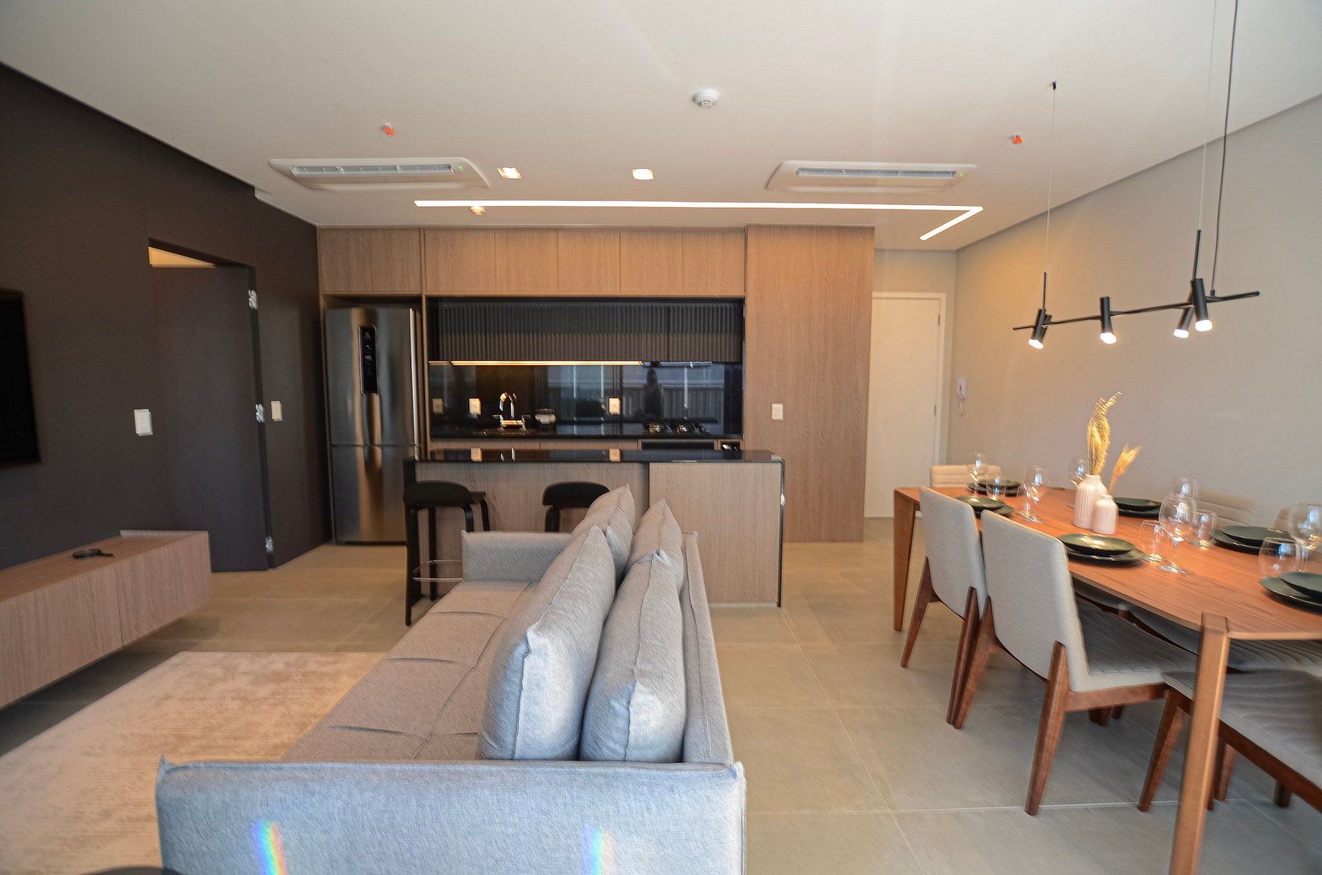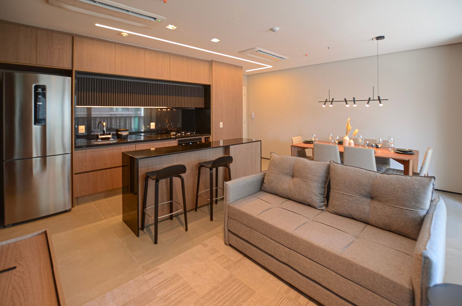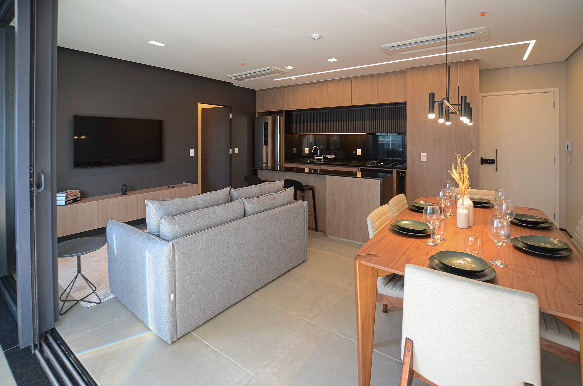 Na sala, você encontra um sofá-cama queen size da Ortobom e TV Smart. Ressaltamos que não disponibilizamos login para plataformas de streaming.
