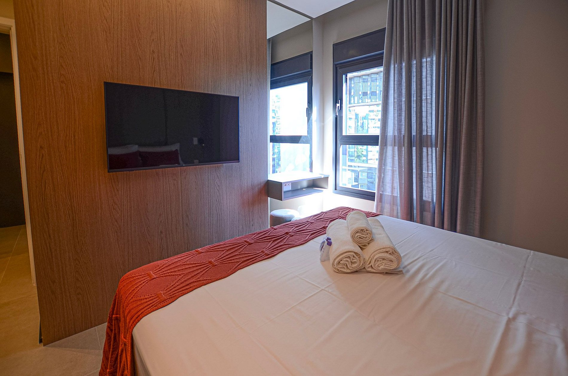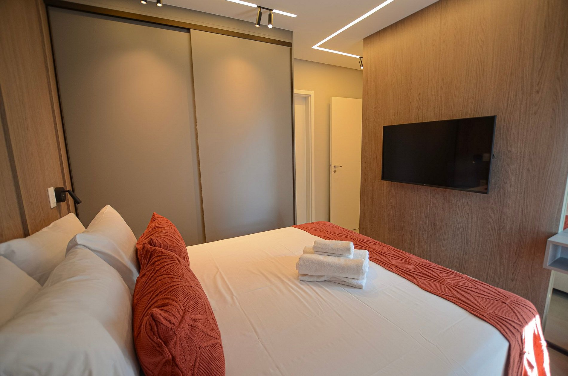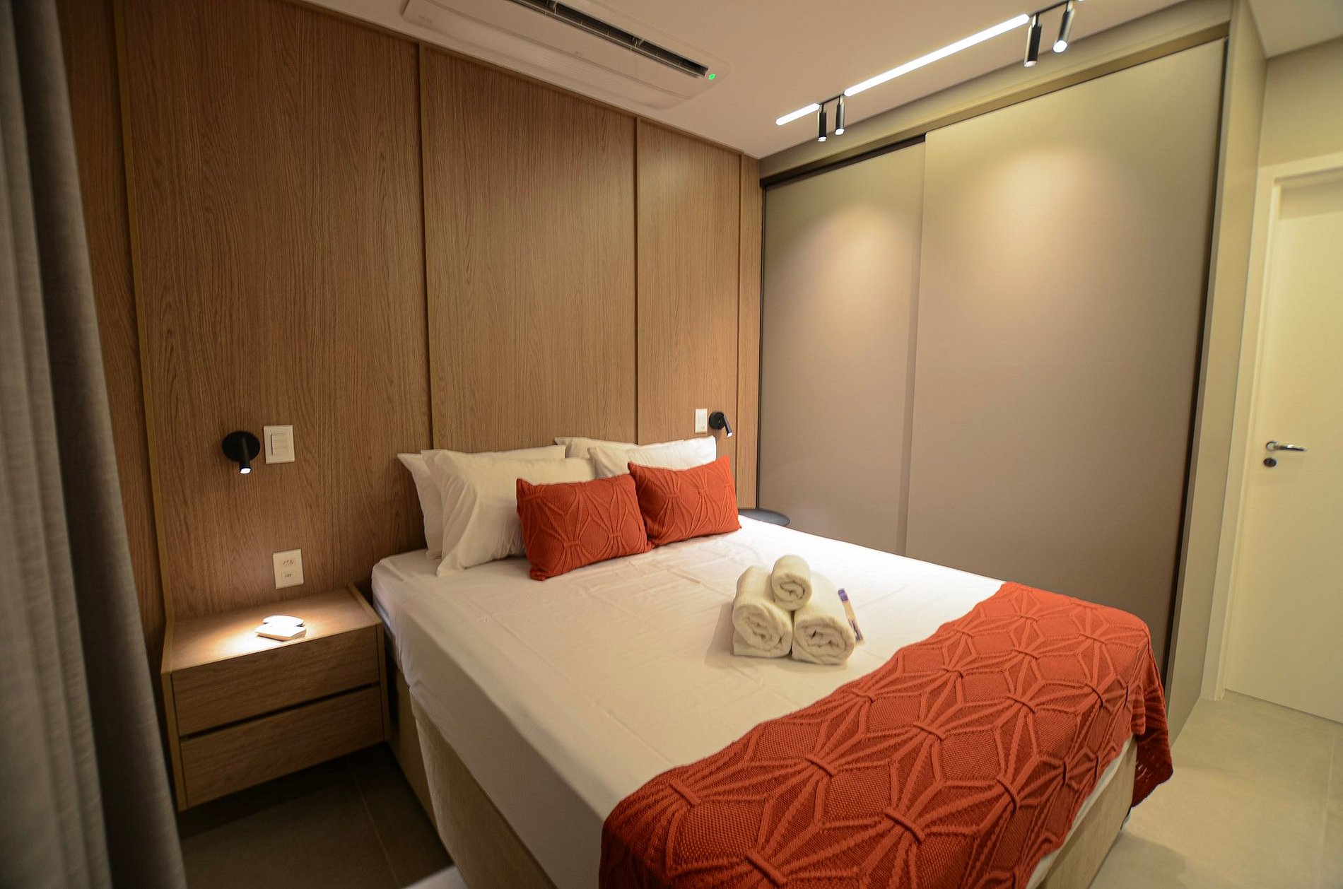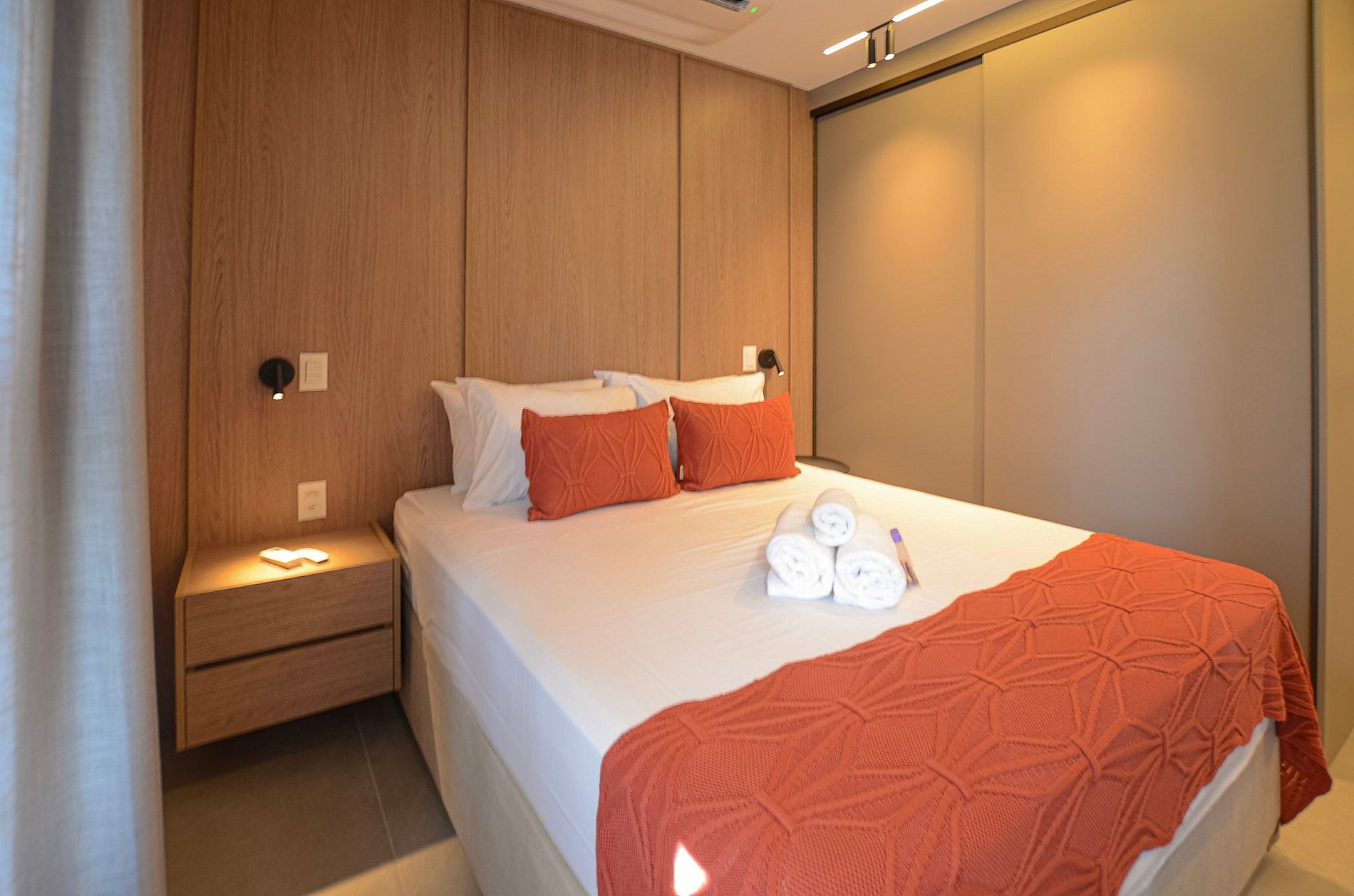 Suíte – Cama queen size, armário espaçoso com cabides, TV Smart, ar-condicionado, cortina blackout automatizada por controle e banheiro completo.