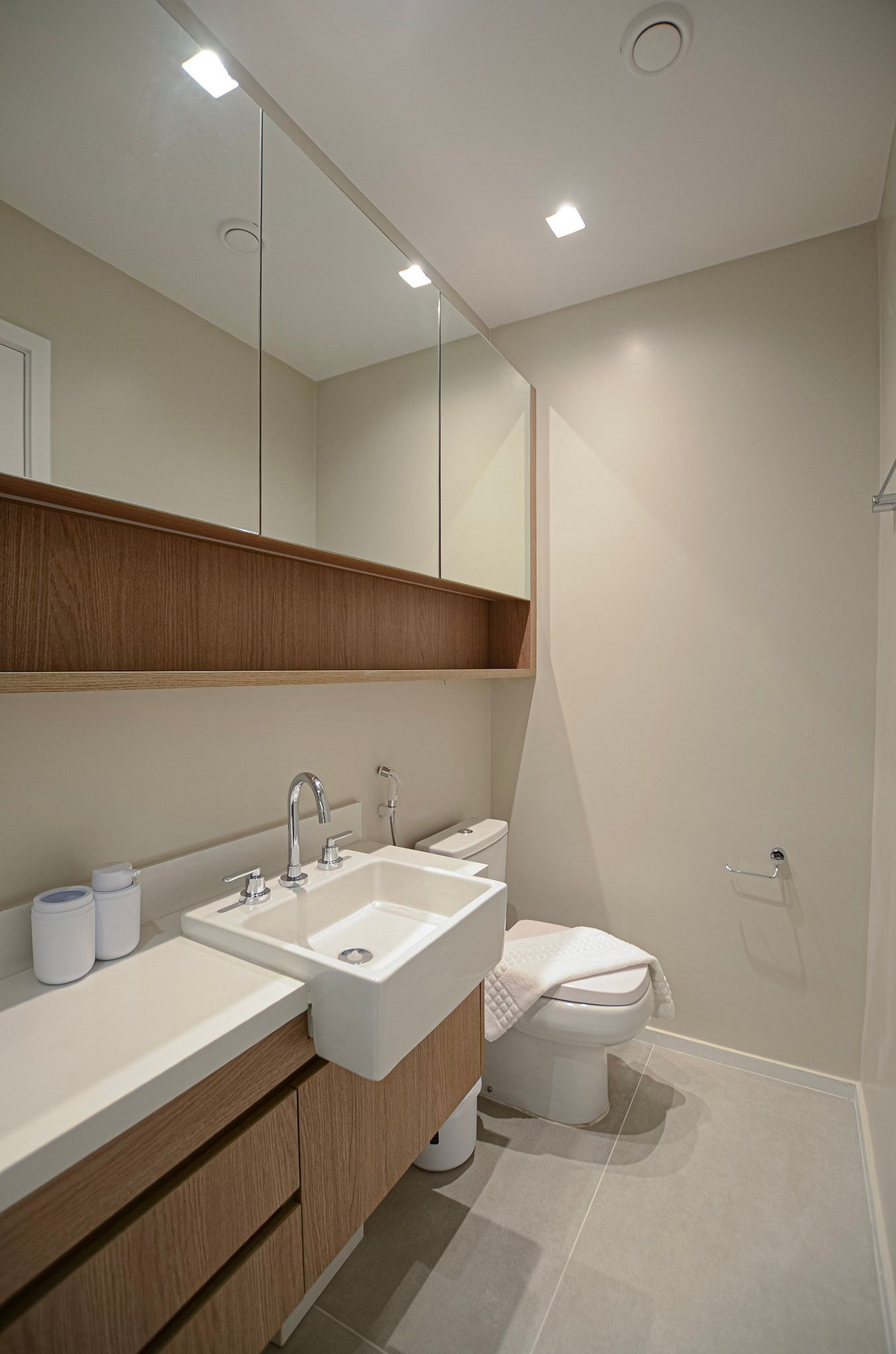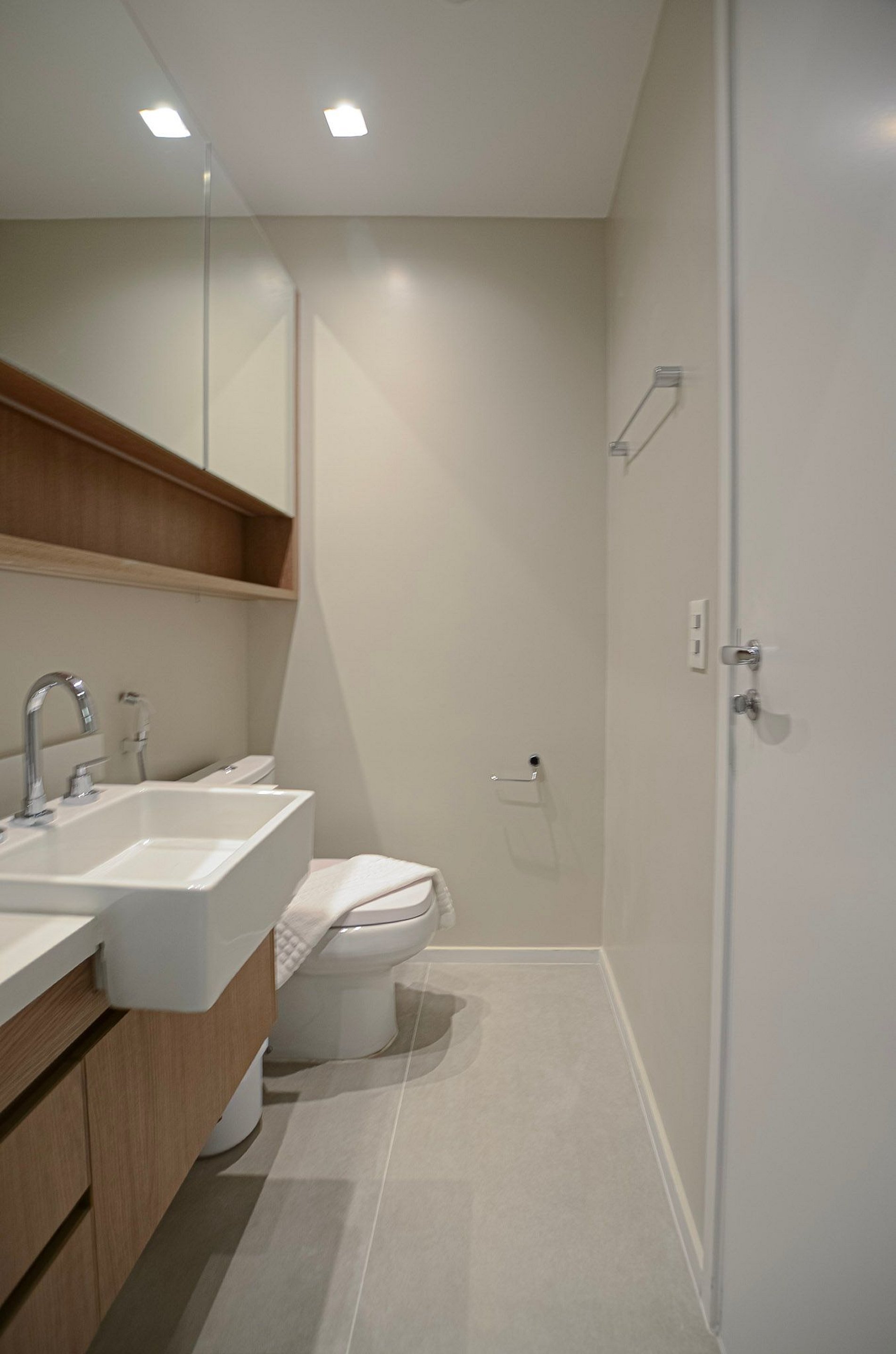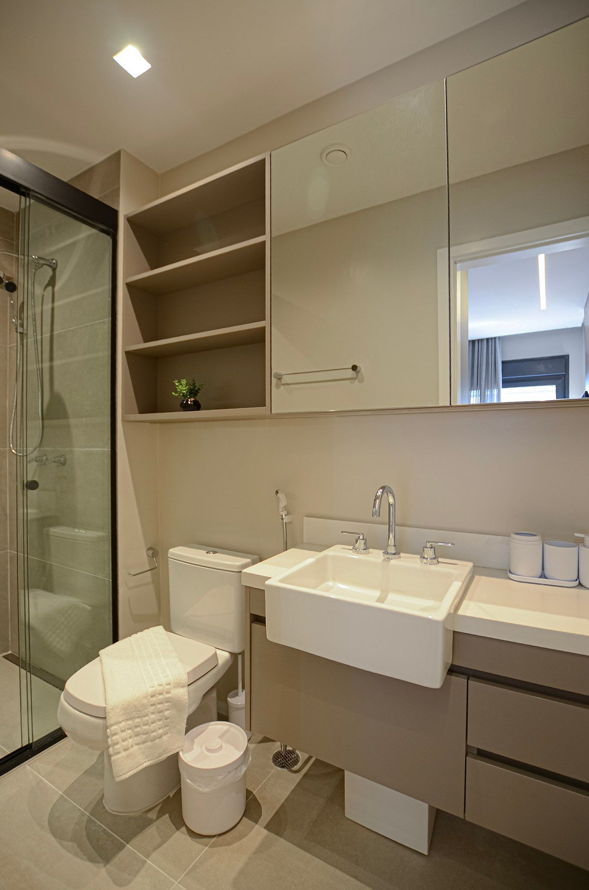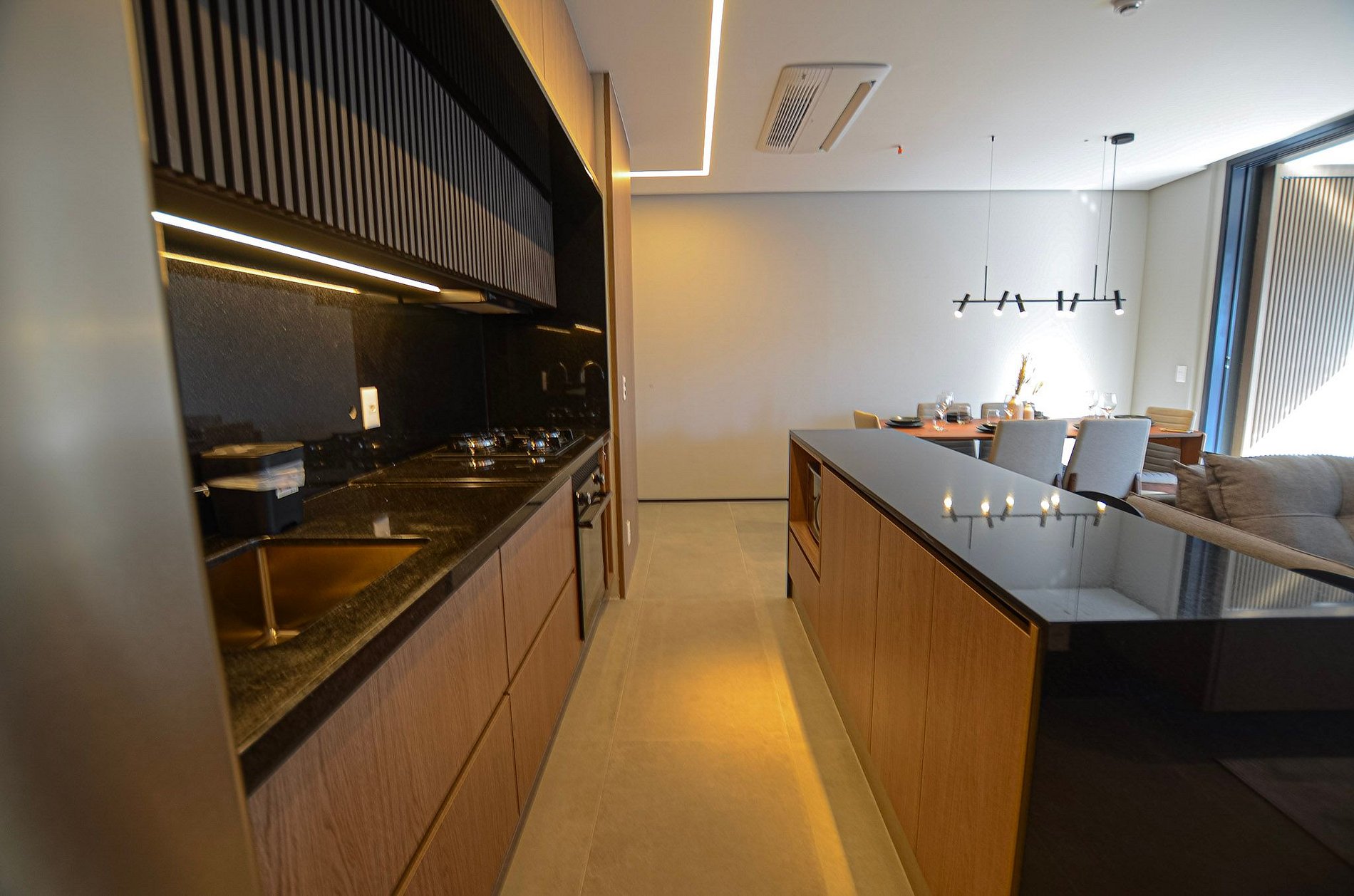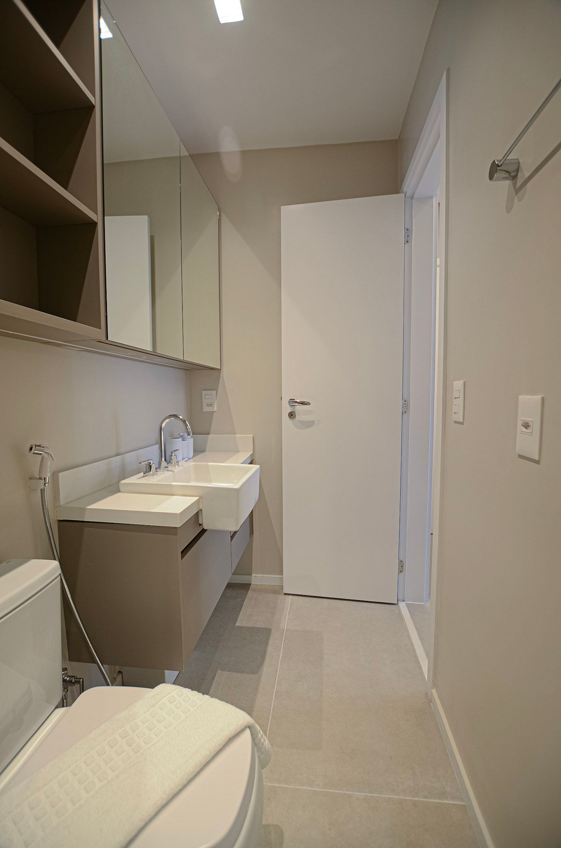 Suíte – Cama queen size, armário espaçoso com cabides, TV Smart, ar-condicionado, cortina blackout automatizada por controle e banheiro completo.