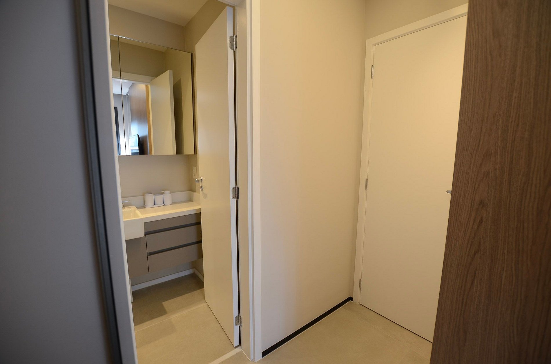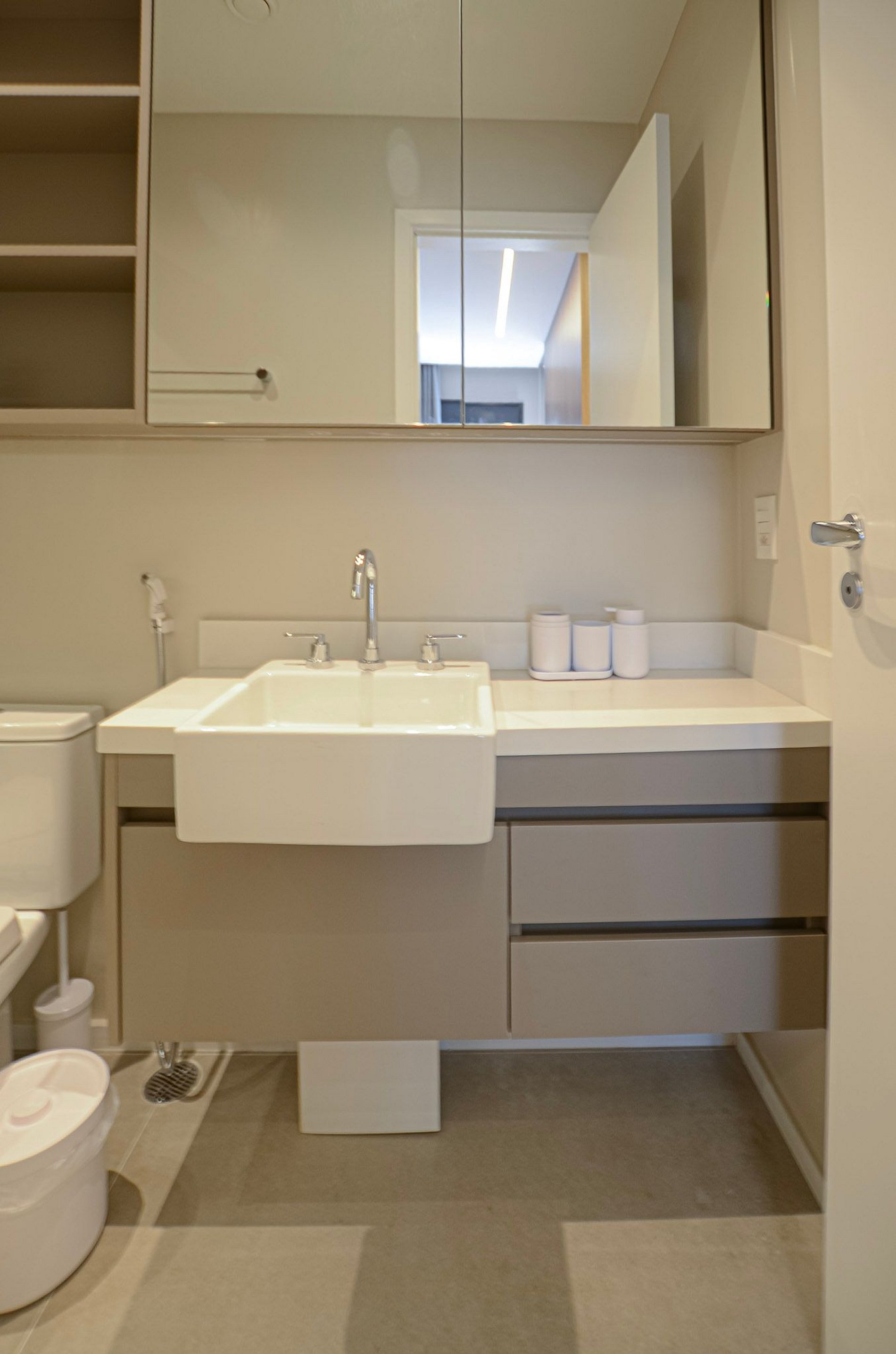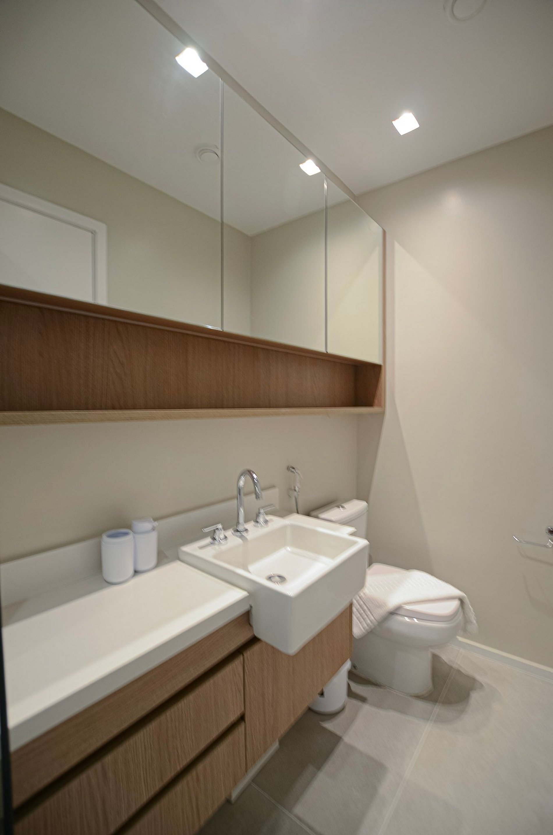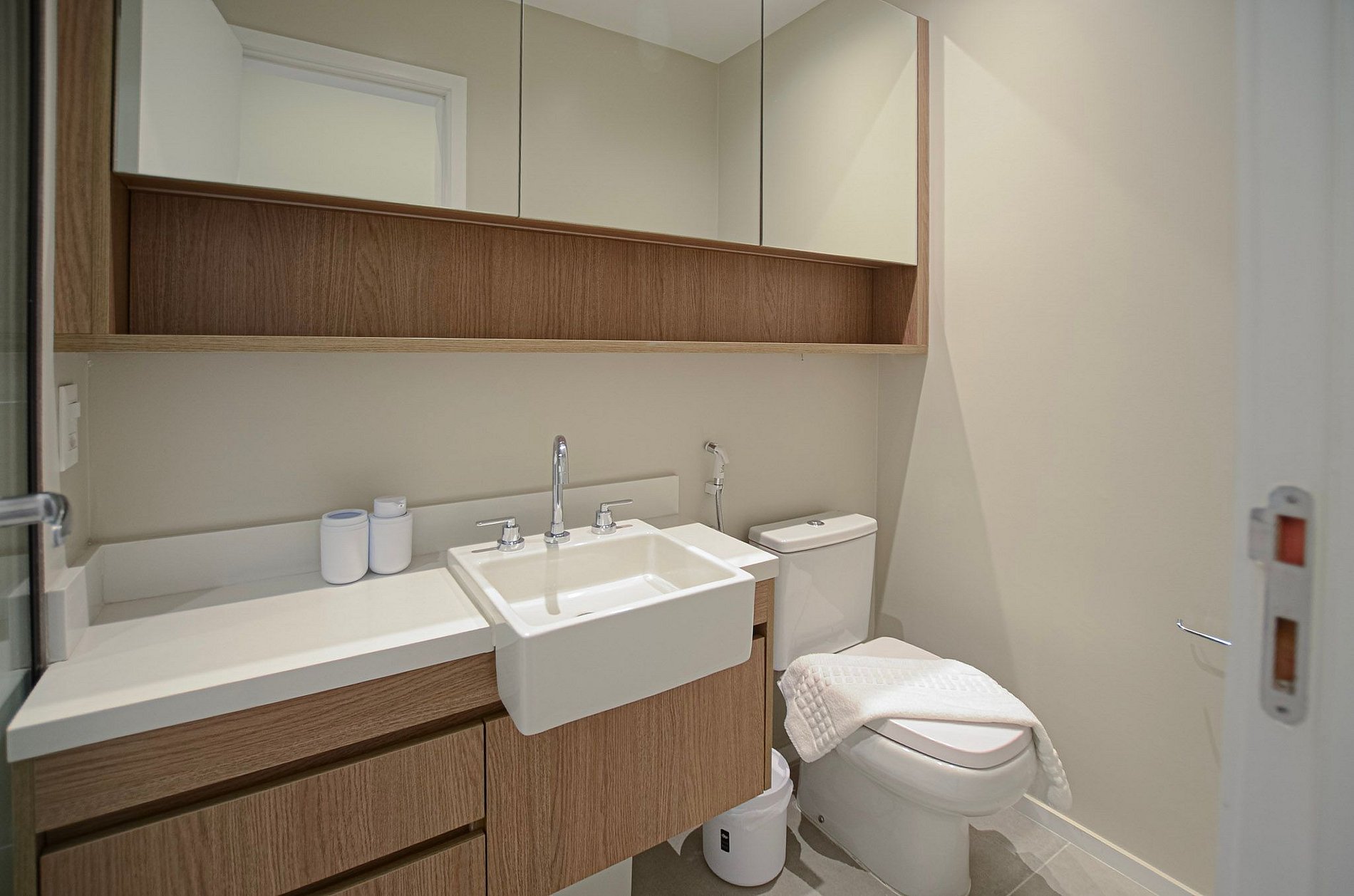 Suíte – Cama queen size, armário espaçoso com cabides, TV Smart, ar-condicionado, cortina blackout automatizada por controle e banheiro completo.