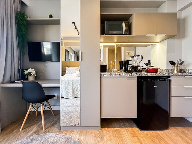 Oferecemos tudo o que você precisa! Desde jogo de cama/banho até utensílios do dia a dia. - Internet Wi-Fi 250 Mbps - Smart TV (Não fornecemos acesso de login em plataformas de streaming) - Cozinha equipada - Roupas de cama - Toalhas - Ar-condicionado - Portaria 24 horas - Condomínio conta com academia, lavanderia, piscina, e espaço de co-working