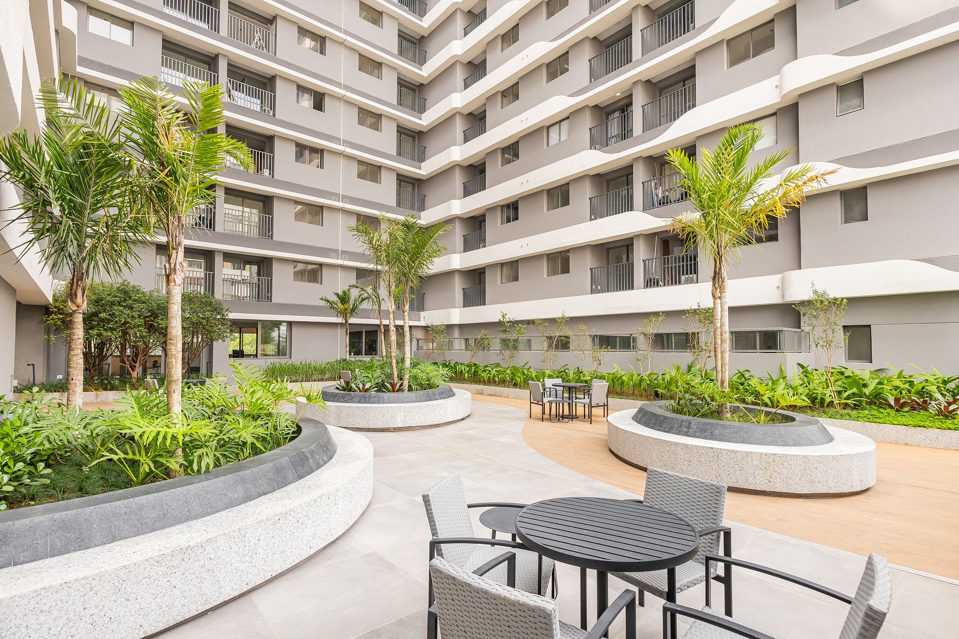 • Pátio/jardim interno arborizado, com paisagismo e áreas de convivência ao ar livre.
