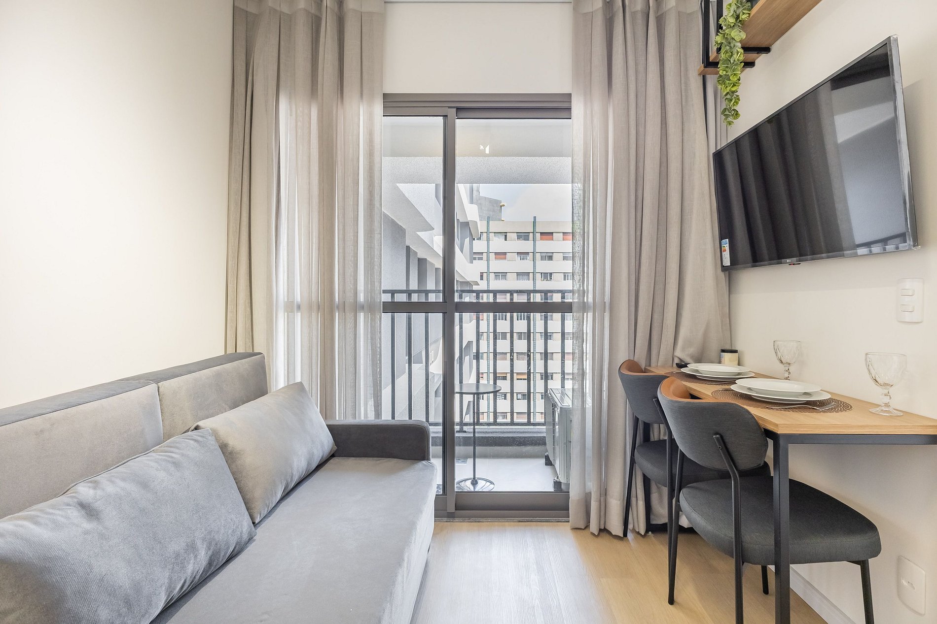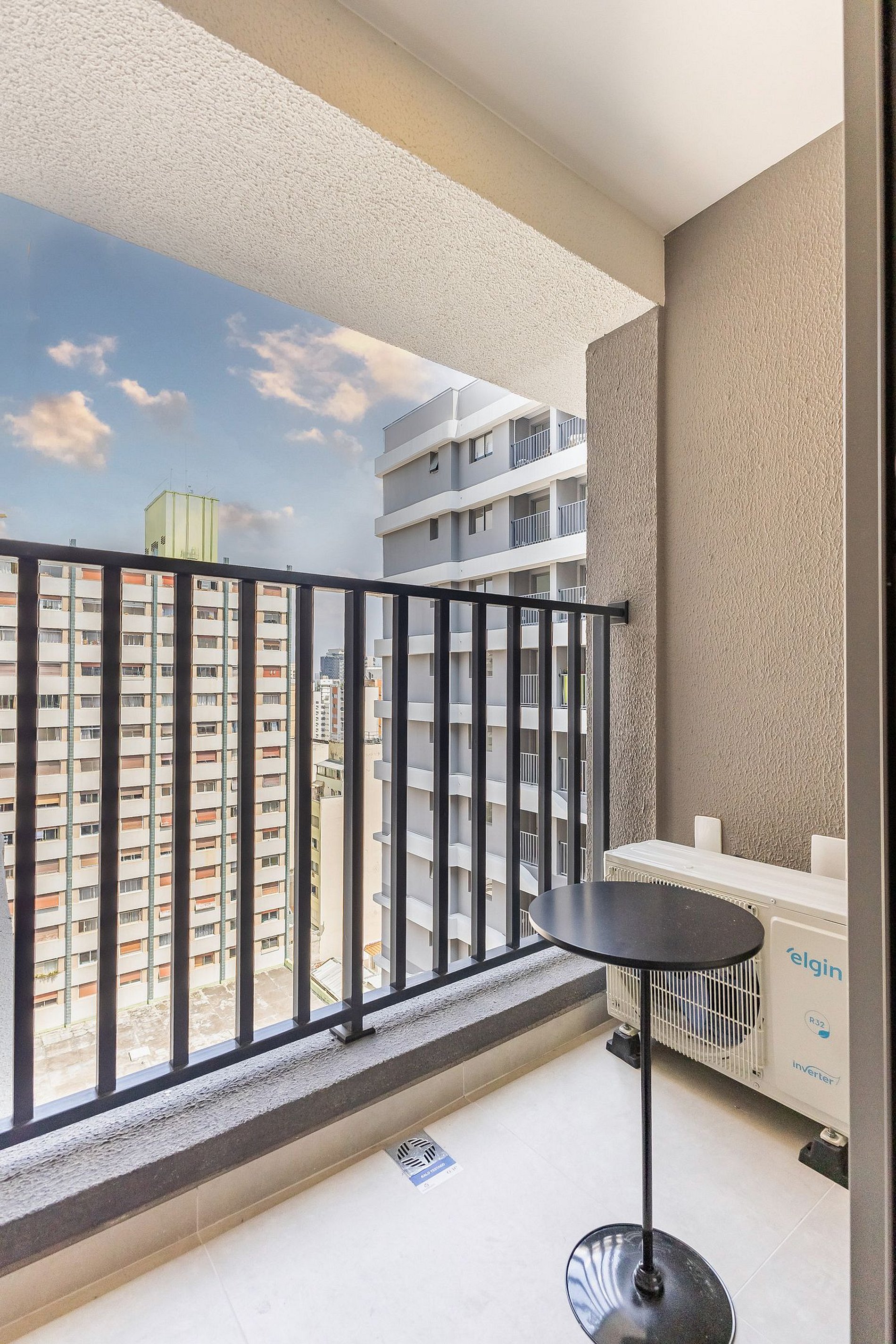 O apartamento também dispõe de ar-condicionado (somente refrigeração) e de uma varanda charmosa, que deixa o ambiente mais agradável com a entrada de luz natural.