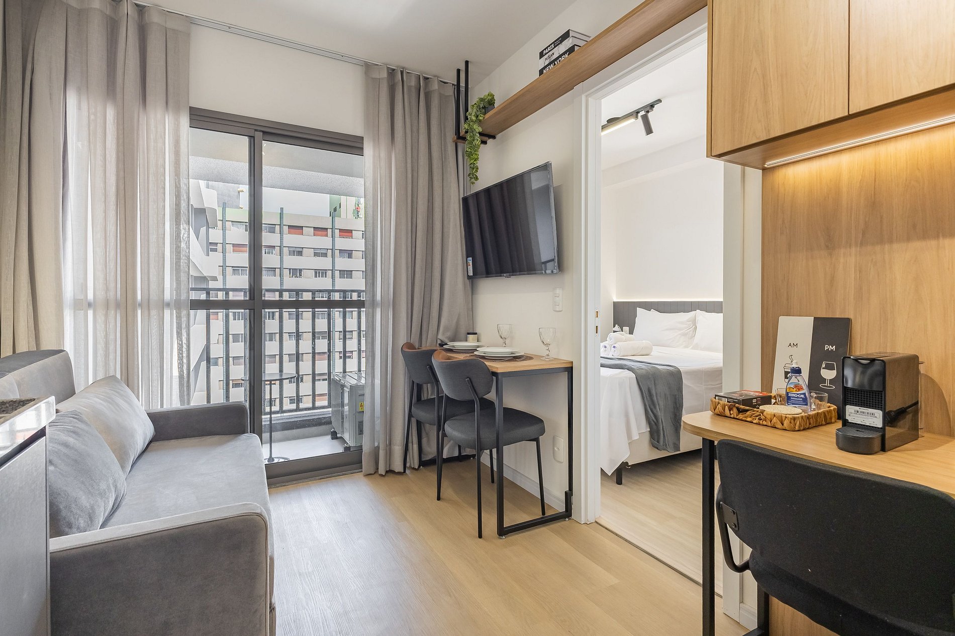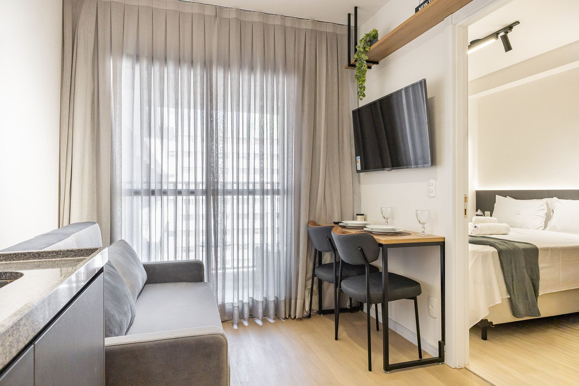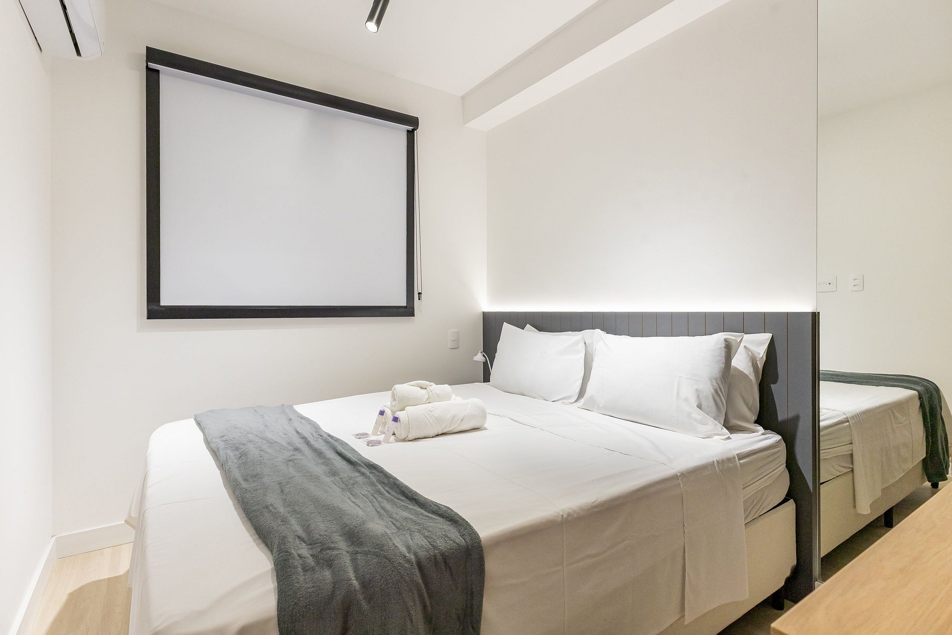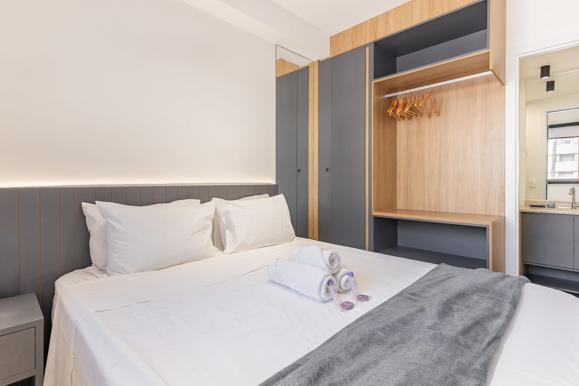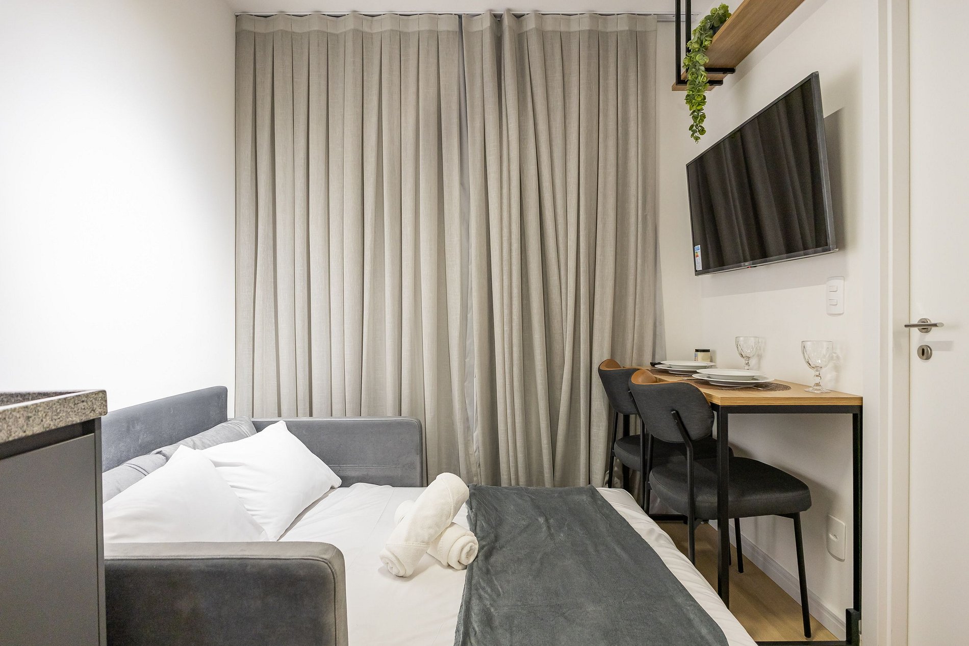 Acomodando até quatro pessoas, o espaço oferece uma cama queen-size no dormitório e um sofá-cama de casal na sala, além de um enxoval de cama e banho fornecido no início da estadia (sem trocas ou reposições).