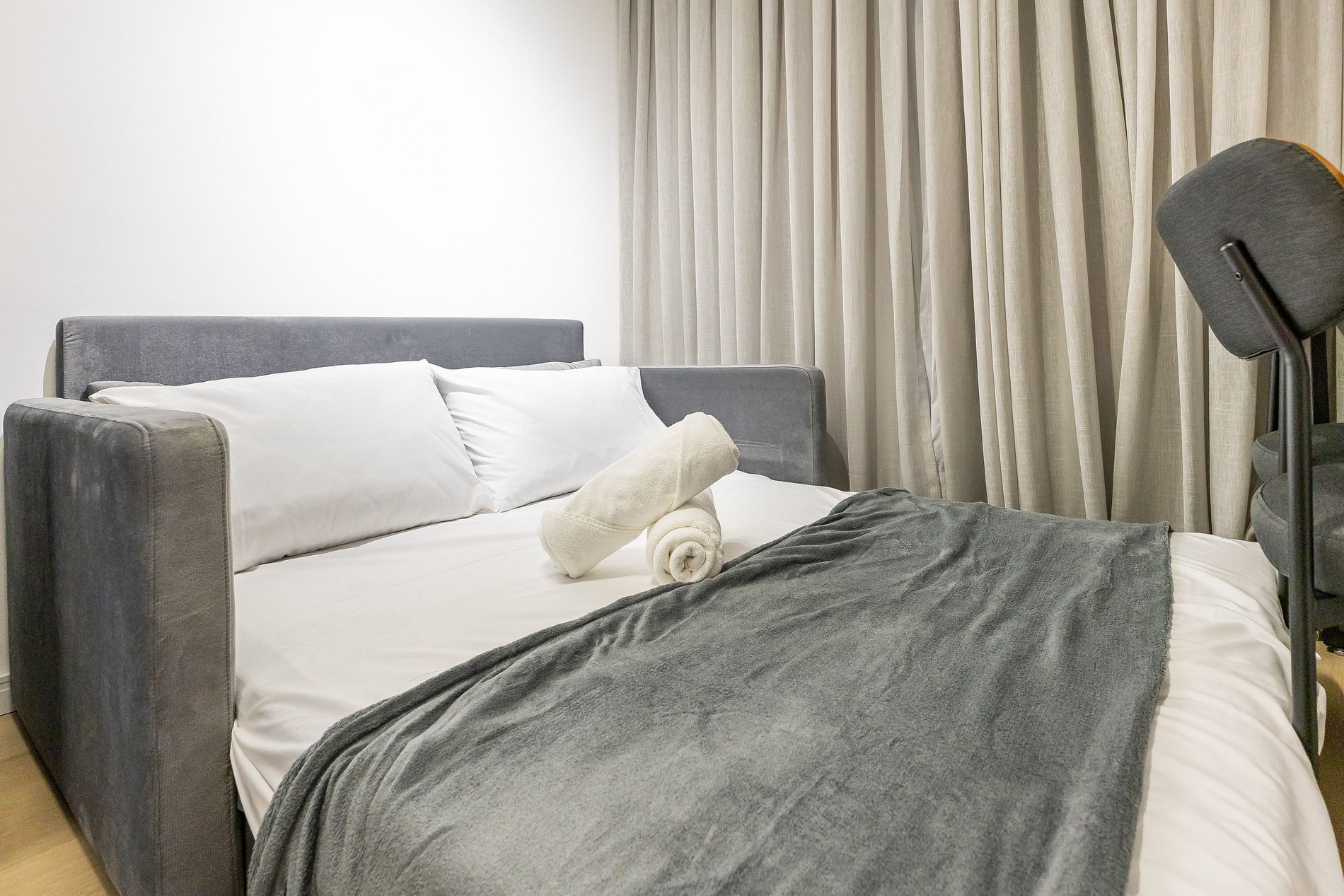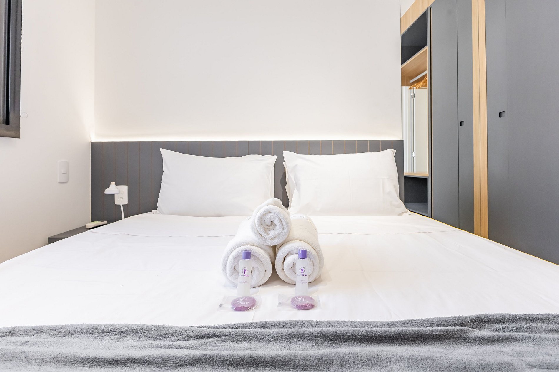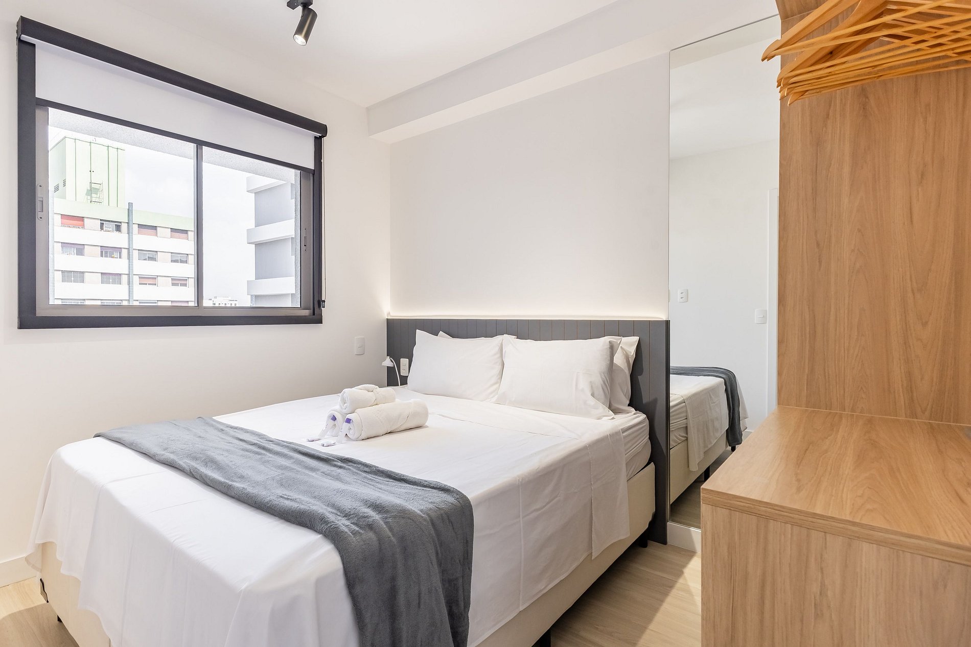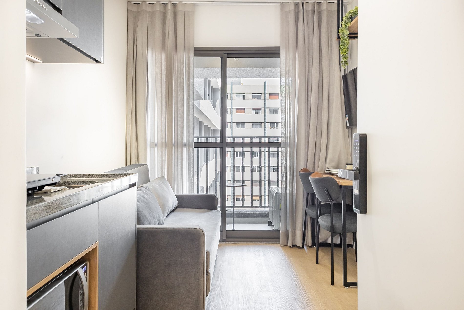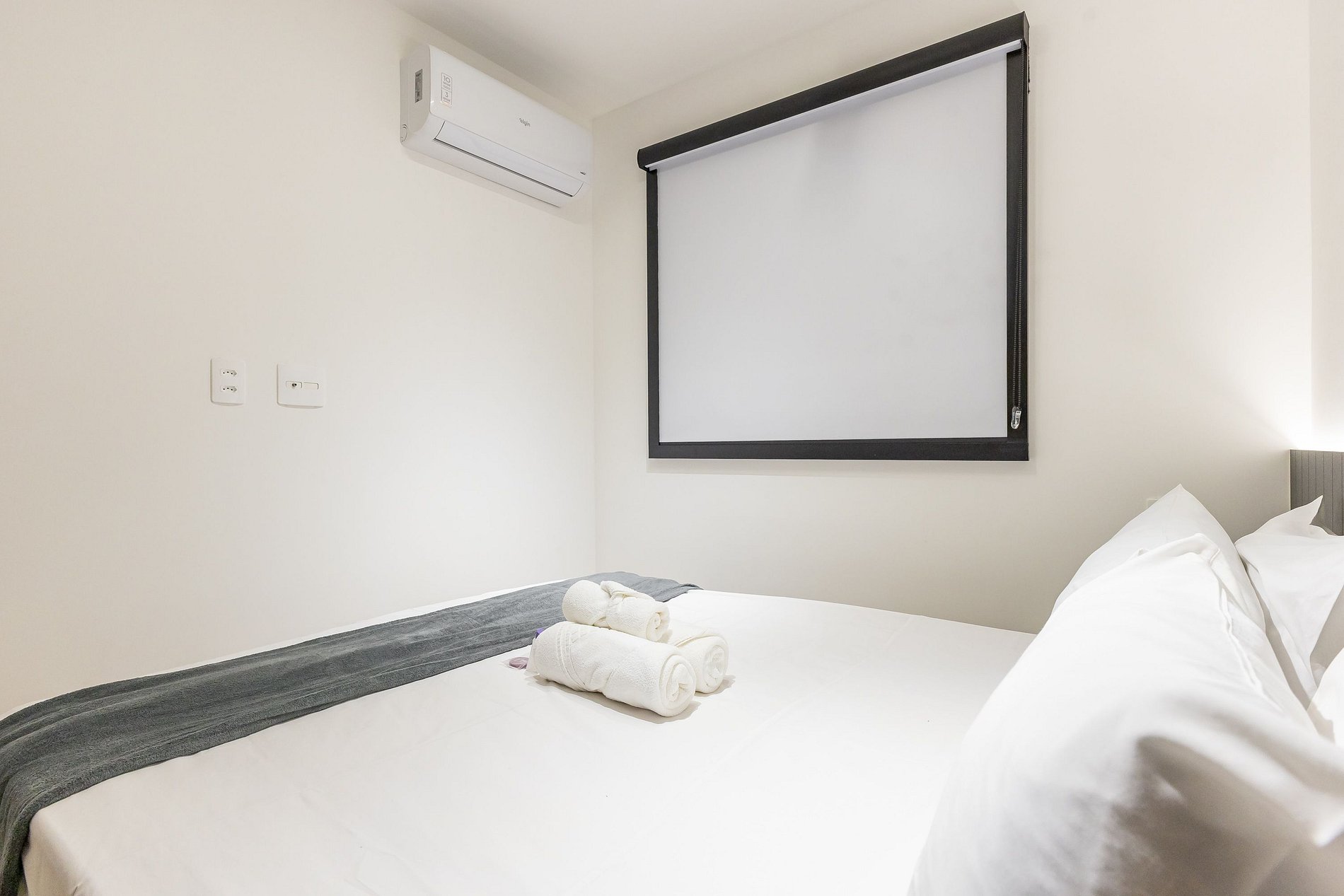 Acomodando até quatro pessoas, o espaço oferece uma cama queen-size no dormitório e um sofá-cama de casal na sala, além de um enxoval de cama e banho fornecido no início da estadia (sem trocas ou reposições).