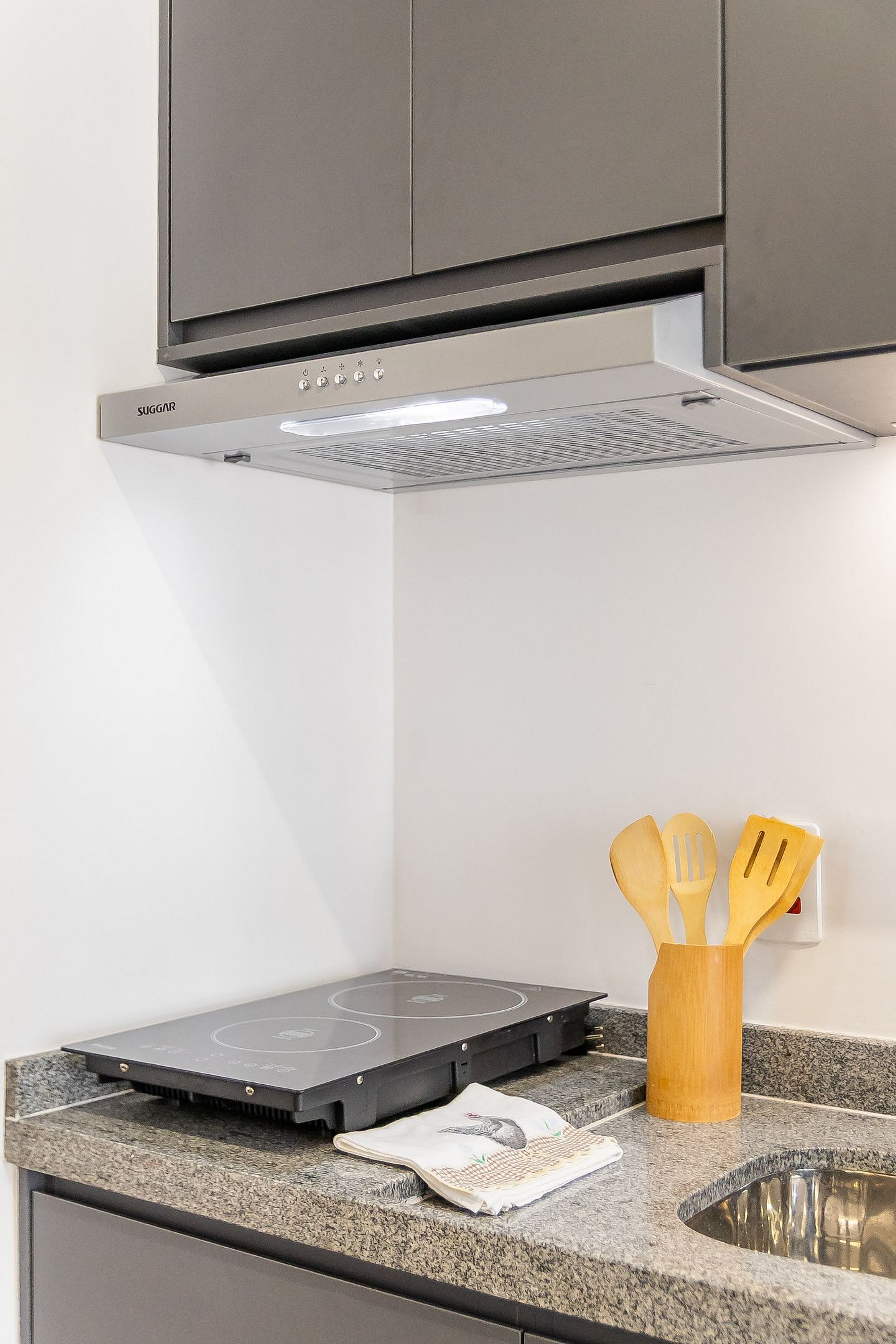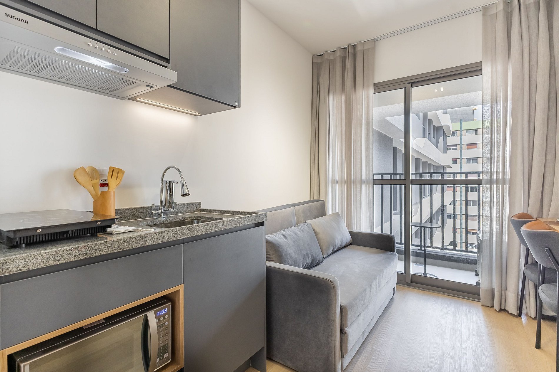 A cozinha equipada com itens básicos permite o preparo de pequenas refeições, garantindo mais autonomia no dia a dia.