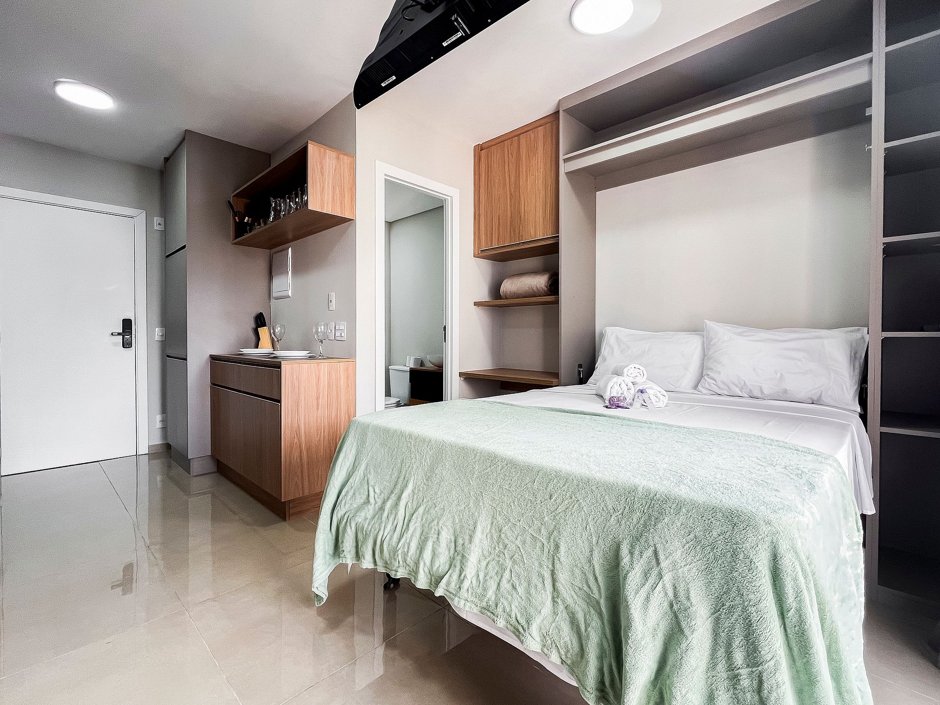 - O condomínio ainda conta com academia, lavanderia, rooftop, espaço co-working, área pet e salão de jogos