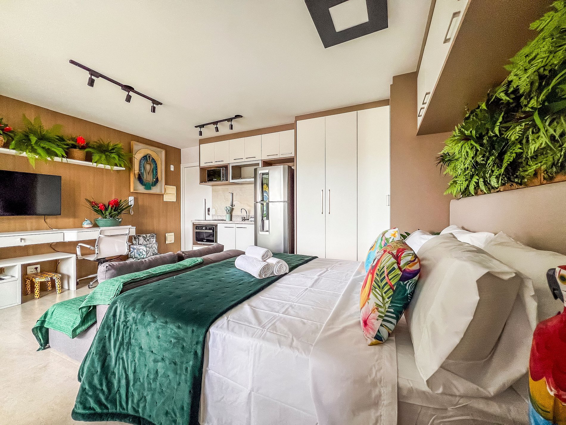 Com 1 dormitório e cama de casal, acomoda até duas pessoas. O ambiente combina modernidade e identidade nacional, criando uma atmosfera única. Próximo a bares, galerias de arte e cafés, oferece fácil acesso aos comércios locais, garantindo uma estadia autêntica e inesquecível.