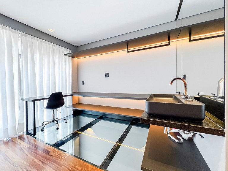 A suíte elegante conta com uma cama queen extremamente confortável, espaço de trabalho e um banheiro integrado com banheira nova, proporcionando momentos de relaxamento. O apartamento dispõe ainda de 1 vaga de garagem coberta.