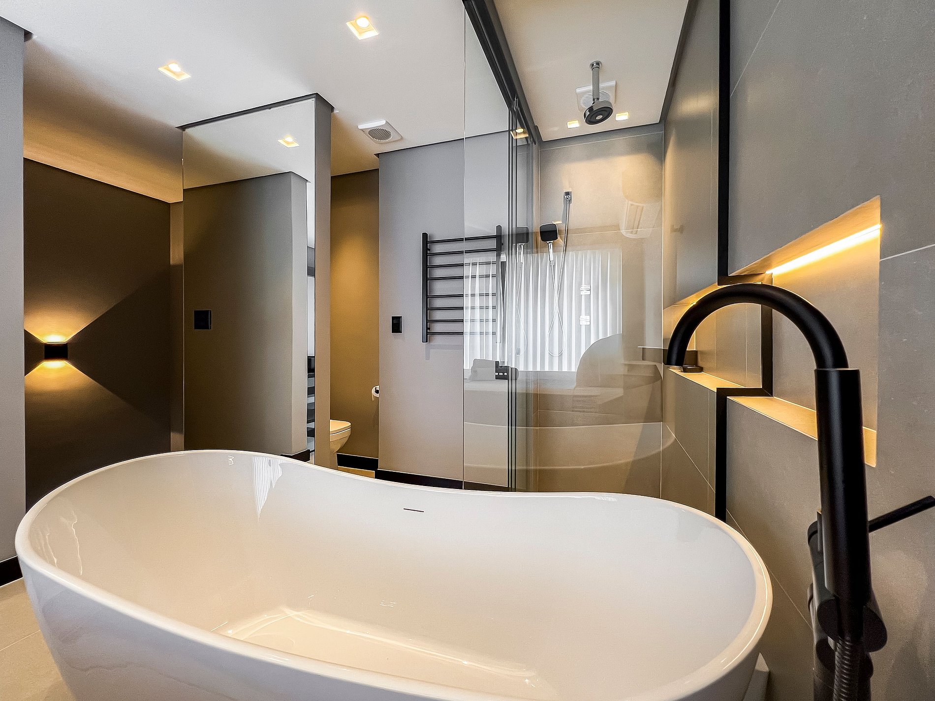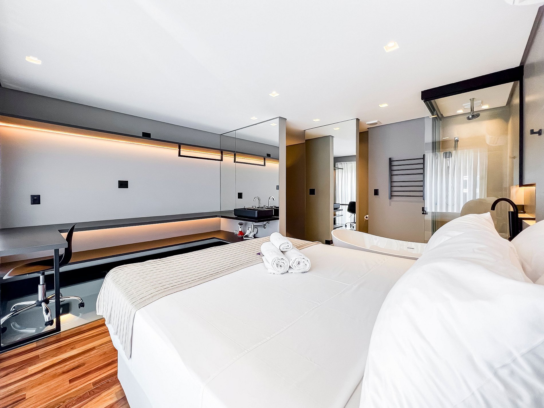A suíte elegante conta com uma cama queen extremamente confortável, espaço de trabalho e um banheiro integrado com banheira nova, proporcionando momentos de relaxamento. O apartamento dispõe ainda de 1 vaga de garagem coberta.