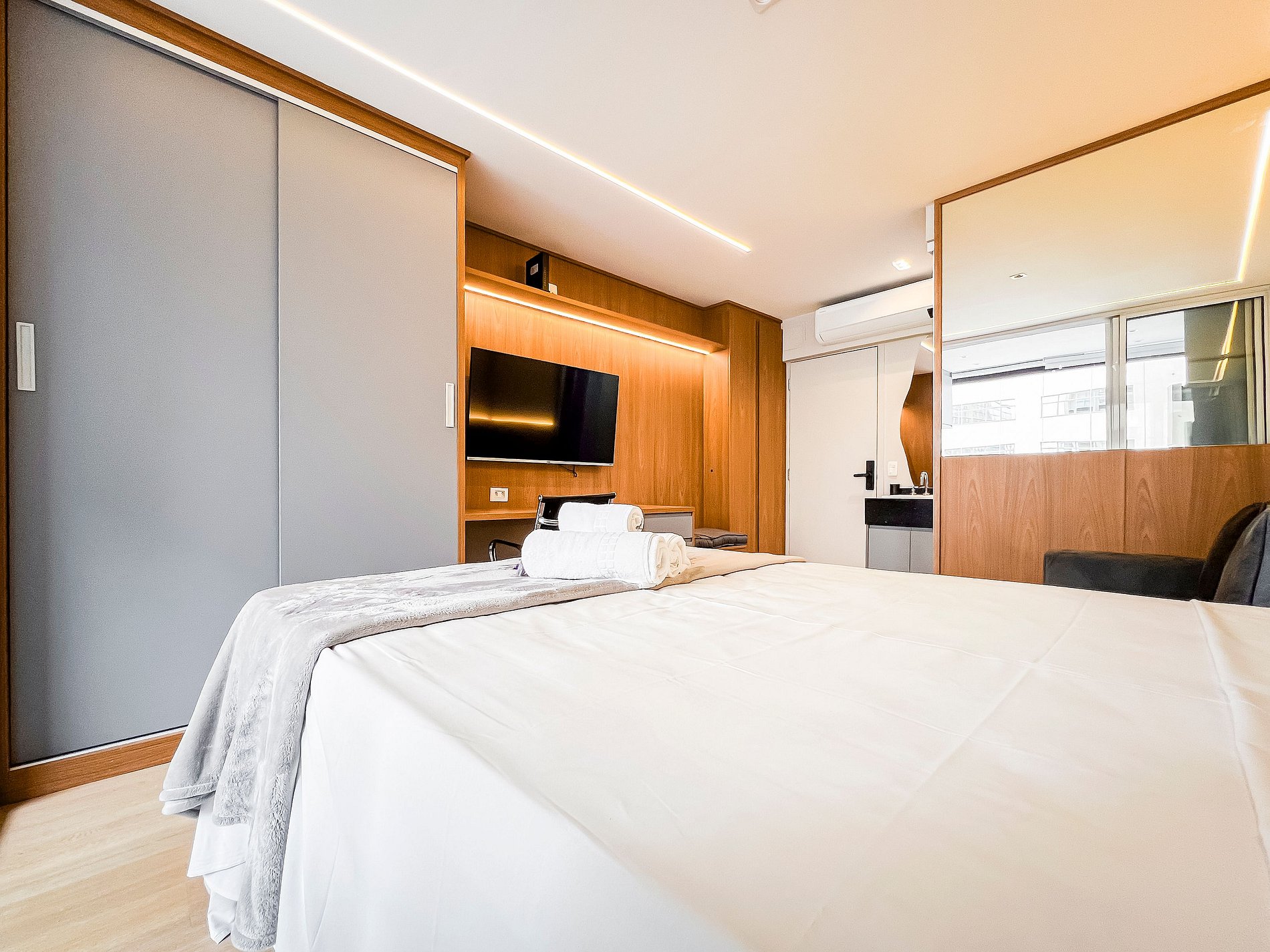 - O condomínio ainda conta com piscina, academia, lavanderia, espaço de co-working, sauna e mini-mercado
