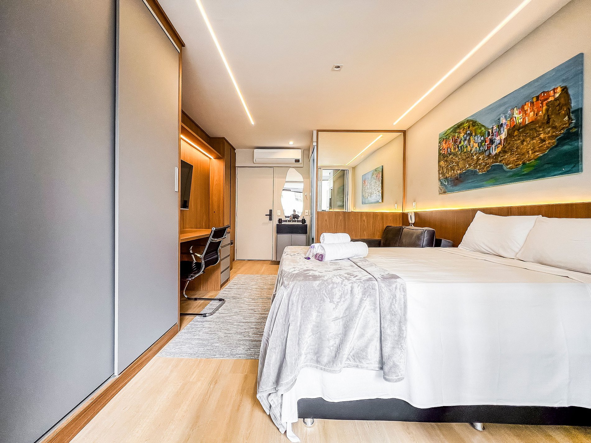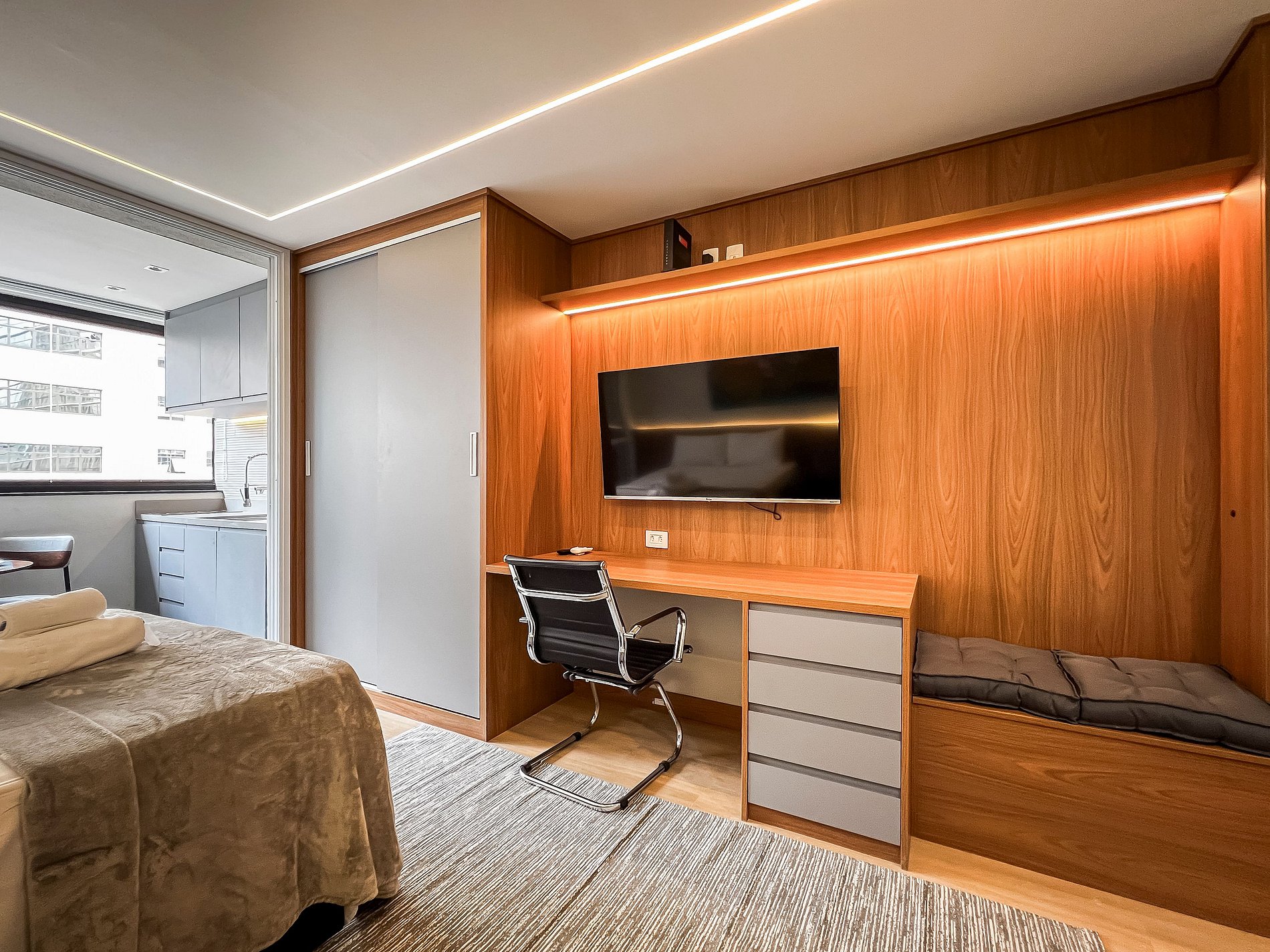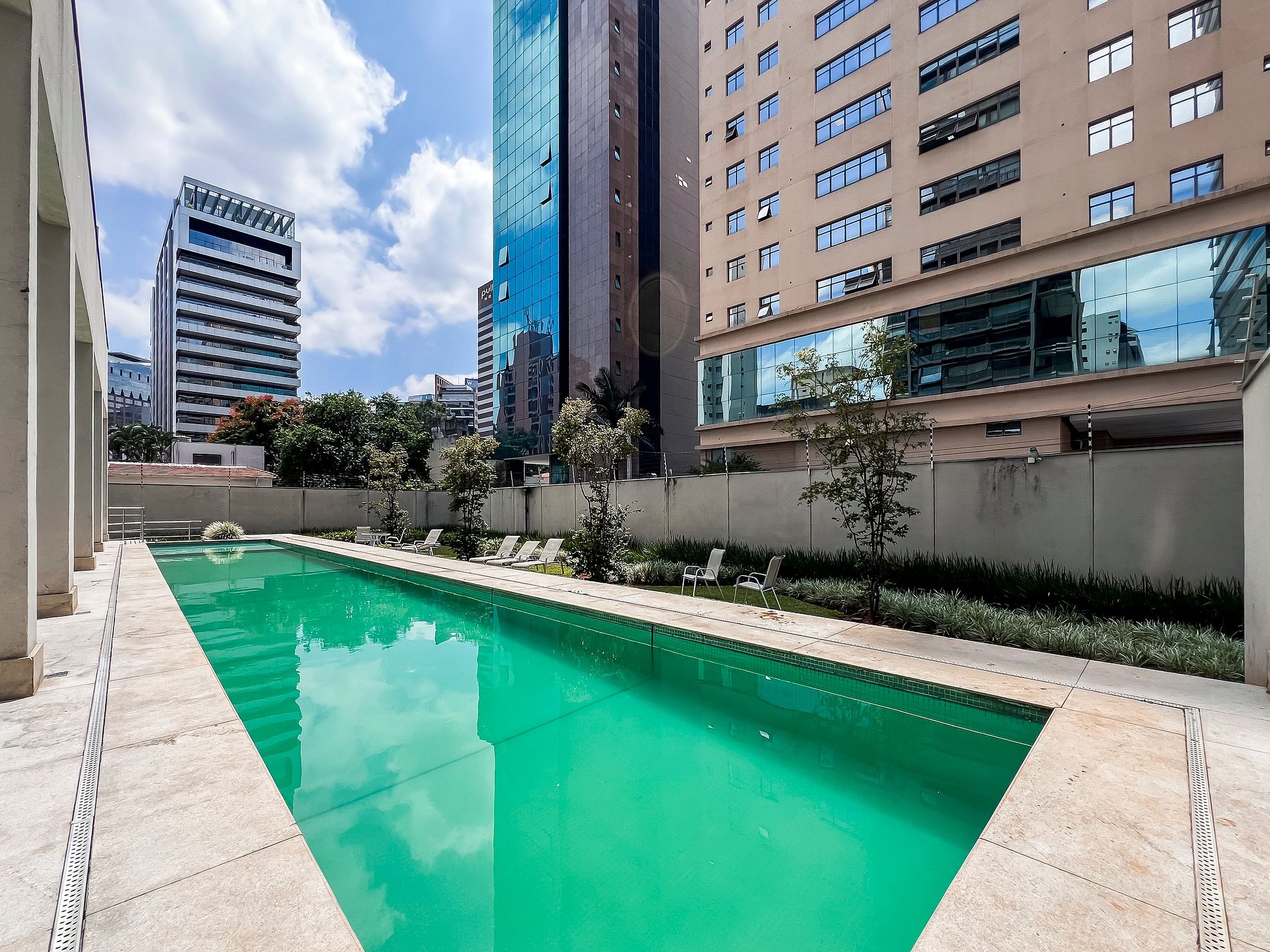 - O condomínio ainda conta com piscina, academia, lavanderia, espaço de co-working, sauna e mini-mercado