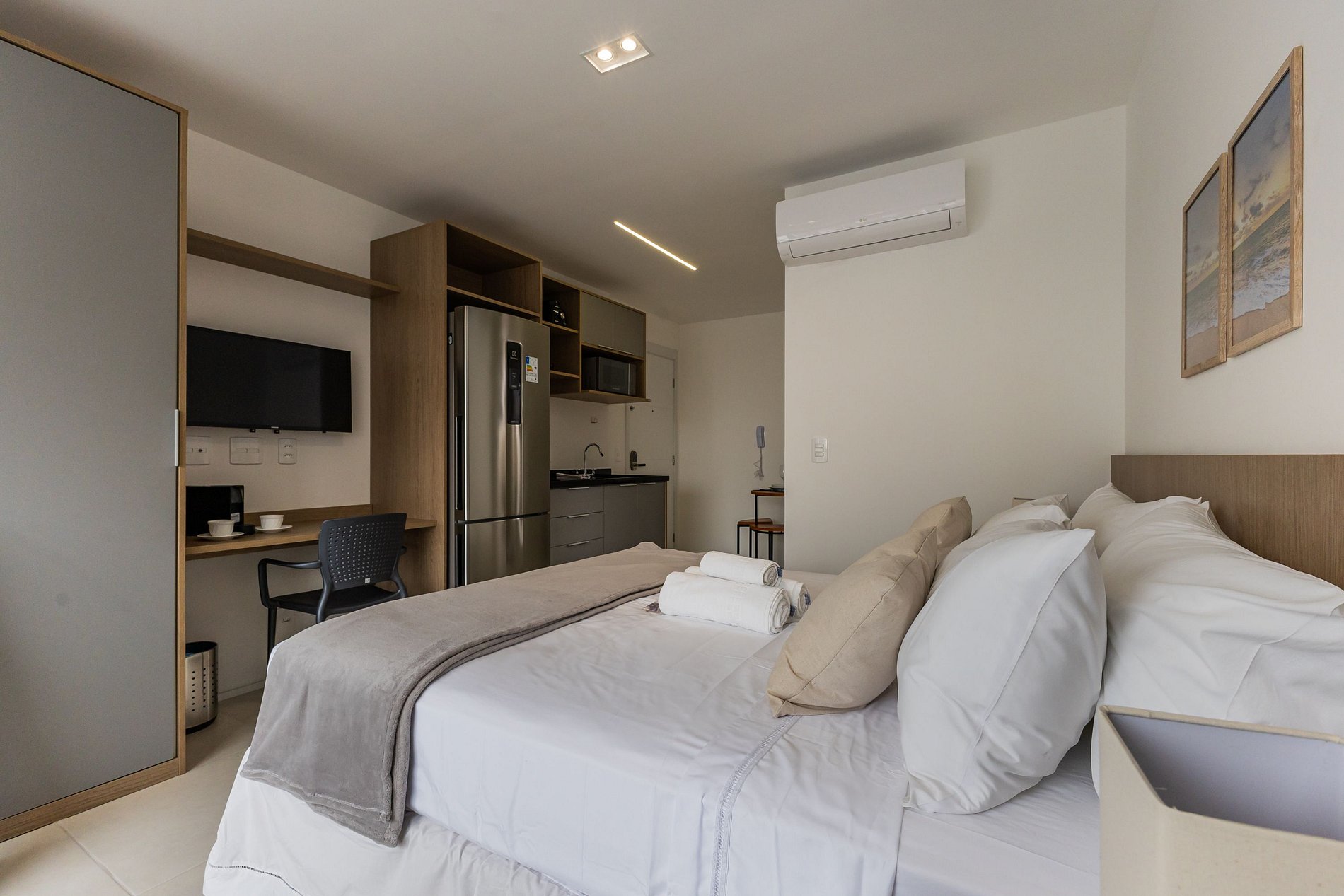 Conta com enxoval de cama e banho (sem reposição ou trocas), cozinha compacta com utensílios para o preparo de pequenas refeições e banheiro com secador de cabelo.