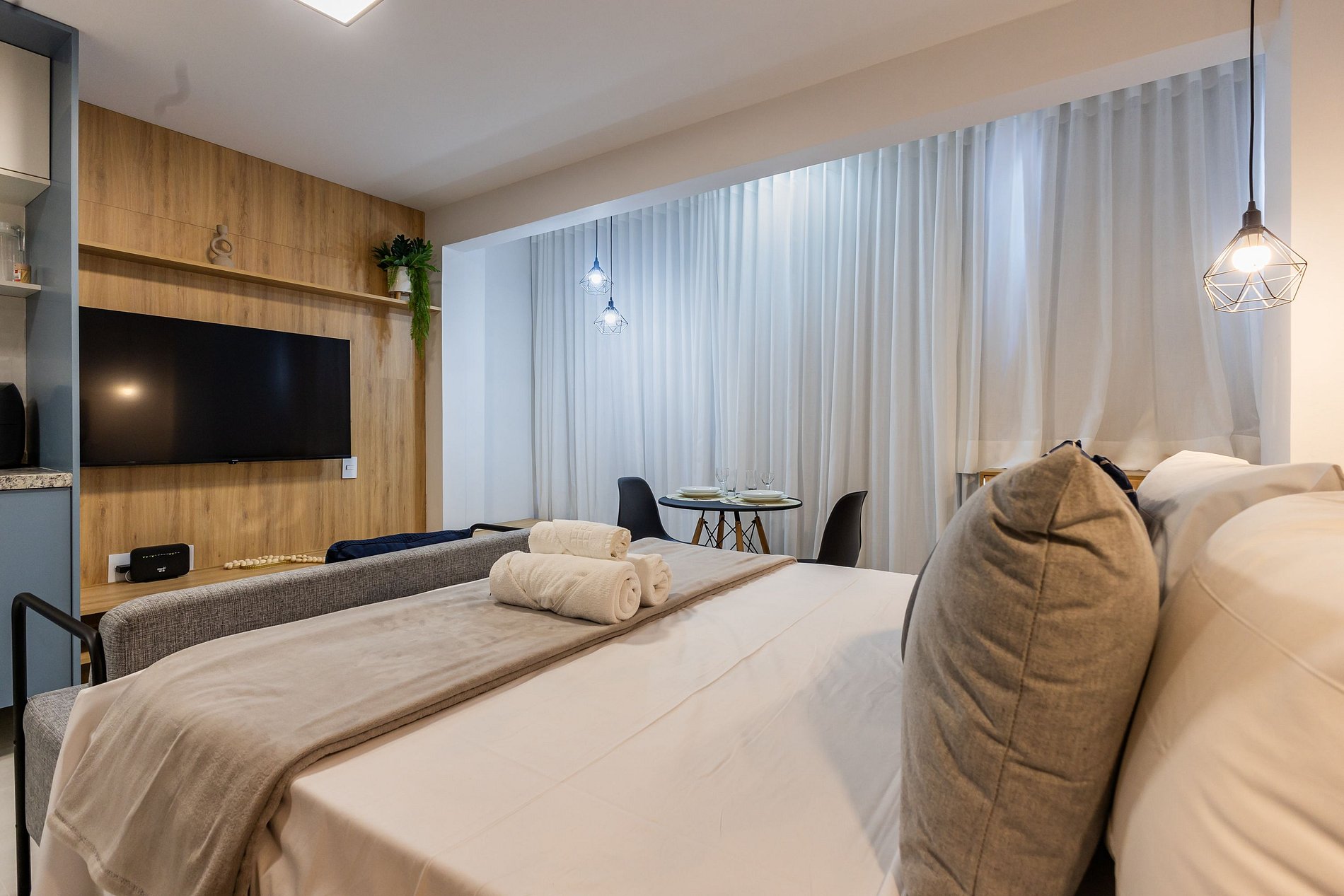 O apartamento foi planejado para trazer praticidade e uma estadia agradável. Você conta com internet Wi-Fi e TV Smart, lembrando apenas que não disponibilizamos login para as plataformas de streaming. Acomodando até três pessoas, o espaço oferece uma cama tamanho casal padrão e uma cama de solteiro acoplada no box da cama, com um enxoval de cama e banho fornecido no início da estadia, sem trocas ou reposições. A cozinha equipada com itens básicos permite o preparo de pequenas refeições, garantindo mais autonomia no dia a dia, inclusive, com um filtro de água.O apartamento também dispõe de ar-condicionado (somente refrigeração), com uma varanda charmosa, que deixa o ambiente mais agradável com a entrada de luz natural. Por fim, o banheiro com secador de cabelo traz ainda mais praticidade para a sua rotina.
