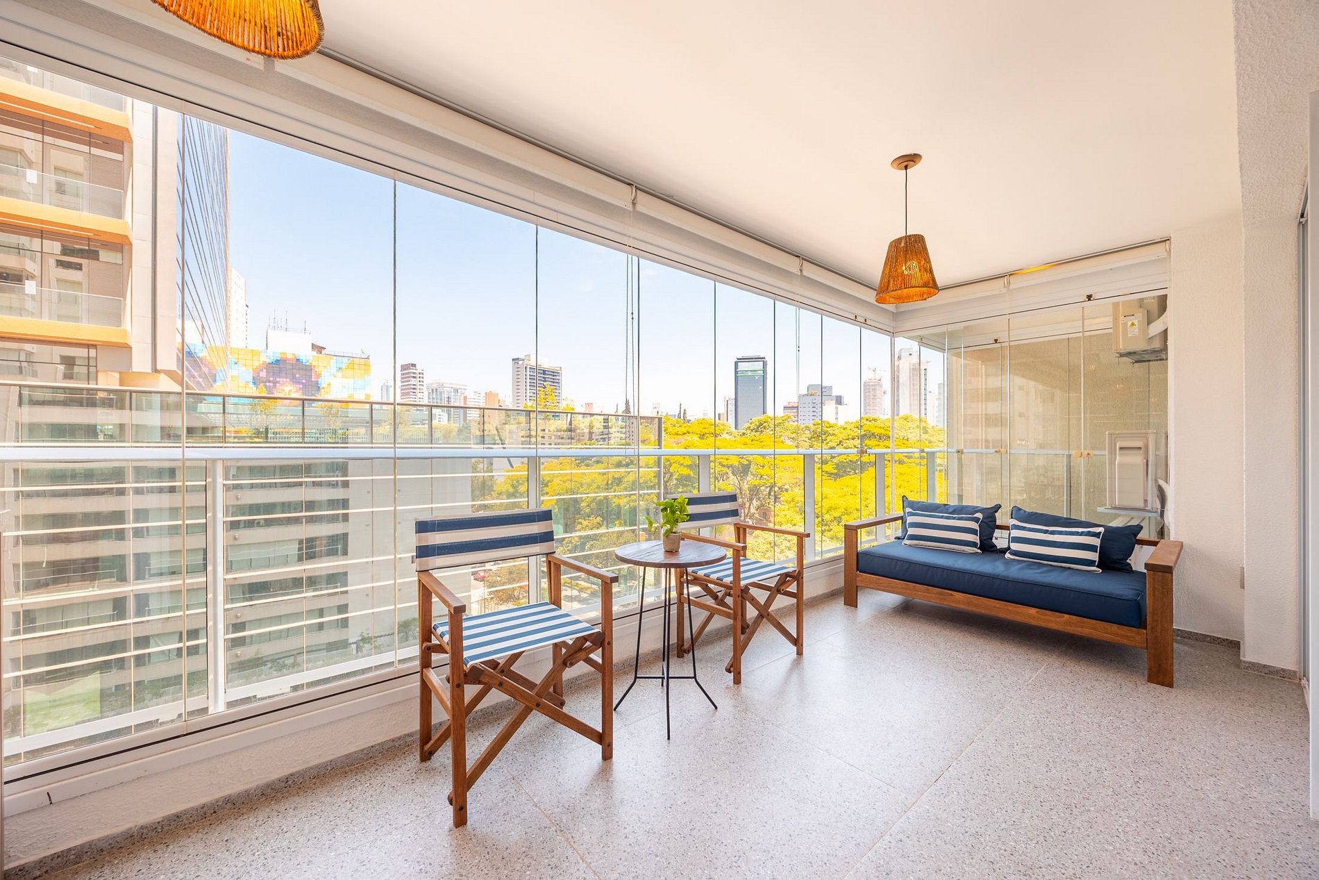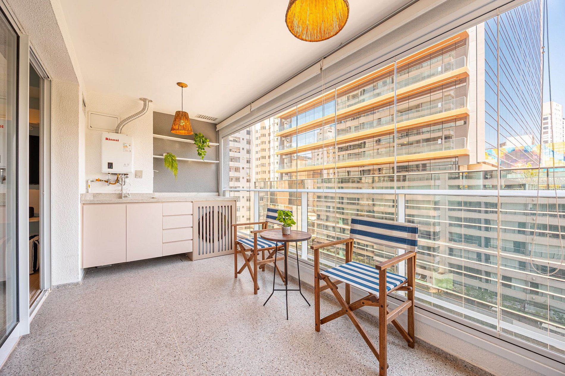A sala climatizada (somente refrigeração) possui mesa de jantar para até seis pessoas e uma varanda charmosa, que traz luz natural e um ambiente acolhedor.