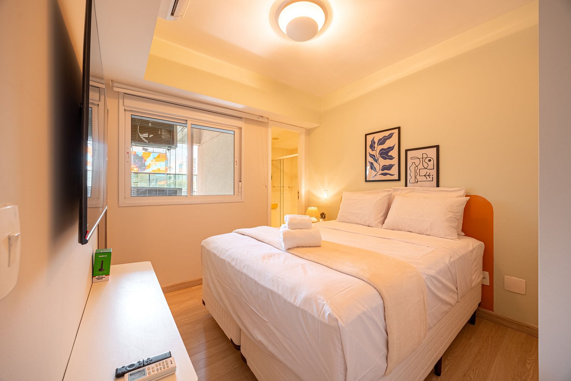 Suíte: cama Queen-size, TV, ar-condicionado, armários, espelho de corpo inteiro e banheiro privativo.