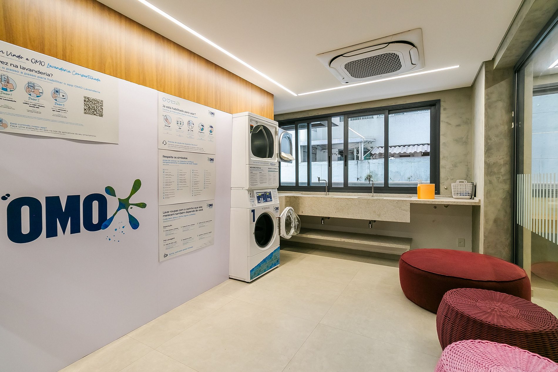O condomínio conta com portaria 24 horas, academia, lavanderia, piscina, e espaço de co-working
