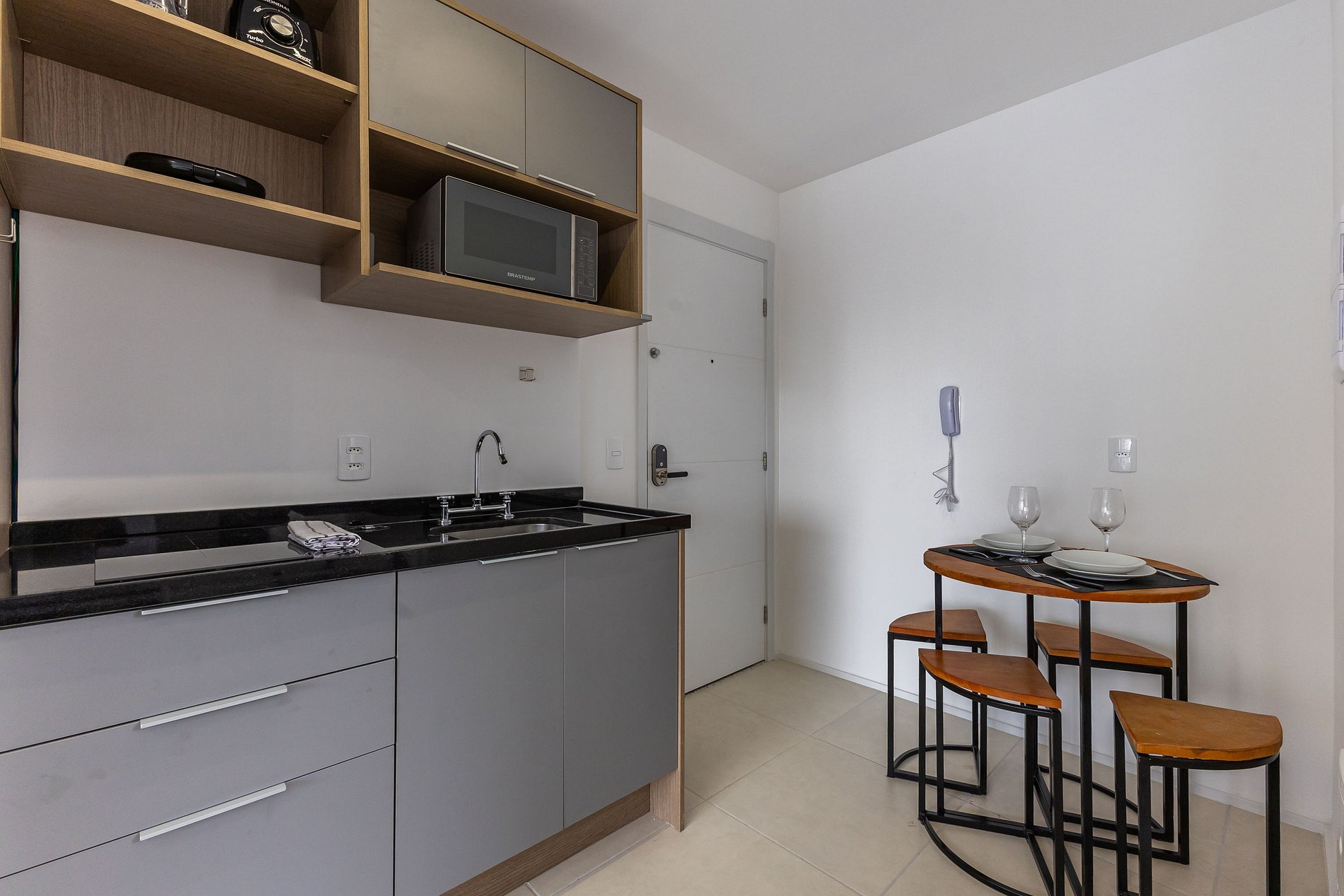 A cozinha equipada com itens básicos permite o preparo de pequenas refeições, garantindo mais autonomia no dia a dia.
