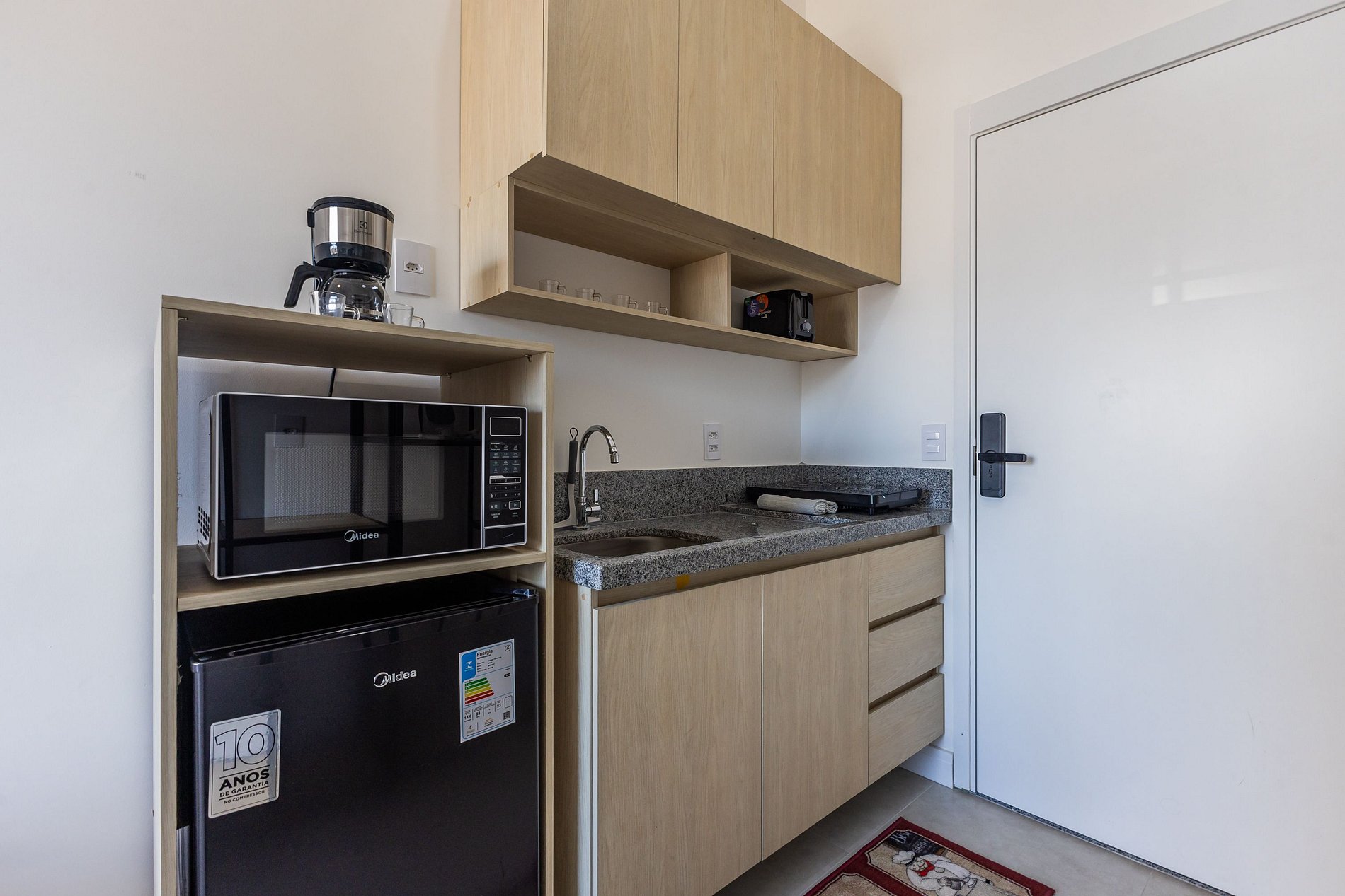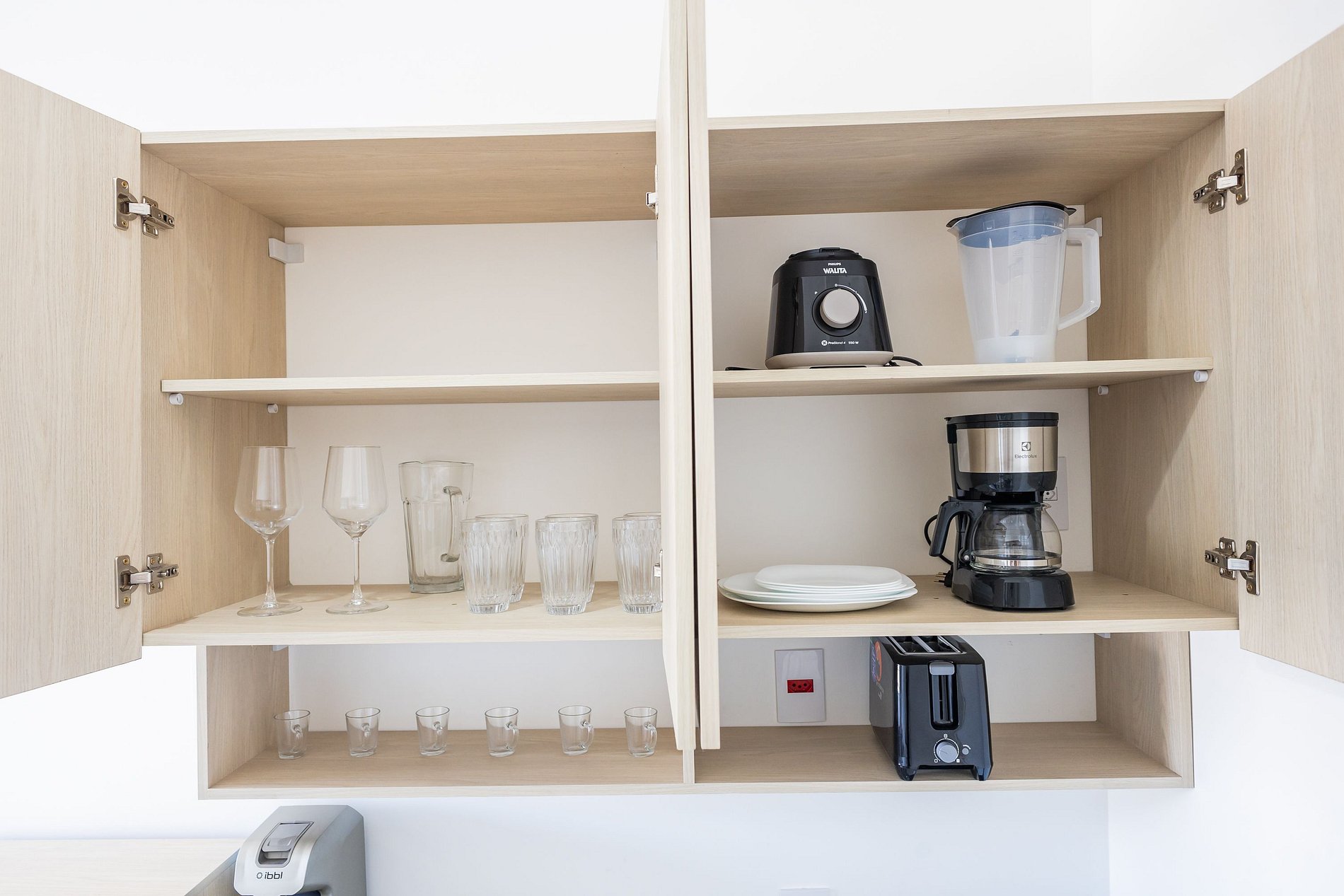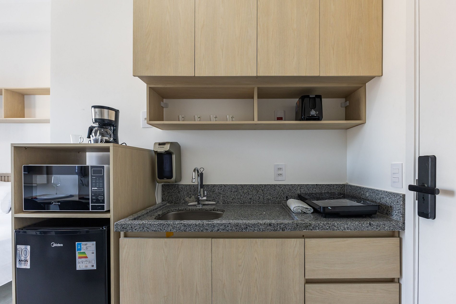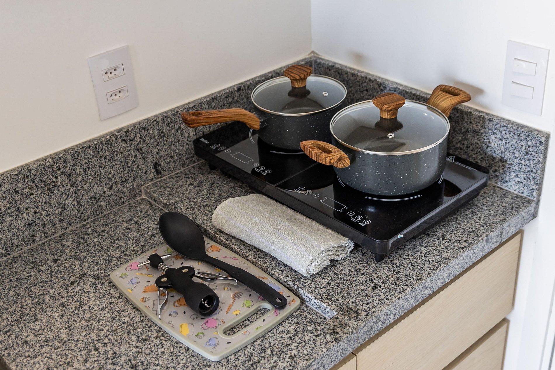 A cozinha equipada com itens básicos permite o preparo de pequenas refeições, garantindo mais autonomia no dia a dia.