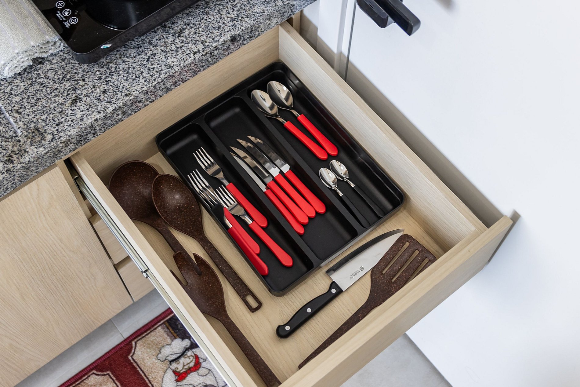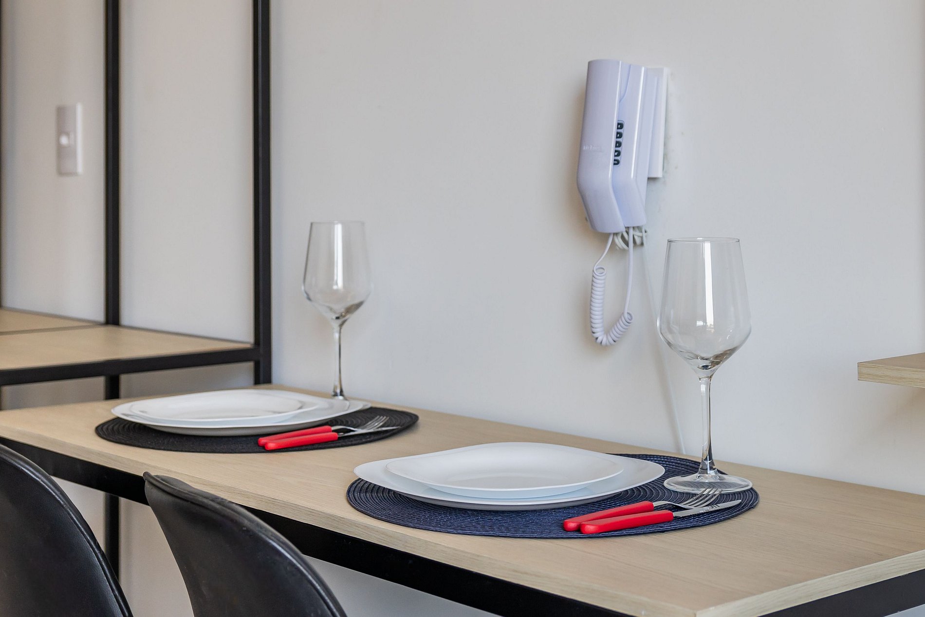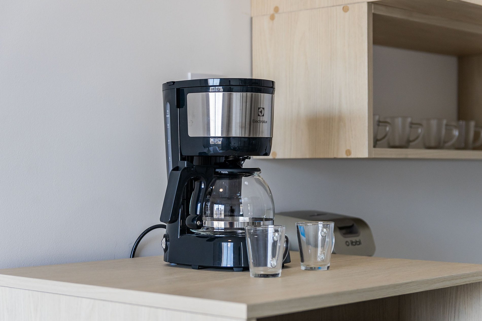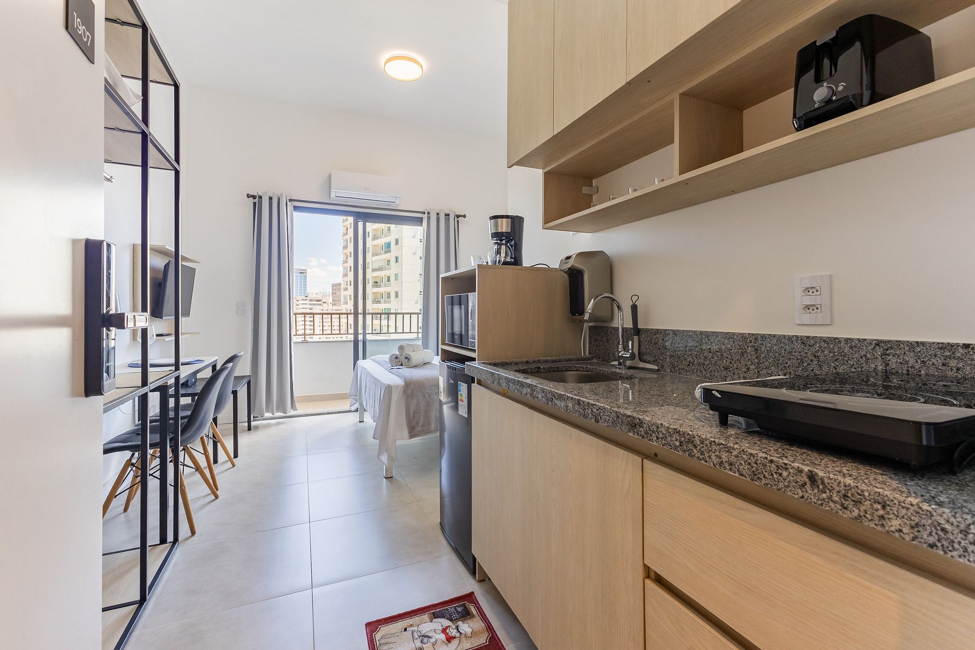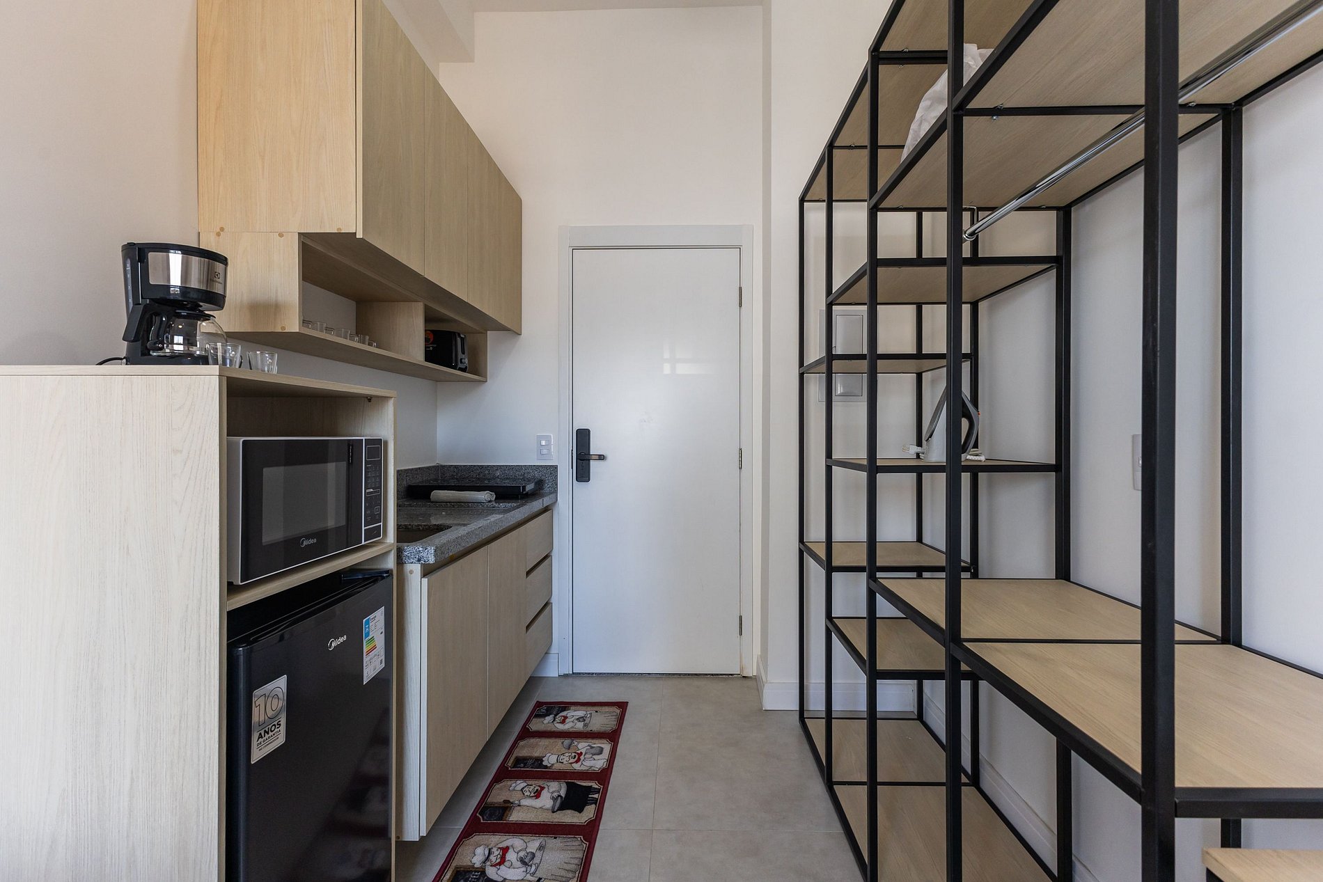A cozinha equipada com itens básicos permite o preparo de pequenas refeições, garantindo mais autonomia no dia a dia.