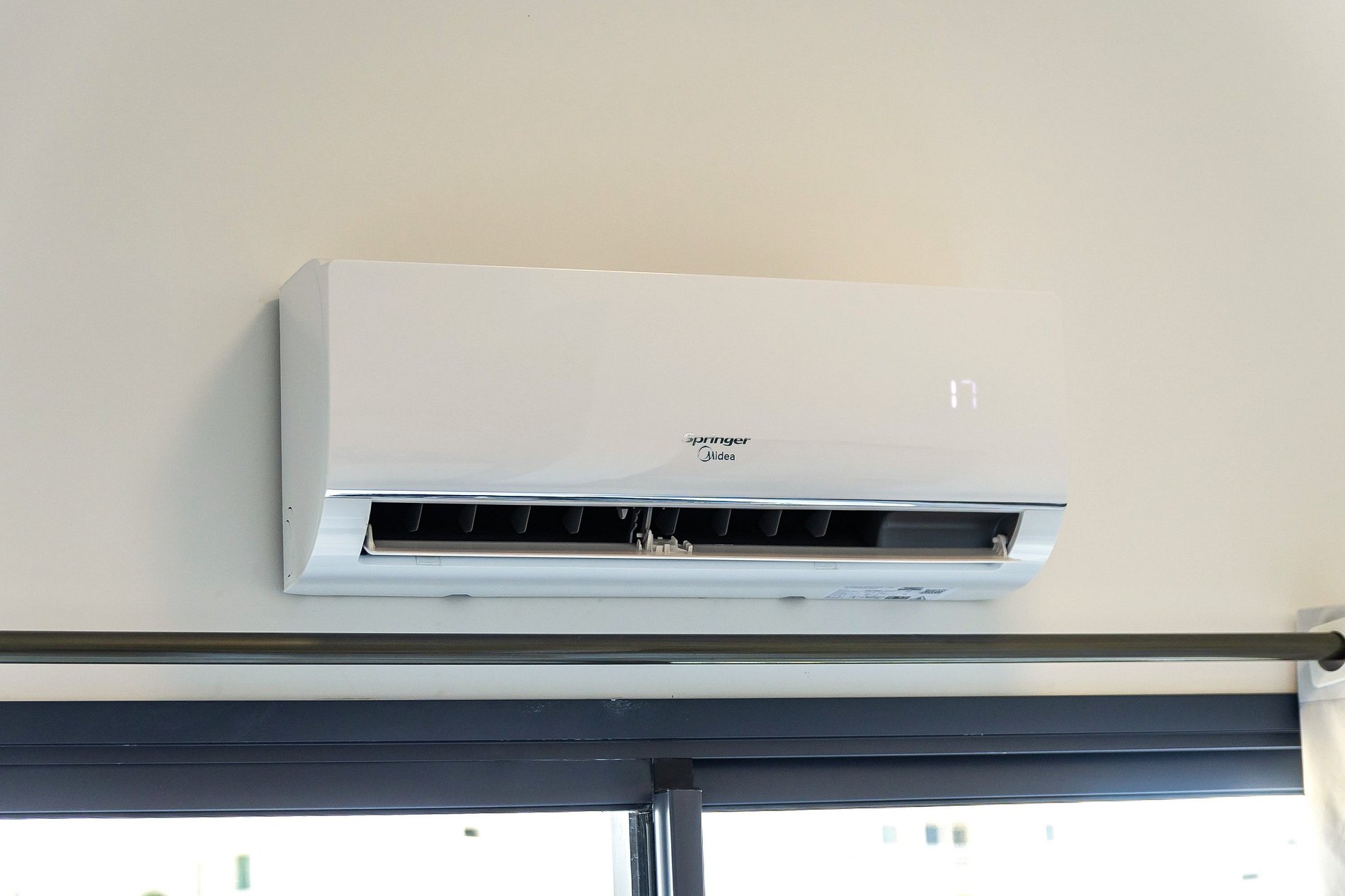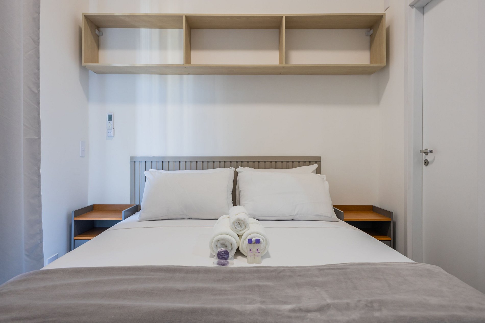 O apartamento também dispõe de ar-condicionado (somente refrigeração) e de uma varanda charmosa, que deixa o ambiente mais agradável com a entrada de luz natural.