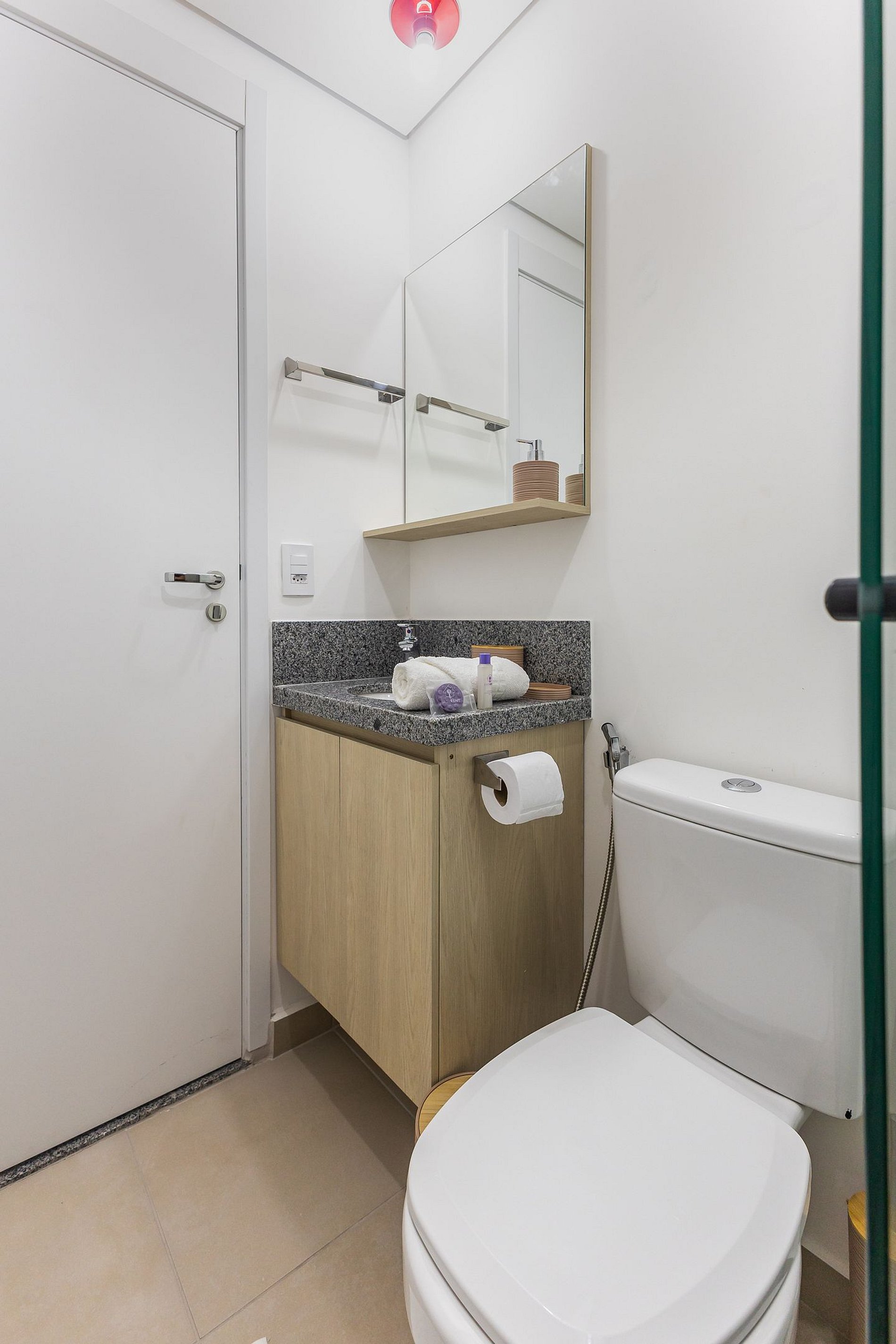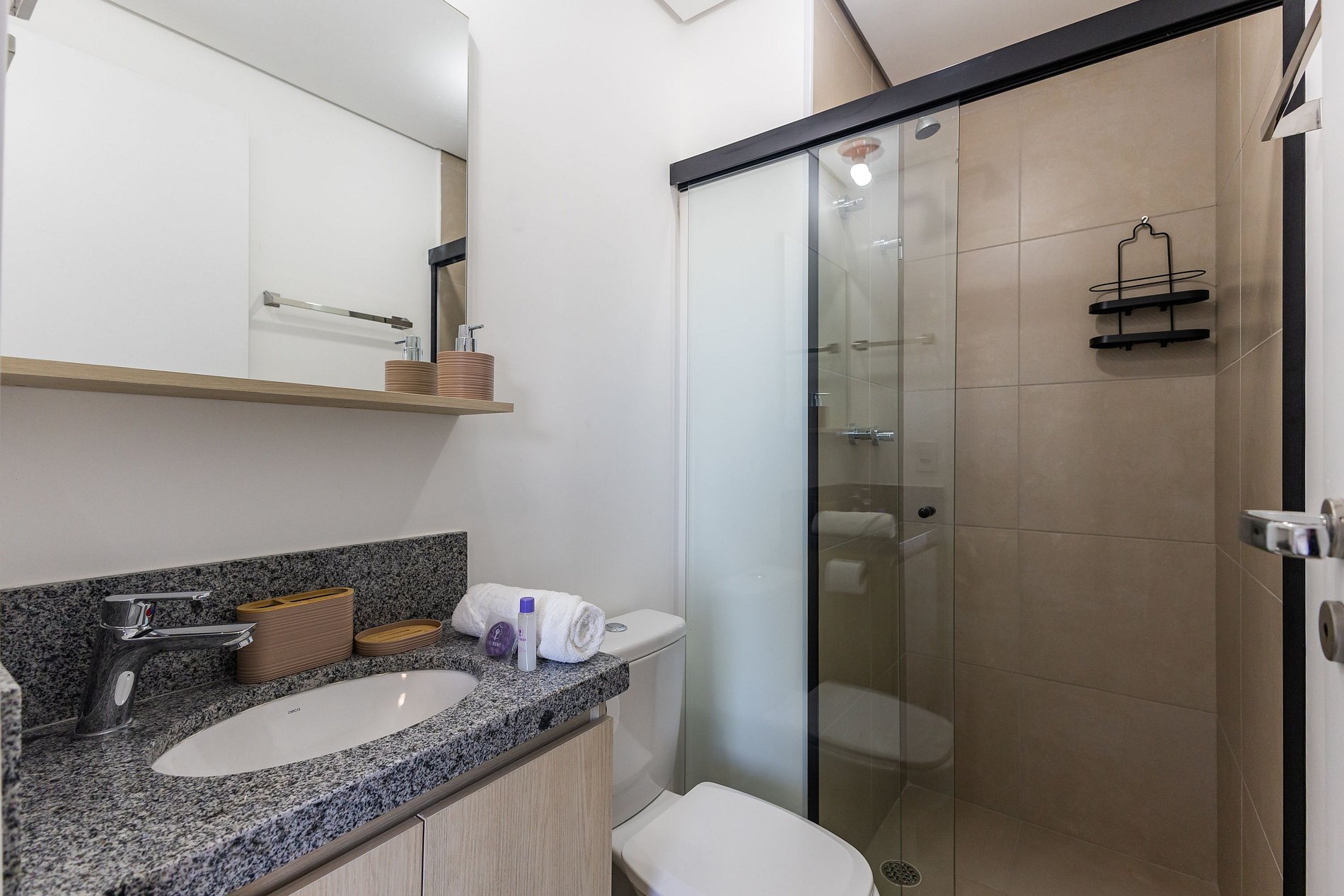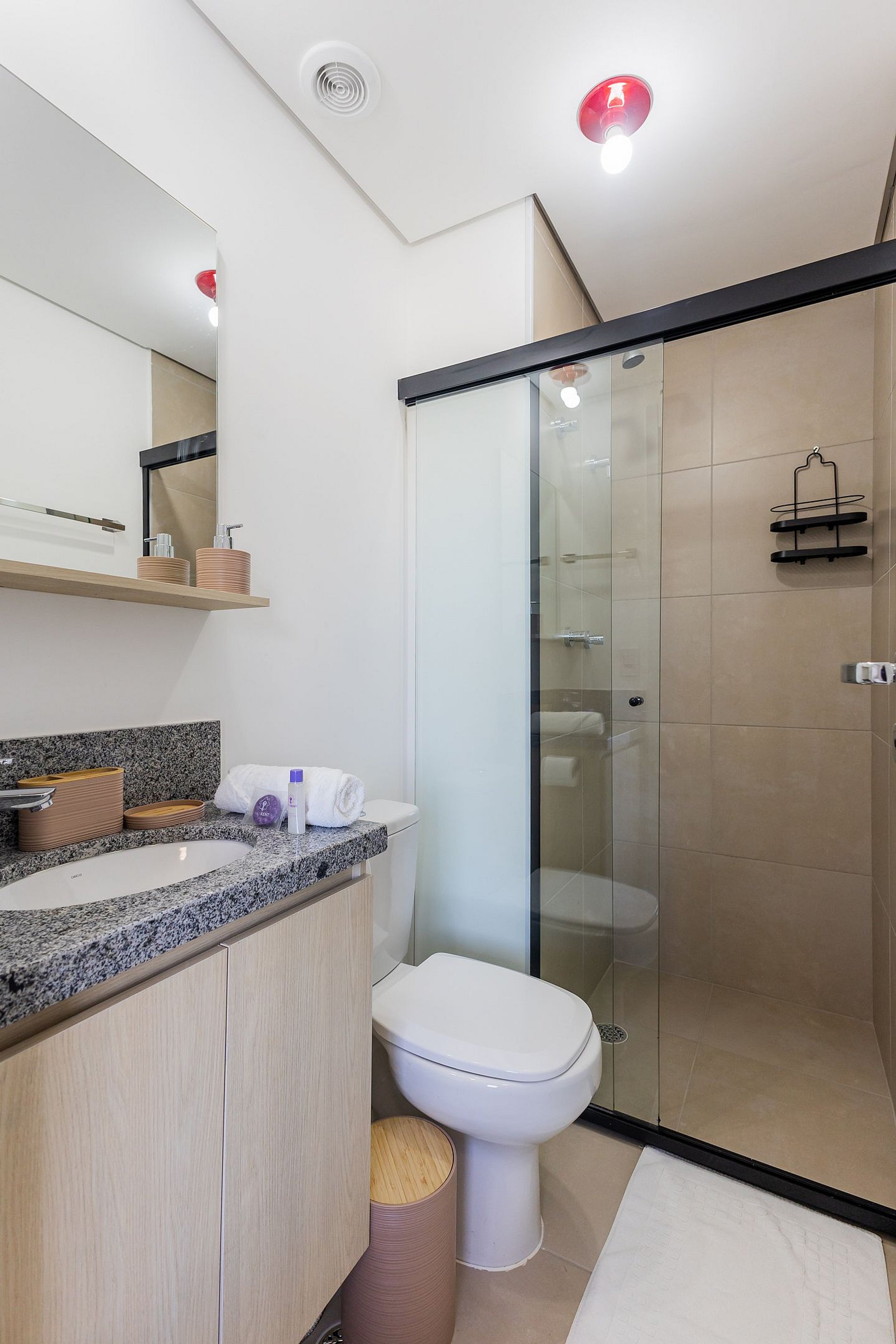 Por fim, o banheiro com secador de cabelo traz ainda mais praticidade para a sua rotina.