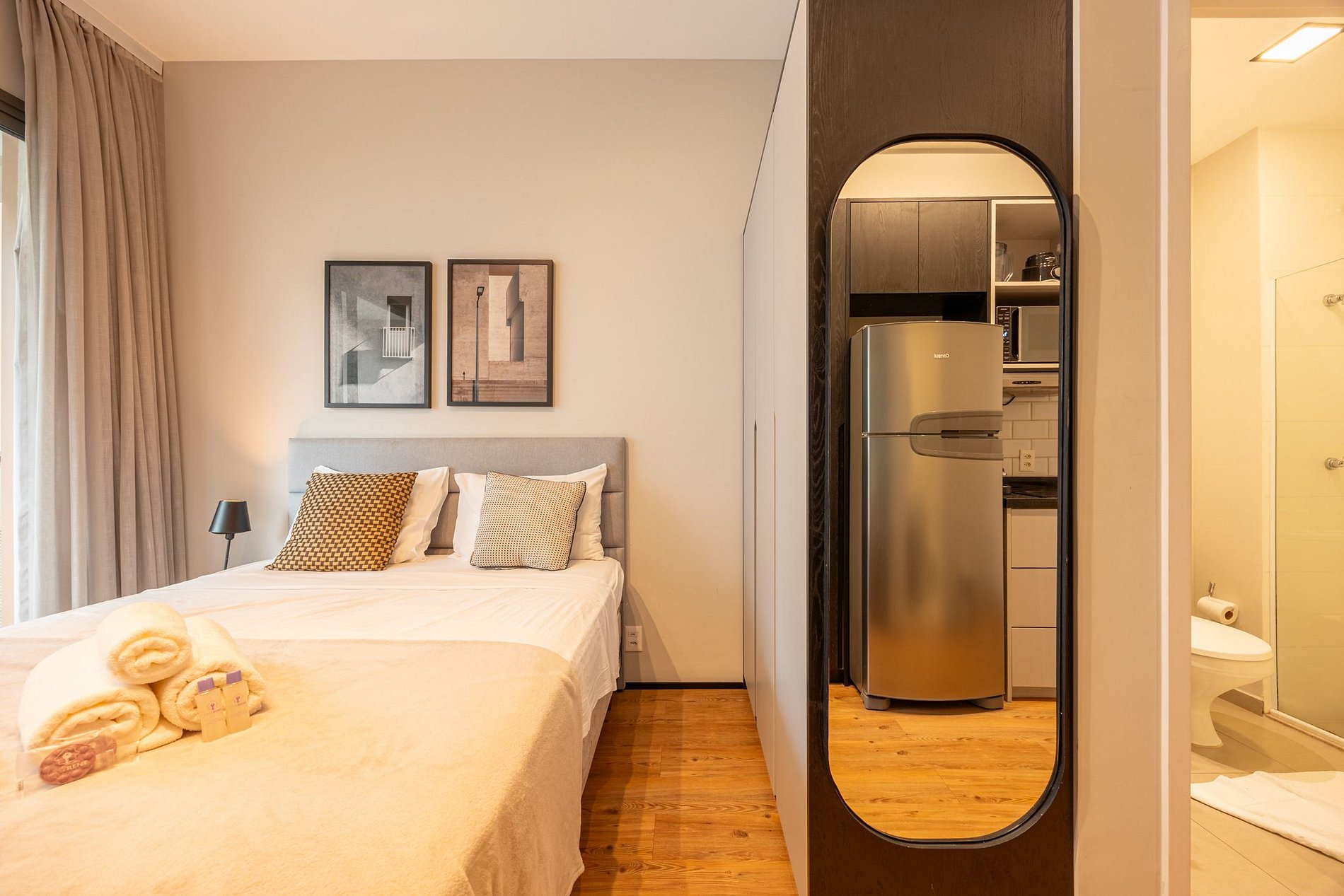Acomodando até duas pessoas, o espaço oferece uma cama queen-size e um enxoval de cama e banho fornecido no início da estadia, sem trocas ou reposições.