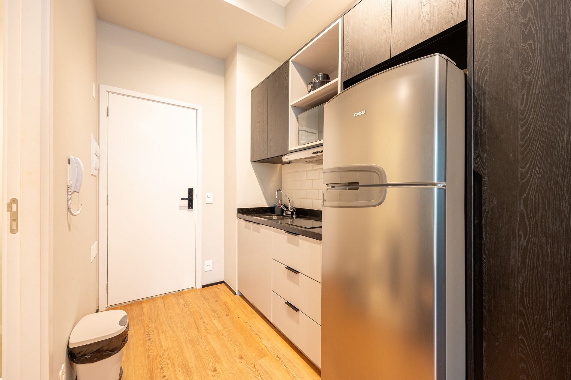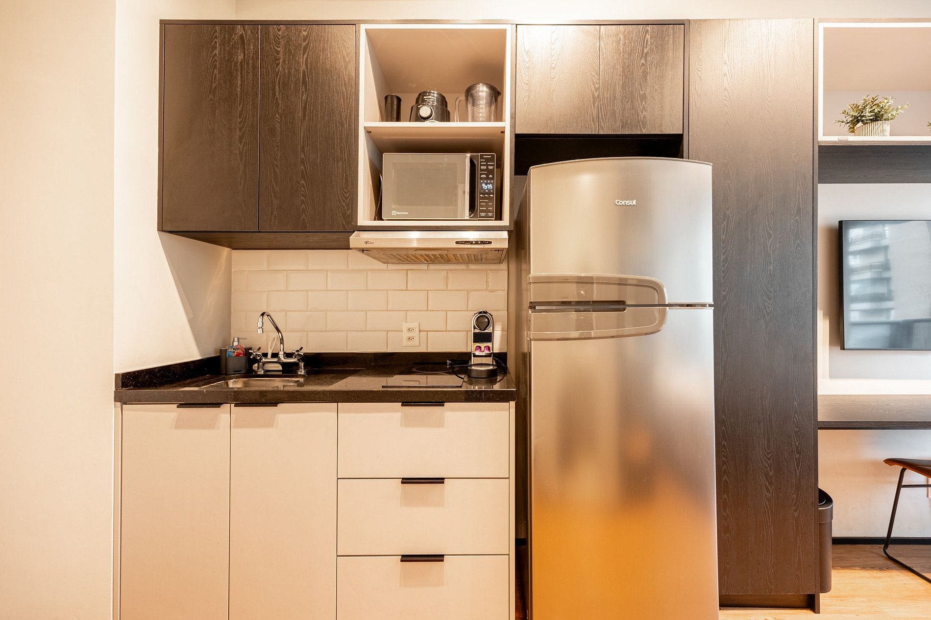 A cozinha equipada com itens básicos permite o preparo de pequenas refeições, garantindo mais autonomia no dia a dia.