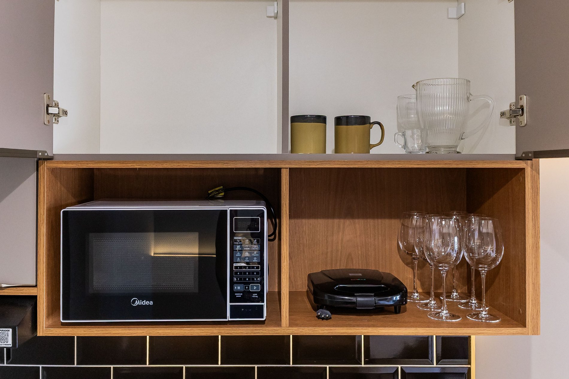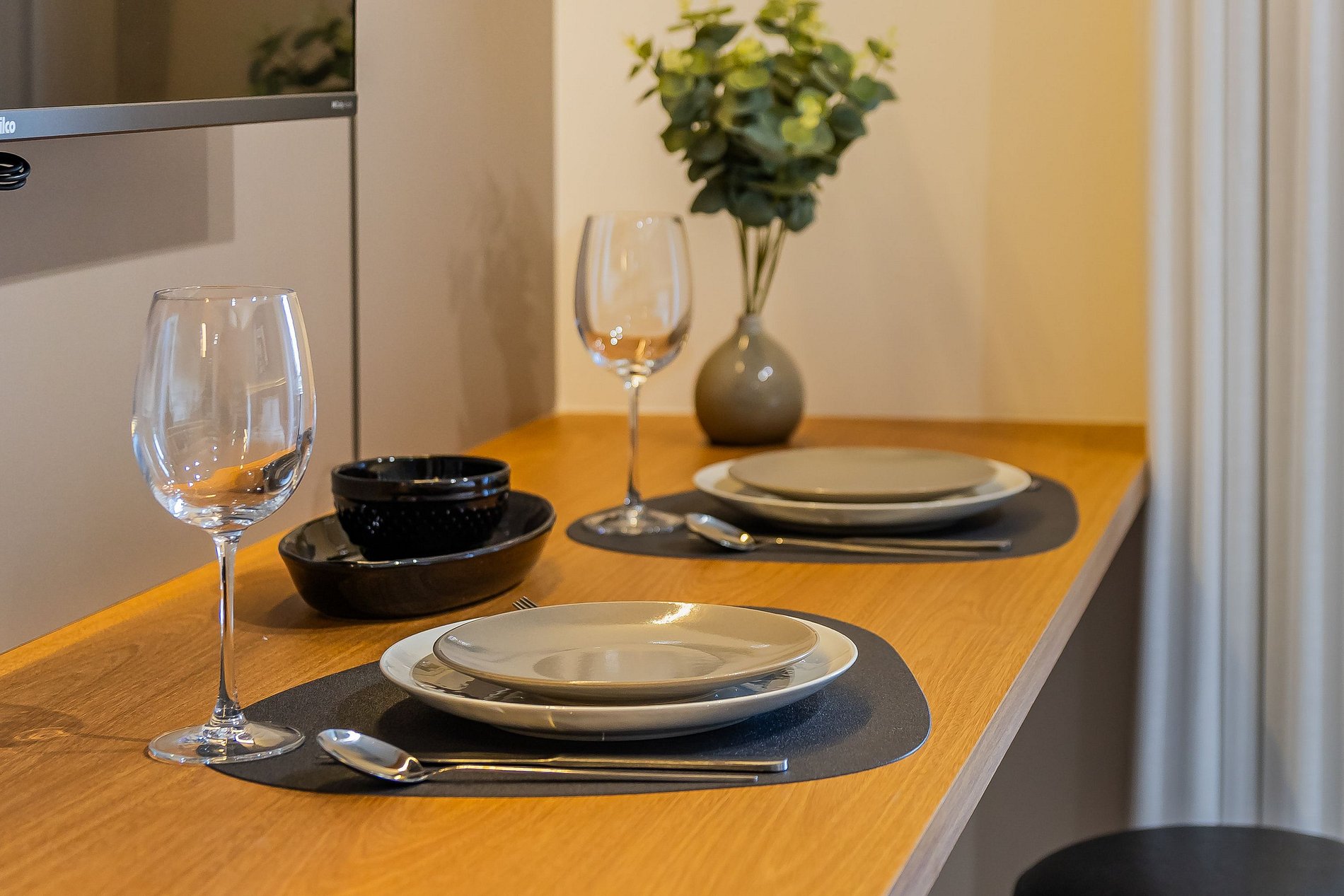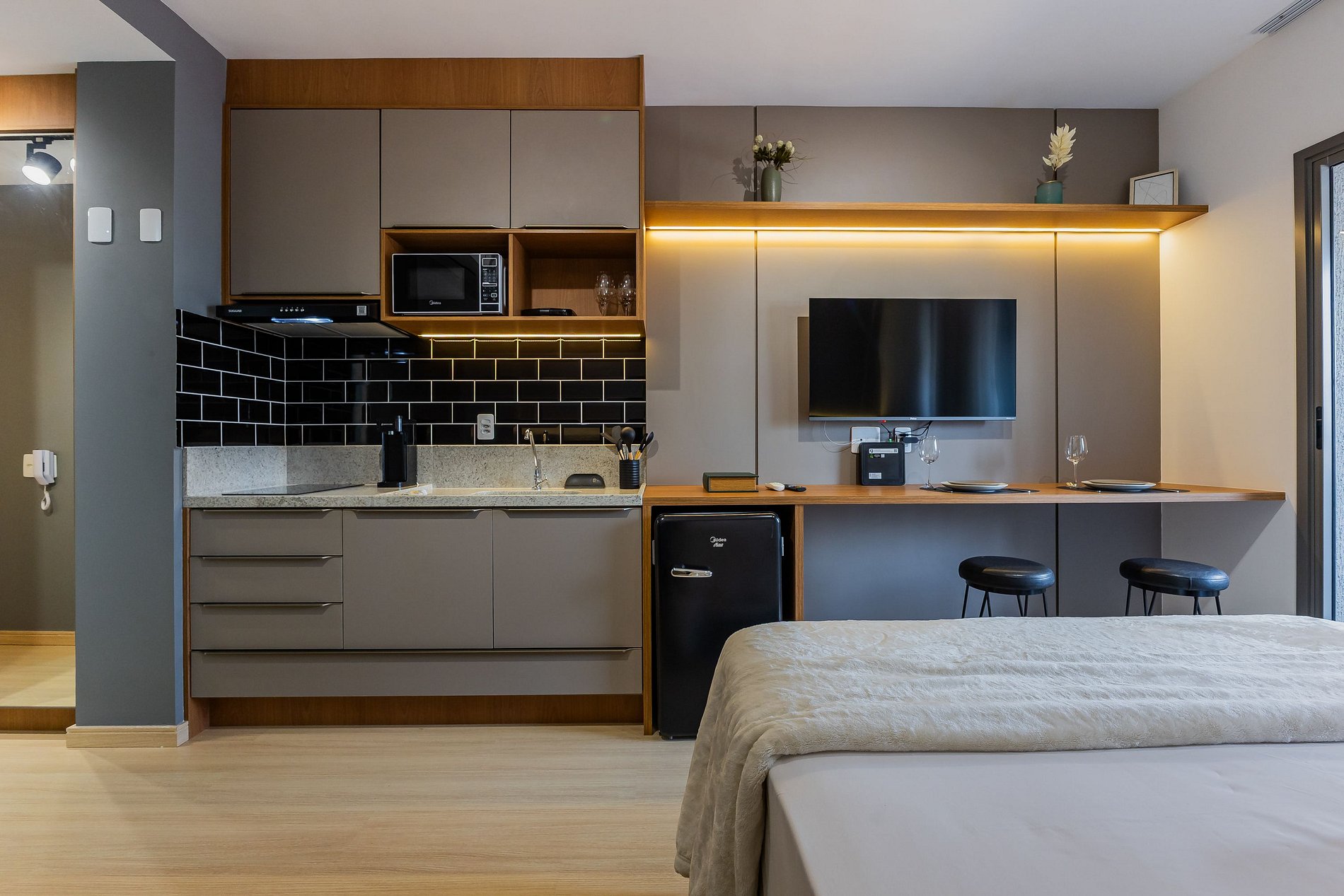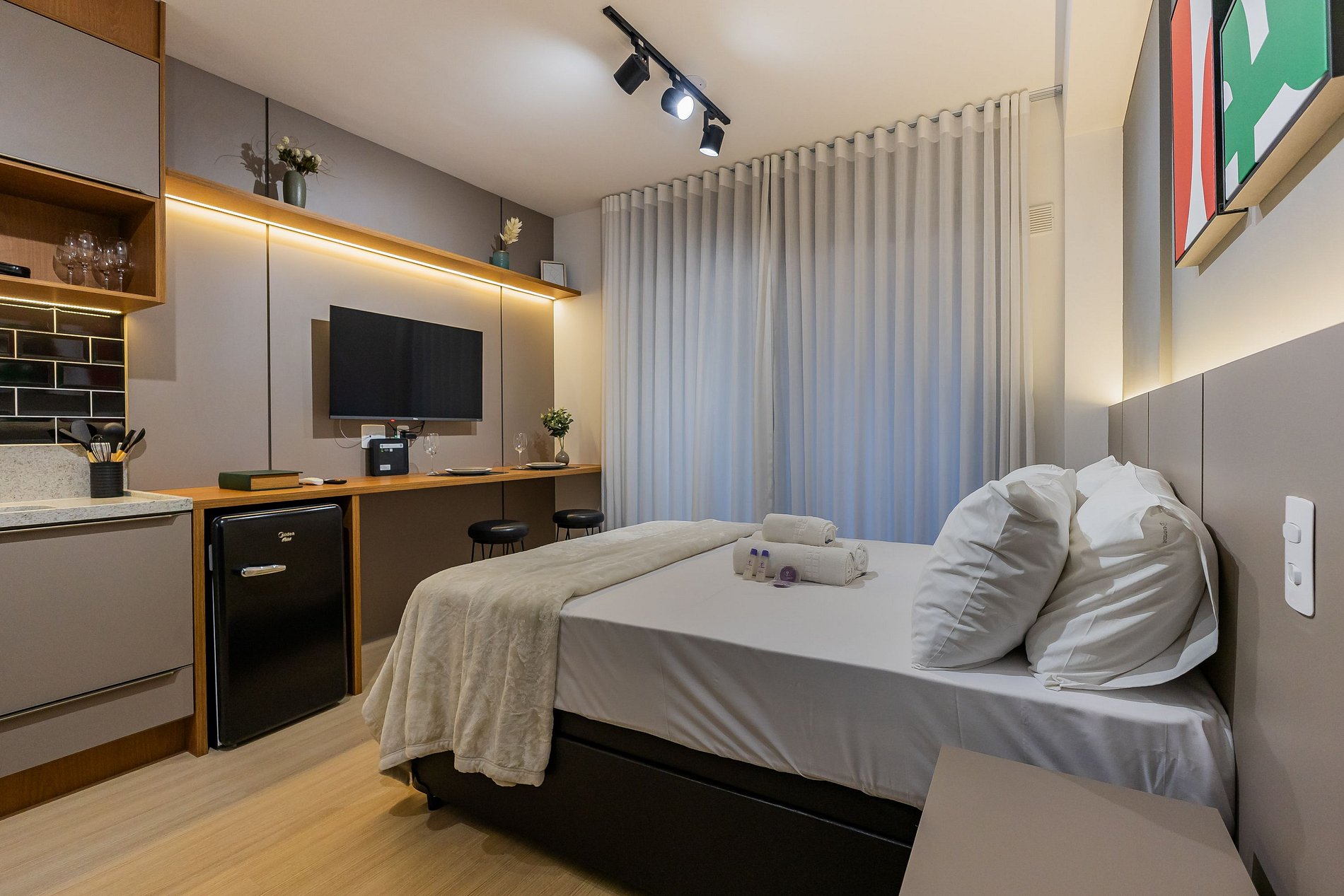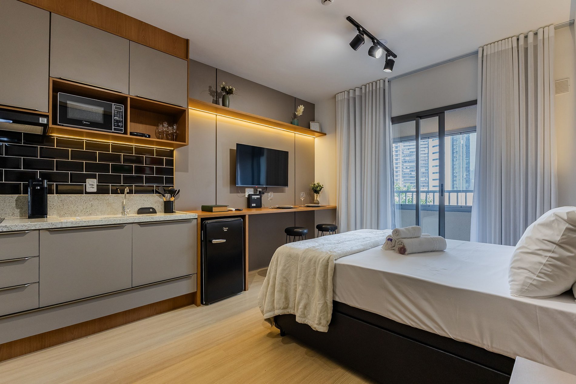 A cozinha equipada com itens básicos permite o preparo de pequenas refeições, garantindo mais autonomia no dia a dia. O apartamento também dispõe de ar-condicionado (somente refrigeração) e de uma varanda charmosa, que deixa o ambiente mais agradável com a entrada de luz natural.