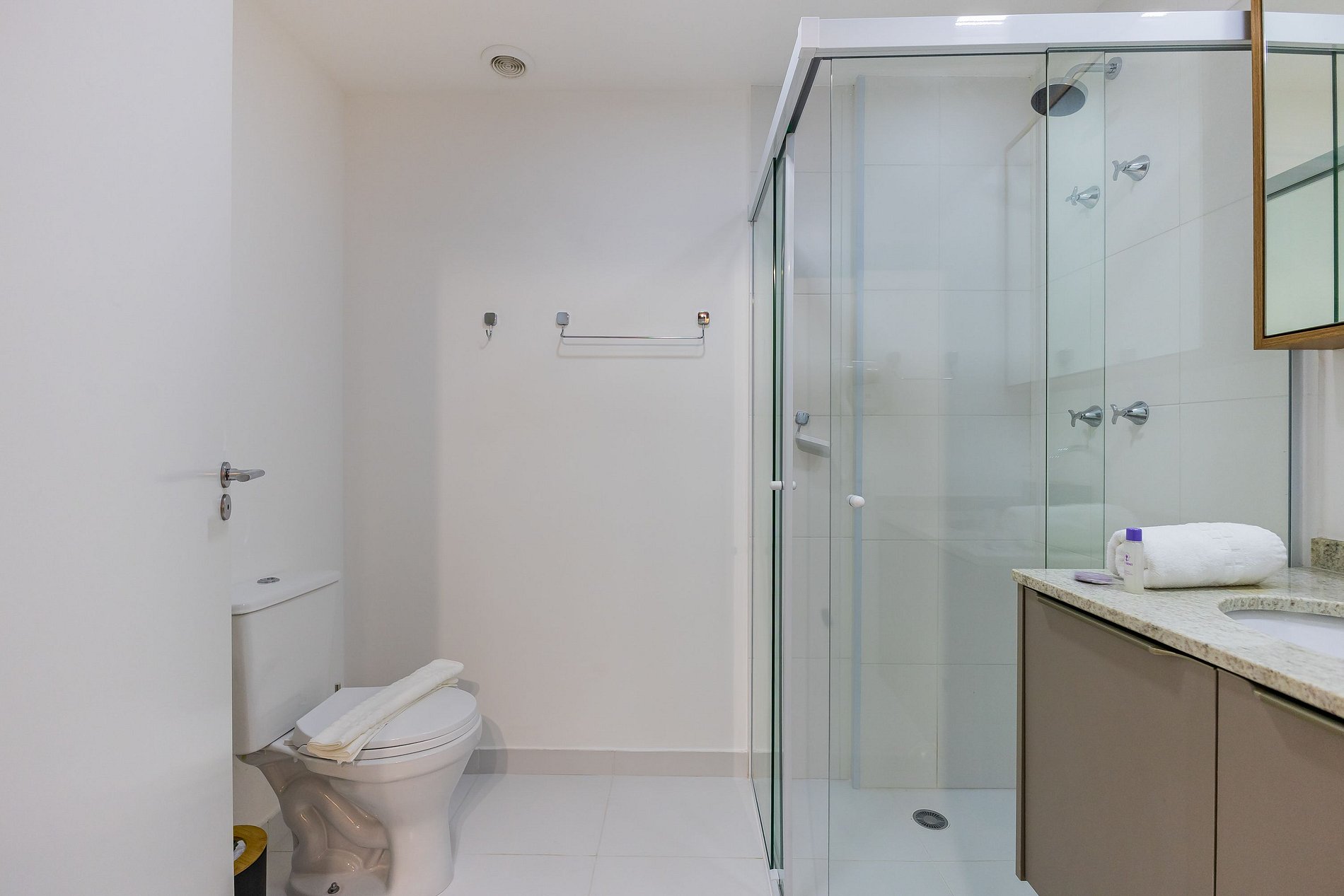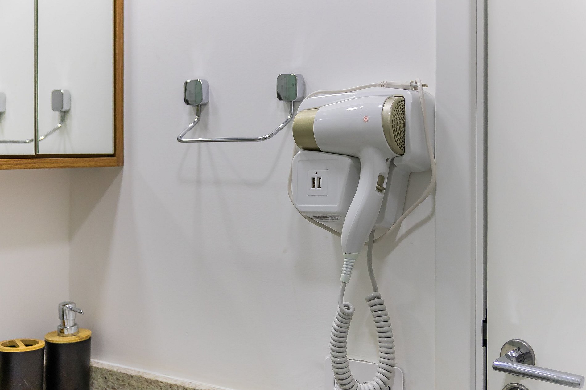 Por fim, o banheiro com secador de cabelo traz ainda mais praticidade para a sua rotina.