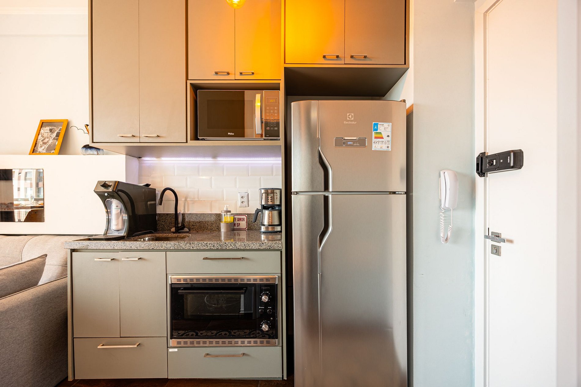 A cozinha equipada com itens básicos permite o preparo de pequenas refeições, garantindo mais autonomia no dia a dia.