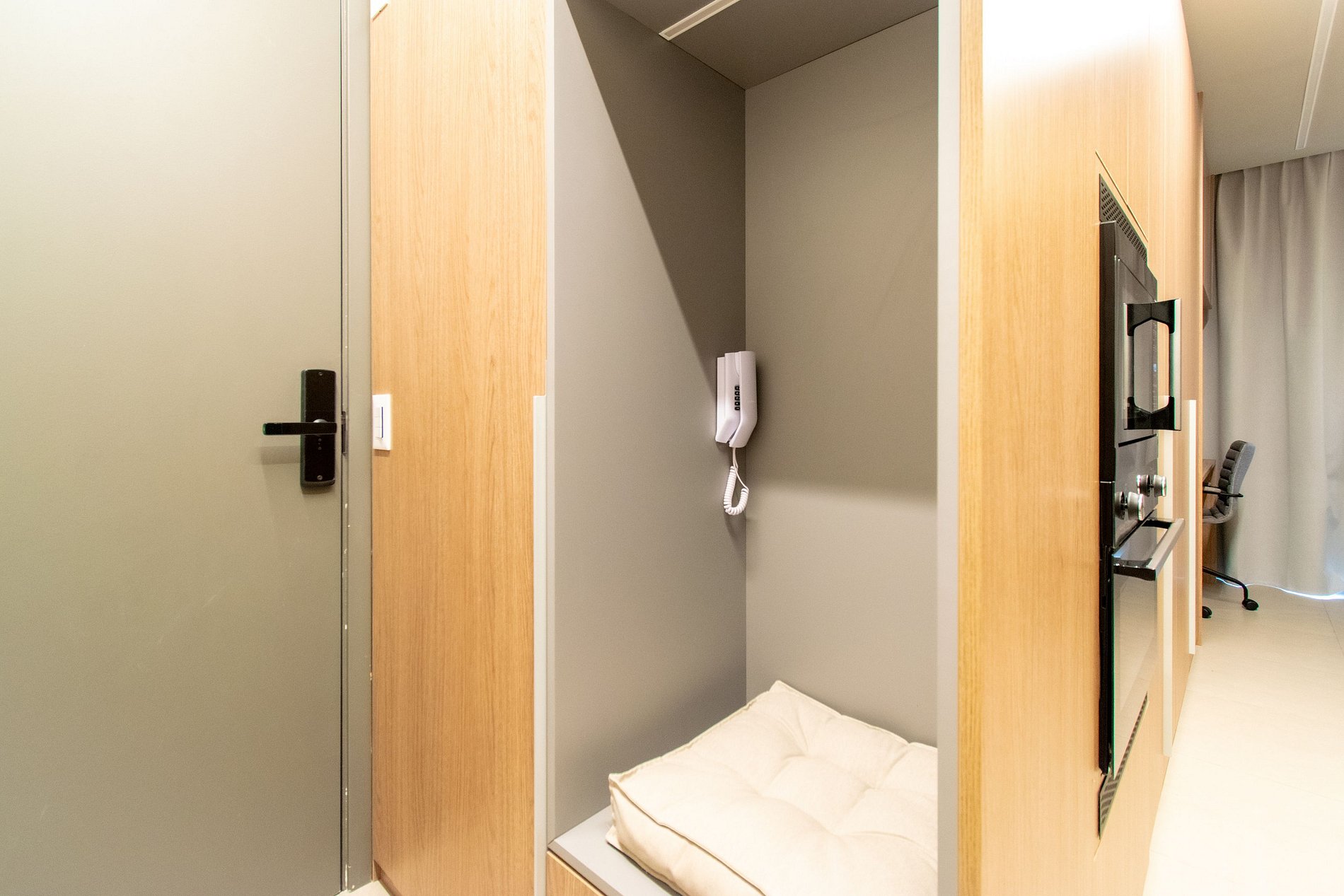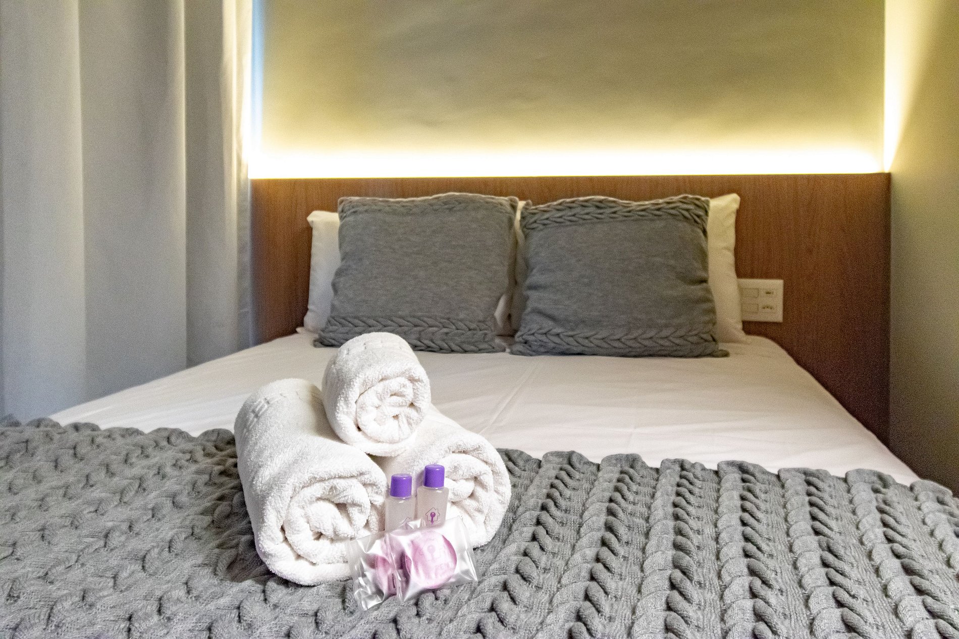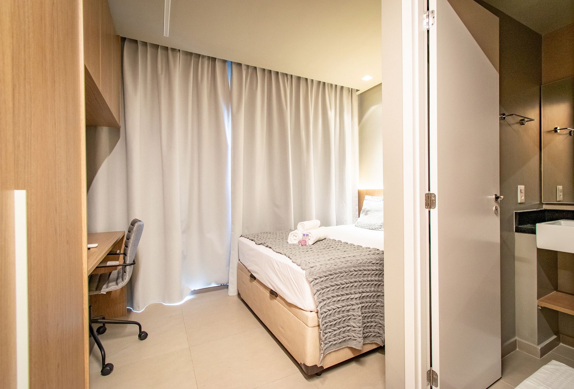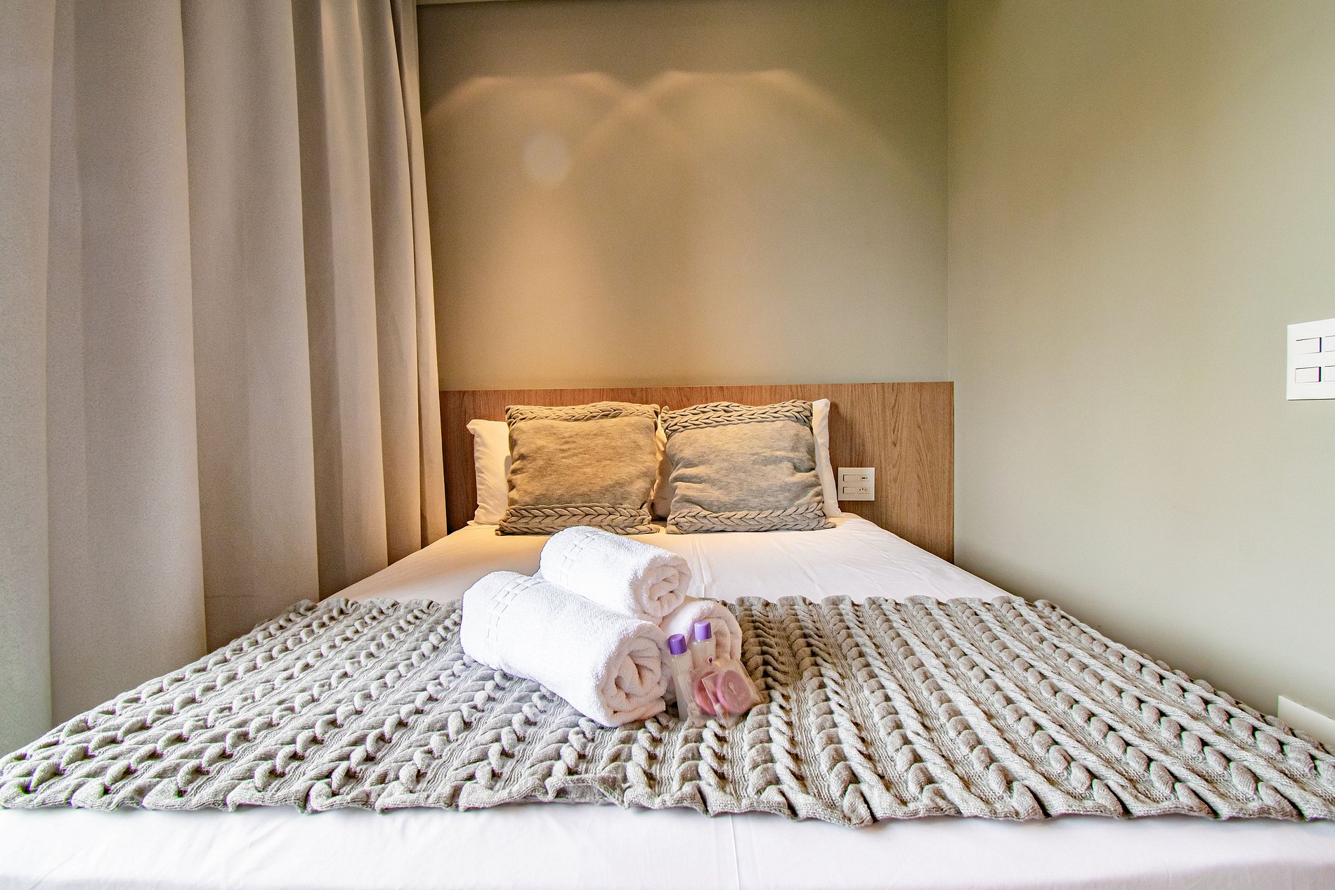 Acomodando até duas pessoas, o espaço oferece uma cama tamanho casal padrão e um enxoval de cama e banho fornecido no início da estadia, sem trocas ou reposições.