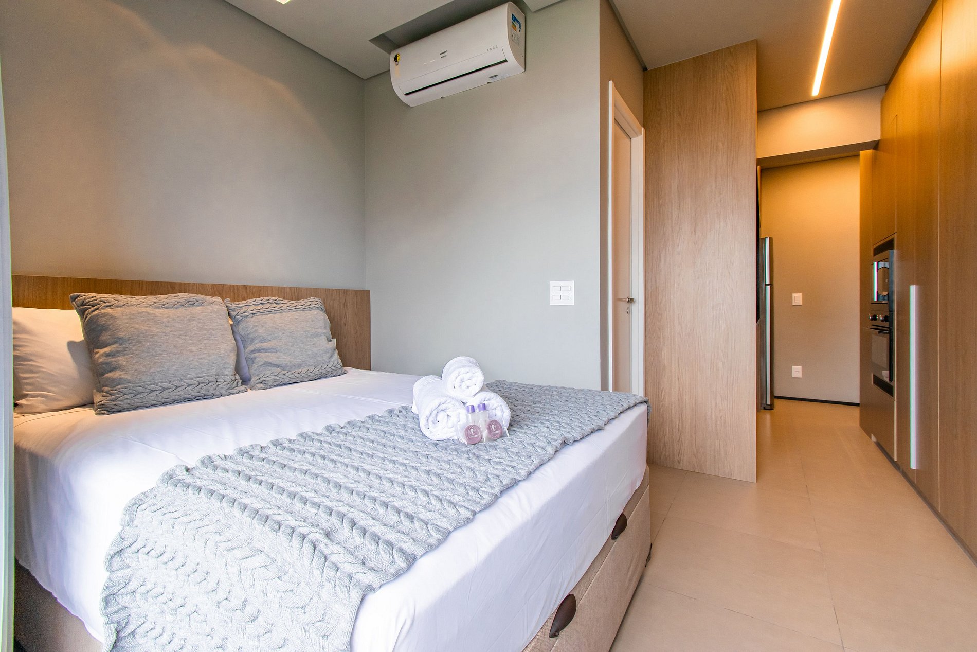 O apartamento também dispõe de ar-condicionado (somente refrigeração) e de uma varanda charmosa, que deixa o ambiente mais agradável com a entrada de luz natural.