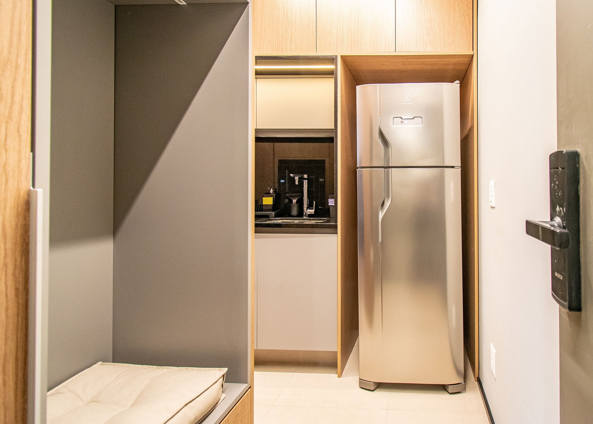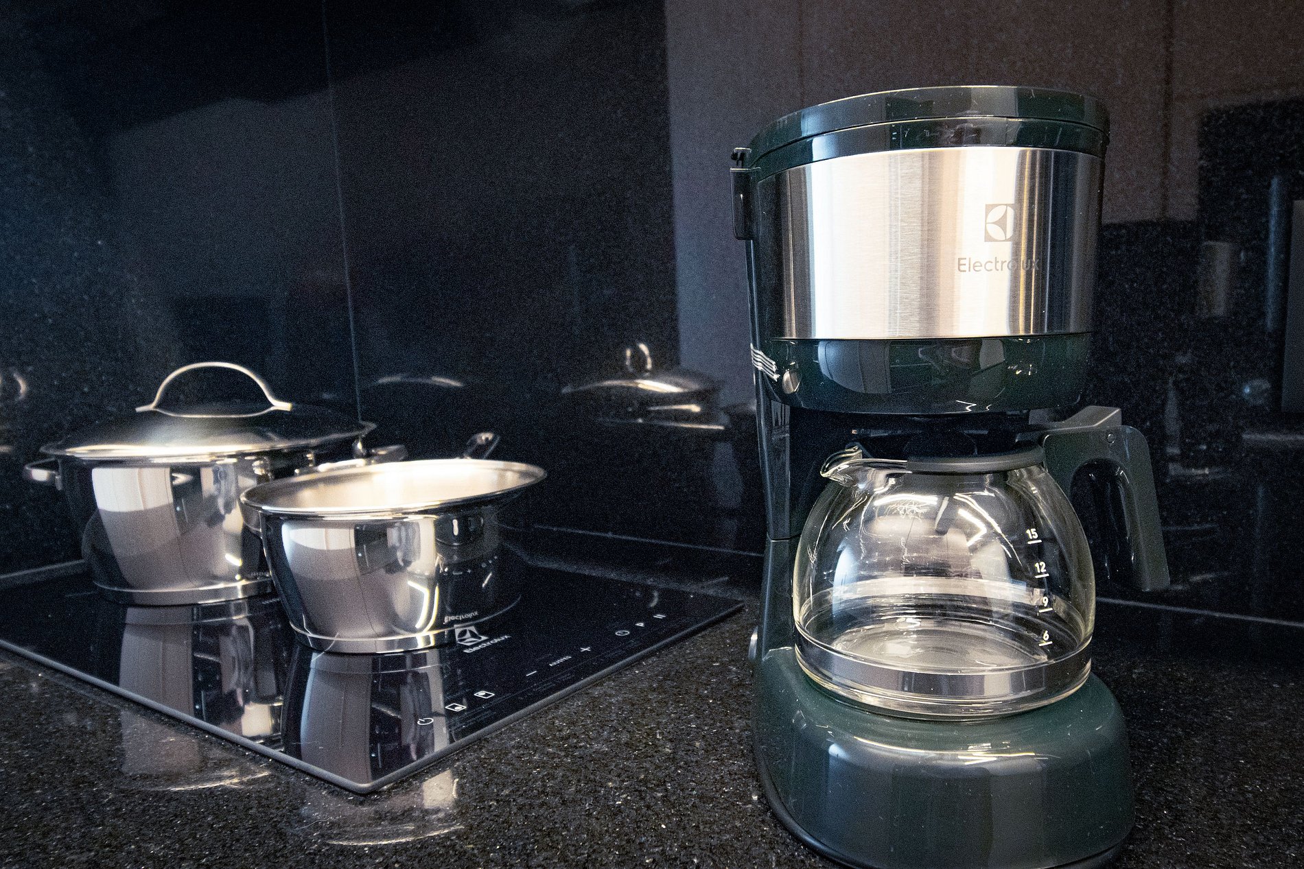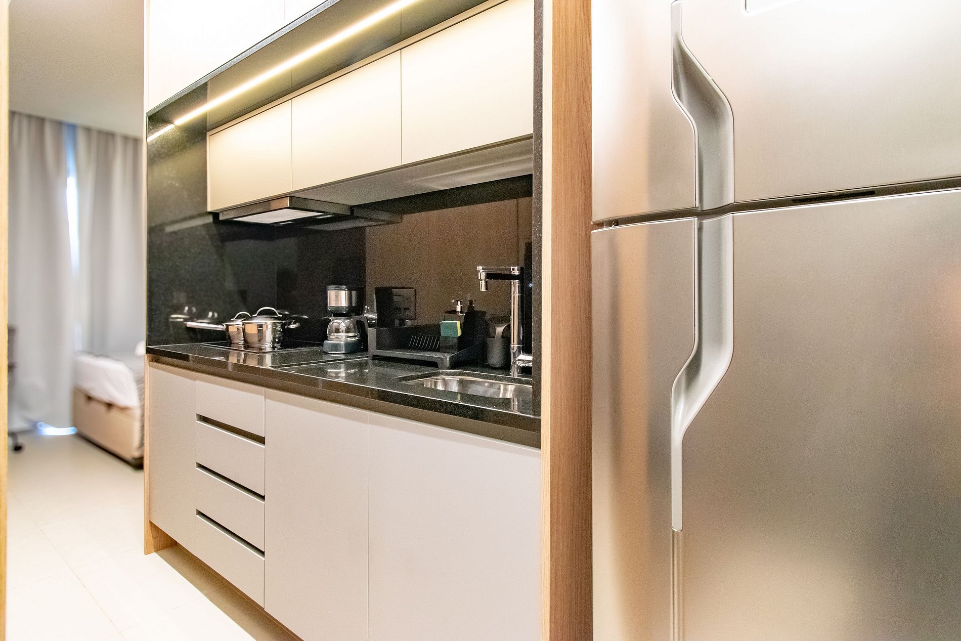 A cozinha equipada com itens básicos permite o preparo de pequenas refeições, garantindo mais autonomia no dia a dia.