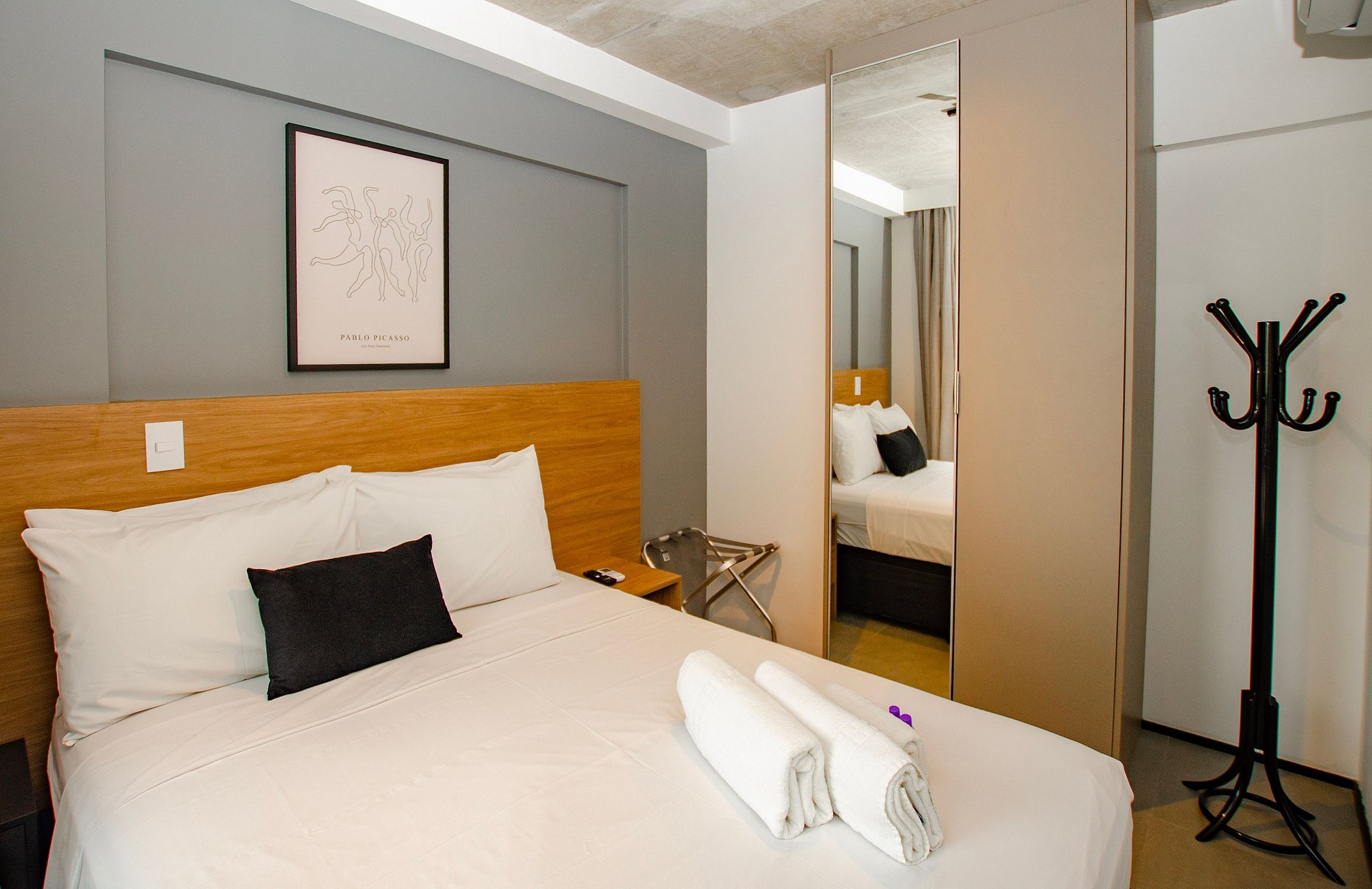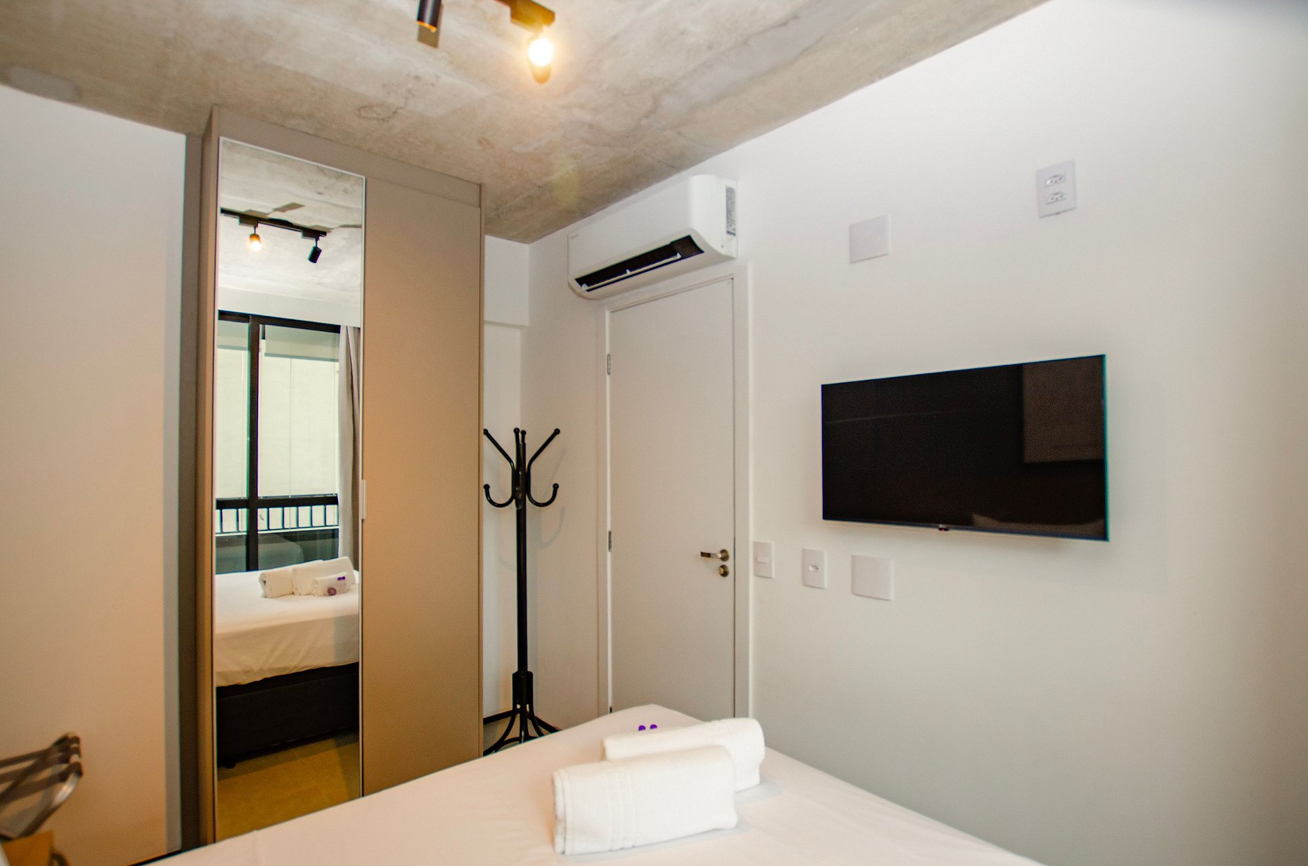 Quarto 1 - Cama de casal, armário com espelho de corpo todo, ar-condicionado, cortina blackout e varanda.