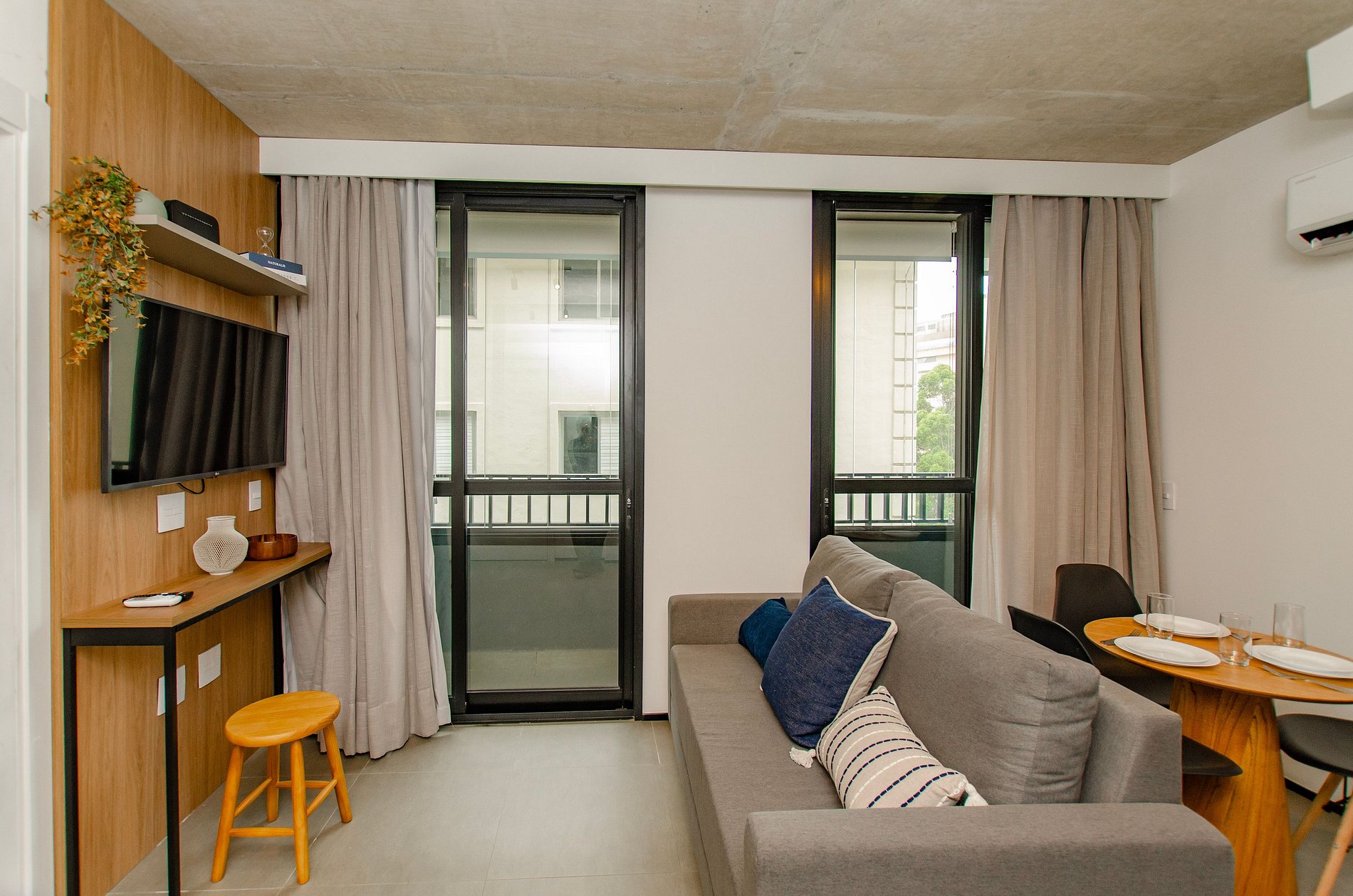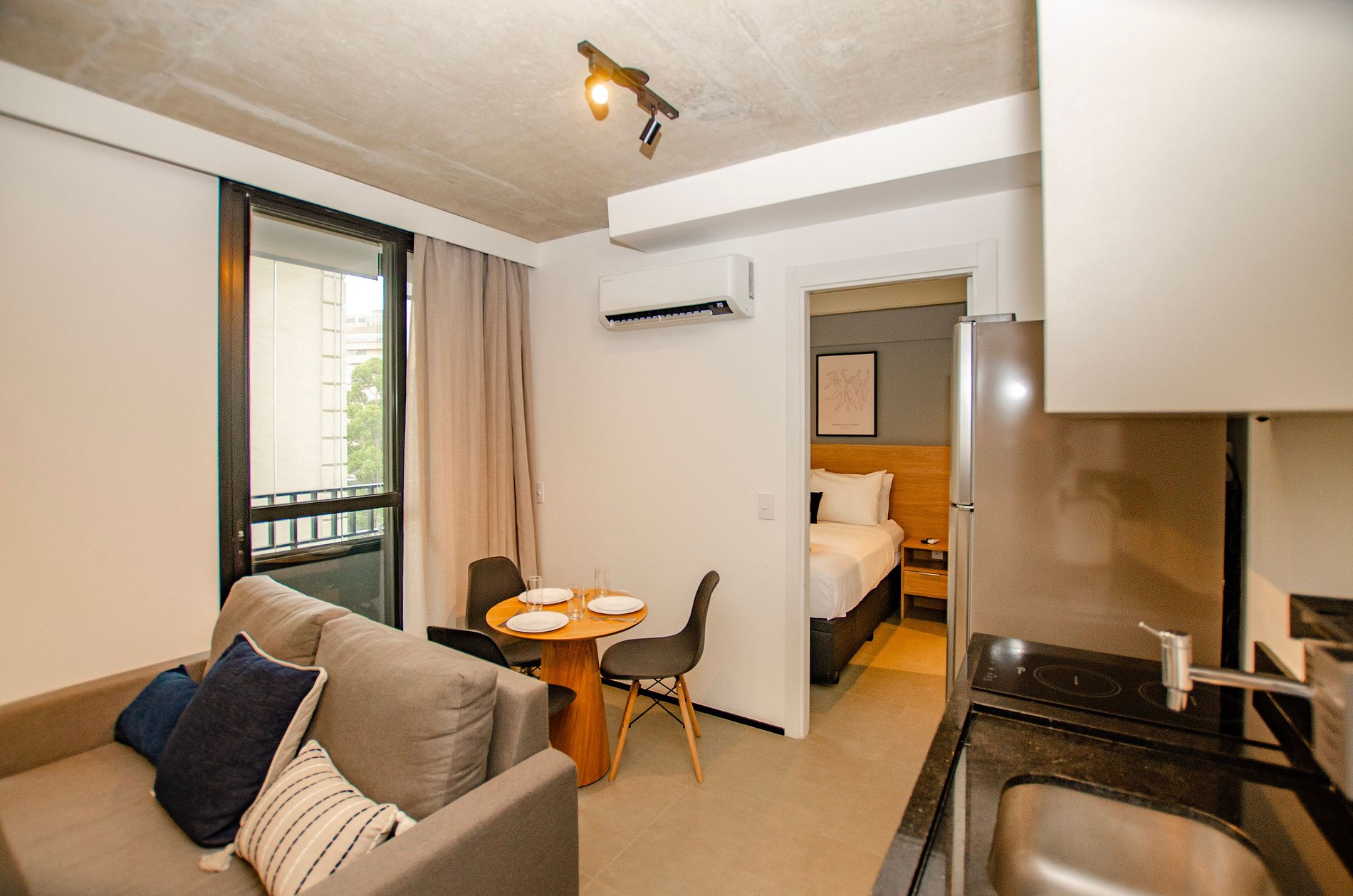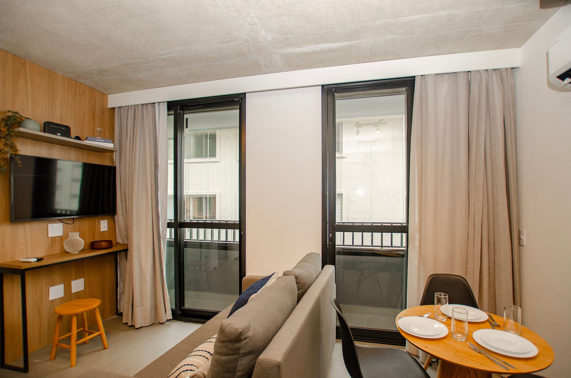 Sala: Sofá cama tamanho casal, ar-condicionado, cortina blackout e varanda.